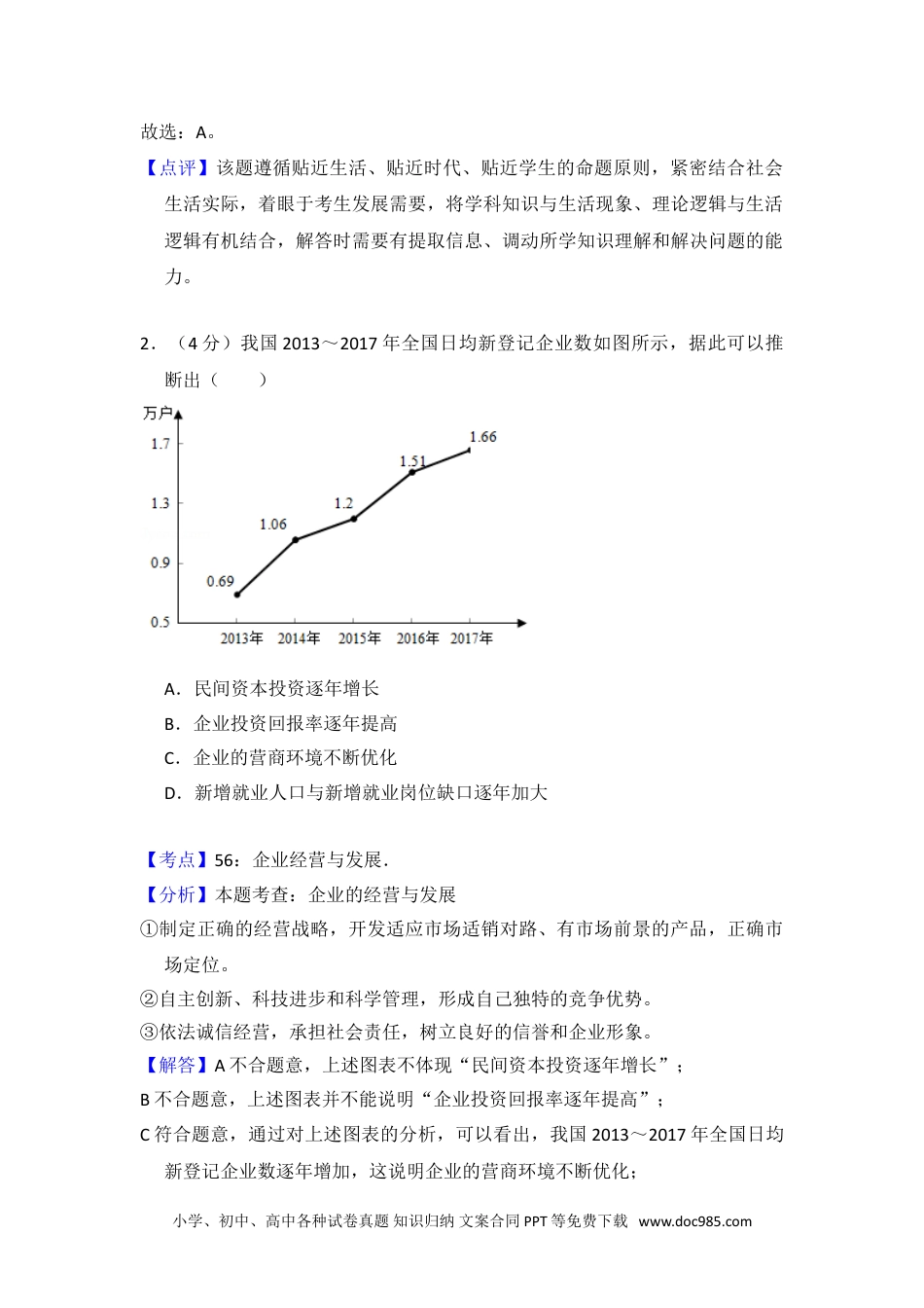 2018年全国统一高考政治试卷(新课标Ⅲ)参考答案与试题解析一、选择题:本题共12题,每小题4分,共48分.在每小题给出的四个选项中,只有一项是符合题目要求的.1.(4分)随着智能手机的功能越来越强大,MP3(音乐播放器)、电子词典、掌上游戏机等电子产品正慢慢淡出人们的视野。这说明()①市场竞争导致商品优胜劣汰②商品使用价值会影响人的消费选择③功能不同的商品会相互替代④商品使用价值因替代品出现而减小A.①②B.①③C.②④D.③④【考点】12:商品的基本属性;28:价值规律的调节作用.菁优网版权所有【分析】本题考查:价值规律的调节作用;商品的基本属性1.价值规律的调节作用①调节社会劳动力和生产资料在各个部门的分配,调节生产和流通。②可以促使企业开展竞争,实现优胜劣汰。③可以激励企业和劳动者的生产积极性,使经济具有生机和活力。2.商品的基本属性使用价值和价值是商品的两个基本属性。使用价值是指商品能够满足人们某种需要的属性。价值是指凝结在商品中的无差别的人类劳动。商品是使用价值和价值的统一体。【解答】①②符合题意,“随着智能手机的功能越来越强大,MP3、电子词典、掌上游戏机等电子产品正慢慢淡出人们的视野。”这说明市场竞争导致商品优胜劣汰,商品使用价值会影响人的消费选择;③表述错误,功能相同、相近的商品会相互替代;④表述错误,商品使用价值不会因替代品出现而减小。小学、初中、高中各种试卷真题知识归纳文案合同PPT等免费下载www.doc985.com故选:A。【点评】该题遵循贴近生活、贴近时代、贴近学生的命题原则,紧密结合社会生活实际,着眼于考生发展需要,将学科知识与生活现象、理论逻辑与生活逻辑有机结合,解答时需要有提取信息、调动所学知识理解和解决问题的能力。2.(4分)我国2013~2017年全国日均新登记企业数如图所示,据此可以推断出()A.民间资本投资逐年增长B.企业投资回报率逐年提高C.企业的营商环境不断优化D.新增就业人口与新增就业岗位缺口逐年加大【考点】56:企业经营与发展.菁优网版权所有【分析】本题考查:企业的经营与发展①制定正确的经营战略,开发适应市场适销对路、有市场前景的产品,正确市场定位。②自主创新、科技进步和科学管理,形成自己独特的竞争优势。③依法诚信经营,承担社会责任,树立良好的信誉和企业形象。【解答】A不合题意,上述图表不体现“民间资本投资逐年增长”;B不合题意,上述图表并不能说明“企业投资回报率逐年提高”;C符合题意,通过对上述图表的分析,可以看出,我国2013~2017年全国日均新登记企业数逐年增加,这说明企业的营商环境不断优化;小学、初中、高中各种试卷真题知识归纳文案合同PPT等免费下载www.doc985.comD不合题意,上述图表并不能说明新增就业岗位缺口逐年加大。故选:C。【点评】本题是图表类选择题,覆盖面广、信息量大,考核同学们获取和解读信息、调动和运用知识等能力,是高考选择题常见题型之一。解题的关键是,一方面要把图表信息准确地转化为文字信息,另一方面要对题肢是否符合试题意图作出判断。3.(4分)中央《关于完善农村土地所有权承包权经营权分置办法的意见》提出,实行农村土地所有权、承包权、经营权分置并行,着力推进农业现代化。“三权分置”改革对推进农业现代化的影响路径是()①实现土地的适度规模经营②促进土地经营权合理流转③提高农业生产率④明晰土地产权关系A.①→②→④→③B.③→④→②→①C.④→②→①→③D.④→①→②→③【考点】8N:农业现代化和三农问题.菁优网版权所有【分析】本题考查:农业现代化和三农问题实行“三权分置”改革,推进农村土地的所有权、承包权和经营权三项权利分置进行的一系列制度改革,有利于明晰土地产权关系,提高土地资源利用效率,促进农民增收,推动现代农业发展。【解答】C符合题意,实行“三权分置”改革,进一步④明晰土地产权关系,能够②促进土地经营权合理流转,①实现土地的适度规模经营,有利于③提高农业生产率;ABD均不符合题意,这三项与上述推导分析过程不符,故都不选。故选:C。【点评】本题以“三权分置”改革来考查农业现代化和三农问题...