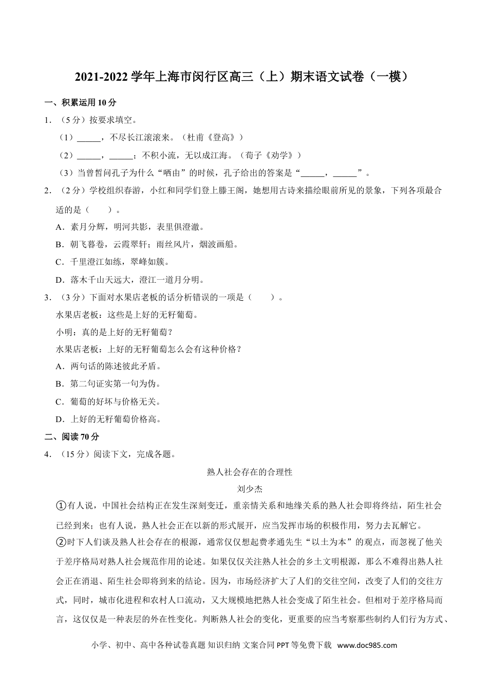 2021-2022学年上海市闵行区高三(上)期末语文试卷(一模)一、积累运用10分1.(5分)按要求填空。(1),不尽长江滚滚来。(杜甫《登高》)(2),;不积小流,无以成江海。(荀子《劝学》)(3)当曾皙问孔子为什么“哂由”的时候,孔子给出的答案是“,”。2.(2分)学校组织春游,小红和同学们登上滕王阁,她想用古诗来描绘眼前所见的景象,下列各项最合适的是()。A.素月分辉,明河共影,表里俱澄澈。B.朝飞暮卷,云霞翠轩;雨丝风片,烟波画船。C.千里澄江如练,翠峰如簇。D.落木千山天远大,澄江一道月分明。3.(3分)下面对水果店老板的话分析错误的一项是()。水果店老板:这些是上好的无籽葡萄。小明:真的是上好的无籽葡萄?水果店老板:上好的无籽葡萄怎么会有这种价格?A.两句话的陈述彼此矛盾。B.第二句证实第一句为伪。C.葡萄的好坏与价格无关。D.上好的无籽葡萄价格高。二、阅读70分4.(15分)阅读下文,完成各题。熟人社会存在的合理性刘少杰①有人说,中国社会结构正在发生深刻变迁,重亲情关系和地缘关系的熟人社会即将终结,陌生社会已经到来;也有人说,熟人社会正在以新的形式展开,应当发挥市场的积极作用,努力去瓦解它。②时下人们谈及熟人社会存在的根源,通常仅仅想起费孝通先生“以土为本”的观点,而忽视了他关于差序格局对熟人社会规范作用的论述。如果仅仅关注熟人社会的乡土文明根源,那么不难得出熟人社会正在消退、陌生社会即将到来的结论。因为,市场经济扩大了人们的交往空间,改变了人们的交往方式,同时,城市化进程和农村人口流动,又大规模地把熟人社会变成了陌生社会。但相对于差序格局而言,这仅仅是一种表层的外在性变化。判断熟人社会的变化,更重要的应当考察那些制约人们行为方式、小学、初中、高中各种试卷真题知识归纳文案合同PPT等免费下载www.doc985.com思维方式和生活方式的制度结构的变迁。③事实上,当费孝通先生论述熟人社会同乡土文明关系时,揭示了熟人社会的发生根源;而当他论述由亲情原则而形成的差序格局时,实质是在讨论熟人社会形成后稳定持续的存在根源。二者密切联系又不能等同。一种社会现象可以因为某种因素而生成,但一旦生成并持续存在,就意味着其中形成了某种制度结构,制约社会行为并稳定社会秩序,使社会持续运行。同土地连在一起的发生根源可以随着人们远离土地而失去作用,而作为制度结构的存在根源却可持续地运行下去。④一种制度能够形成且长期稳定地发挥作用,一定有其存在的合理性。注重亲情的行为规则同血缘关系、地缘关系和熟悉关系是分不开的,而这些关系又是社会生活中永远存在的,只要繁衍不息、交往不止、社会延续,就永远不可祛除,并且,正是这些关系中蕴含了人类的原初品质和真实本性,人们无论怎样紧张疲惫,一旦回到亲朋好友之中,便会感到轻松与安全。⑤肯定了血缘关系、地缘关系和熟悉关系,也就肯定了熟人社会存在的合理性,然而,这种肯定又不是无限制的,在专业化领域或组织化领域应当受到限制。具体说,不应当把在血缘关系、地缘关系和熟人关系中合理发挥作用的亲情原则扩展到专业化领域和组织化领域。如果坚持了这一点,就意味着在我们的生活中可以划分出熟人社会和陌生社会。⑥由于中国社会生活的分化程度较低,人们常常淡化各种生活领域的界限与区别,本来在日常生活领域中有效的熟人社会的原则,往往被推及其他专业化和组织化的领域之中,其结果不仅导致在不同领域中才能有效的制度发生冲突,而且严重影响社会生活的效率。马克斯•韦伯以社会生活和社会行动有不同类型并遵循不同制度原则为前提,强调在组织中实行严格排斥亲情的科层制度,其主旨便是限制日常生活领域中的感性制度在组织中同理性化制度发生冲突,并以此保证组织效率的实现。⑦熟人社会的消极性不在于它的存在,而在于它同那些专业化领域和组织化领域之间的界限不清。熟人社会的原则或制度源于生活,因此是人们最熟悉且最能有效利用的,它可以轻松地被人们扩展到日常生活之外的领域,可以无孔不入地侵袭、弱化甚或取代专业规矩和组织制度,以致私与公、情与理都被一股脑地搅在了一起,社会公正和...