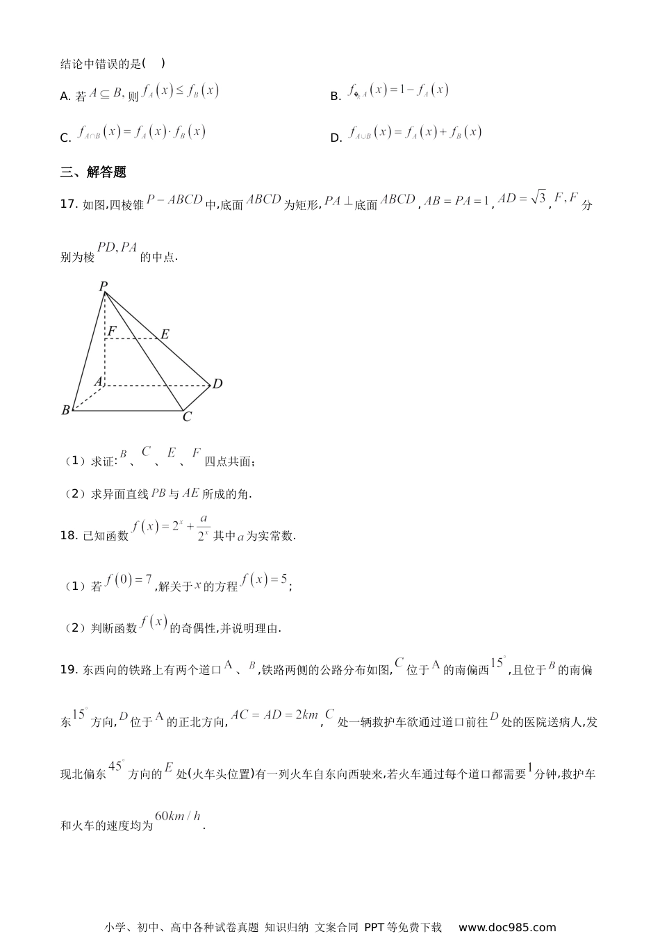 小学、初中、高中各种试卷真题知识归纳文案合同PPT等免费下载www.doc985.com杨浦区2019学年度第一学期高三年级模拟质量调研数学学科试卷一、填空题1.函数的定义域为_______.2.关于、的方程组的增广矩阵为________3.已知函数的反函数,则_______4.设为纯虚数(为虚数单位),则________.5.已知圆锥的底面半径为,侧面积为,则母线与底面所成角的大小为_____.6.已知的展开式中,含项的系数等于280,则实数________.7.椭圆的焦点为为椭圆上一点,若,则_________.8.已知数列的通项公式为,是数列的前项和,则________.9.在直角坐标平面中,,动点在圆上,则的取值范围为_______.10.已知六个函数:①;②;③;④;⑤;⑥,从中任选三个函数,则其中既有奇函数又有偶函数的选法共有_______种.11.已知函数,若关于的方程有三个不相等的实数小学、初中、高中各种试卷真题知识归纳文案合同PPT等免费下载www.doc985.com解,则实数的取值范围为_________.12.向量集合,对于任意,以及任意,都有,则称为“类集”,现有四个命题:①若为“类集”,则集合也是“类集”;②若,都是“类集”,则集合也是“类集”;③若都是“类集”,则也是“类集”;④若都是“类集”,且交集非空,则也是“类集”.其中正确的命题有________(填所有正确命题的序号)二、选择题13.已知为非零实数,且,则下列不等式成立的是()A.B.C.D.14.要得到函数的图象,只要将的图象()A.向左平移个单位B.向右平移个单位C.向左平移个单位D.向右平移个单位15.设为复数,则下列命题中一定成立的是()A.如果,那么B.如果,那么C.如果,那么D.如果,那么16.对于全集的子集定义函数为的特征函数,设为全集的子集,下列小学、初中、高中各种试卷真题知识归纳文案合同PPT等免费下载www.doc985.com结论中错误的是()A.若则B.C.D.三、解答题17.如图,四棱锥中,底面为矩形,底面,,,分别为棱的中点.(1)求证:、、、四点共面;(2)求异面直线与所成的角.18.已知函数其中为实常数.(1)若,解关于的方程;(2)判断函数的奇偶性,并说明理由.19.东西向的铁路上有两个道口、,铁路两侧的公路分布如图,位于的南偏西,且位于的南偏东方向,位于的正北方向,,处一辆救护车欲通过道口前往处的医院送病人,发现北偏东方向的处(火车头位置)有一列火车自东向西驶来,若火车通过每个道口都需要分钟,救护车和火车的速度均为.小学、初中、高中各种试卷真题知识归纳文案合同PPT等免费下载www.doc985.com(1)判断救护车通过道口是否会受火车影响,并说明理由;(2)为了尽快将病人送到医院,救护车应选择、中的哪个道口?通过计算说明.20.如图,在平面直角坐标系中,已知抛物线的焦点为,点是第一象限内抛物线上的一点,点的坐标为(1)若,求点的坐标;(2)若为等腰直角三角形,且,求点的坐标;(3)弦经过点,过弦上一点作直线的垂线,垂足为点,求证:“直线与抛物线相切”的一个充要条件是“为弦的中点”.21.已知无穷数列的前项和为,若对于任意的正整数,均有,则称数列具有性质.(1)判断首项为,公比为的无穷等比数列是否具有性质,并说明理由;(2)已知无穷数列具有性质,且任意相邻四项之和都相等,求证:;小学、初中、高中各种试卷真题知识归纳文案合同PPT等免费下载www.doc985.com(3)已知,数列是等差数列,,若无穷数列具有性质,求的取值范围.小学、初中、高中各种试卷真题知识归纳文案合同PPT等免费下载www.doc985.com