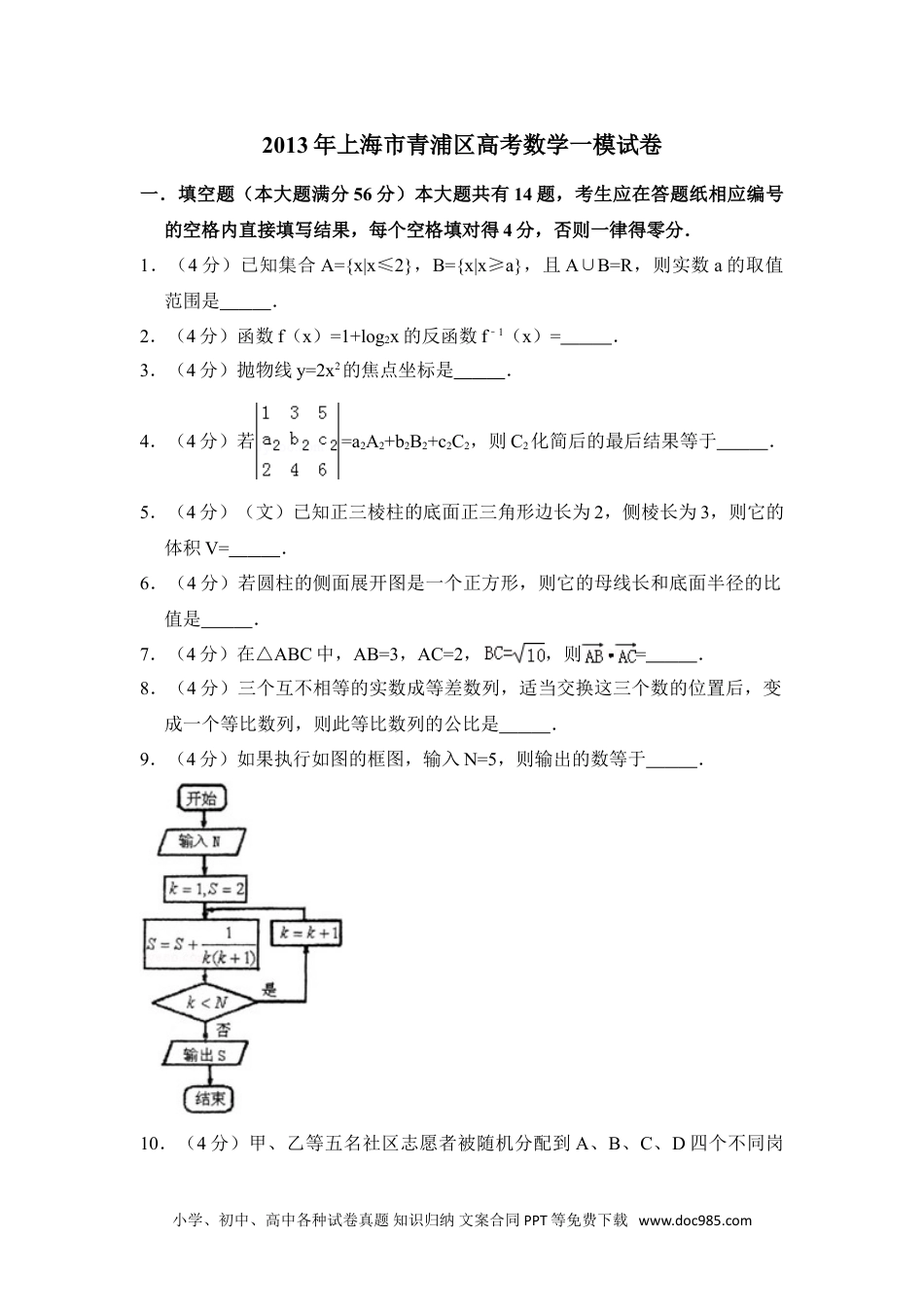 2013年上海市青浦区高考数学一模试卷一.填空题(本大题满分56分)本大题共有14题,考生应在答题纸相应编号的空格内直接填写结果,每个空格填对得4分,否则一律得零分.1.(4分)已知集合A={x|x≤2},B={x|x≥a},且A∪B=R,则实数a的取值范围是.2.(4分)函数f(x)=1+log2x的反函数f﹣1(x)=.3.(4分)抛物线y=2x2的焦点坐标是.4.(4分)若=a2A2+b2B2+c2C2,则C2化简后的最后结果等于.5.(4分)(文)已知正三棱柱的底面正三角形边长为2,侧棱长为3,则它的体积V=.6.(4分)若圆柱的侧面展开图是一个正方形,则它的母线长和底面半径的比值是.7.(4分)在△ABC中,AB=3,AC=2,,则=.8.(4分)三个互不相等的实数成等差数列,适当交换这三个数的位置后,变成一个等比数列,则此等比数列的公比是.9.(4分)如果执行如图的框图,输入N=5,则输出的数等于.10.(4分)甲、乙等五名社区志愿者被随机分配到A、B、C、D四个不同岗小学、初中、高中各种试卷真题知识归纳文案合同PPT等免费下载www.doc985.com位服务,每个岗位至少有一名志愿者,则甲、乙两人同时参加岗位A服务的概率是.11.(4分)已知a2sinθ+acosθ﹣1=0与b2sinθ+bcosθ﹣1=0(a≠b).直线MN过点M(a,a2)与点N(b,b2),则坐标原点到直线MN的距离是.12.(4分)已知满足对任意x1≠x2,都有>0成立,那么a的取值范围是.13.(4分)正六边形A1B1C1D1E1F1的边长为1,它的6条对角线又围成了一个正六边形A2B2C2D2E2F2,如此继续下去,则所有这些六边形的面积和是.14.(4分)设x,y∈R,且满足,则x+y=.二.选择题(本大题满分20分)本大题共有4题,每题有且只有一个正确答案.考生应在答题纸的相应编号上,将代表答案的小方格涂黑,选对得5分,否则一律得零分.15.(5分)设双曲线的虚轴长为2,焦距为,则双曲线的渐近线方程为()A.B.y=±2xC.D.16.(5分)对于原命题“周期函数不是单调函数”,下列陈述正确的是(小学、初中、高中各种试卷真题知识归纳文案合同PPT等免费下载www.doc985.com)A.逆命题为“单调函数不是周期函数”B.否命题为“周期函数是单调函数”C.逆否命题为“单调函数是周期函数”D.以上三者都不对17.(5分)已知复数z0=1+2i在复平面上对应点为P0,则P0关于直线l:|z﹣2﹣2i|=|z|的对称点的复数表示是()A.﹣iB.iC.1﹣iD.1+i18.(5分)已知函数f(x)是定义在R上的单调增函数且为奇函数,数列{an}是等差数列,a1007>0,则f(a1)+f(a2)+f(a3)+…+f(a2012)+f(a2013)的值()A.恒为正数B.恒为负数C.恒为0D.可正可负三.解答题(本大题满分74分)本大题共有5题,解答下列各题必须在答题纸相应编号的规定区域内写出必要的步骤.19.(12分)如图已知四棱锥P﹣ABCD的底面是边长为6的正方形,侧棱PA的长为8,且垂直于底面,点M、N分别是DC、AB的中点.求(1)异面直线PM与CN所成角的大小(结果用反三角函数值表示);(2)四棱锥P﹣ABCD的表面积.20.(14分)已知数列{an}满足a1=2,an+1=3an+3n+1﹣2n(n∈N+)(1)设bn=,证明:数列{bn}为等差数列,并求数列{an}的通项公式;(2)求数列{an}的前n项和Sn.21.(14分)已=(2cosx+2sinx,1),=(cosx,﹣y),满足.小学、初中、高中各种试卷真题知识归纳文案合同PPT等免费下载www.doc985.com(1)将y表示为x的函数f(x),并求f(x)的最小正周期;(2)已知a,b,c分别为△ABC的三个内角A,B,C对应的边长,若对所有的x∈R恒成立,且a=2,求b+c的取值范围.22.(16分)设直线L1:y=k1x+p,p≠0交椭圆Γ:=1(a>b>0)于C、D两点,交直线L2:y=k2x于点E.(1)若E为CD的中点,求证:;(2)写出上述命题的逆命题并证明此逆命题为真;(3)请你类比椭圆中(1)、(2)的结论,写出双曲线中类似性质的结论(不必证明).23.(18分)我们把定义在R上,且满足f(x+T)=af(x)(其中常数a,T满足a≠1,a≠0,T≠0)的函数叫做似周期函数.(1)若某个似周期函数y=f(x)满足T=1且图象关于直线x=1对称.求证:函数f(x)是偶函数;(2)当T=1,a=2时,某个似周期函数在0≤x<1时的解析式为f(x)=...