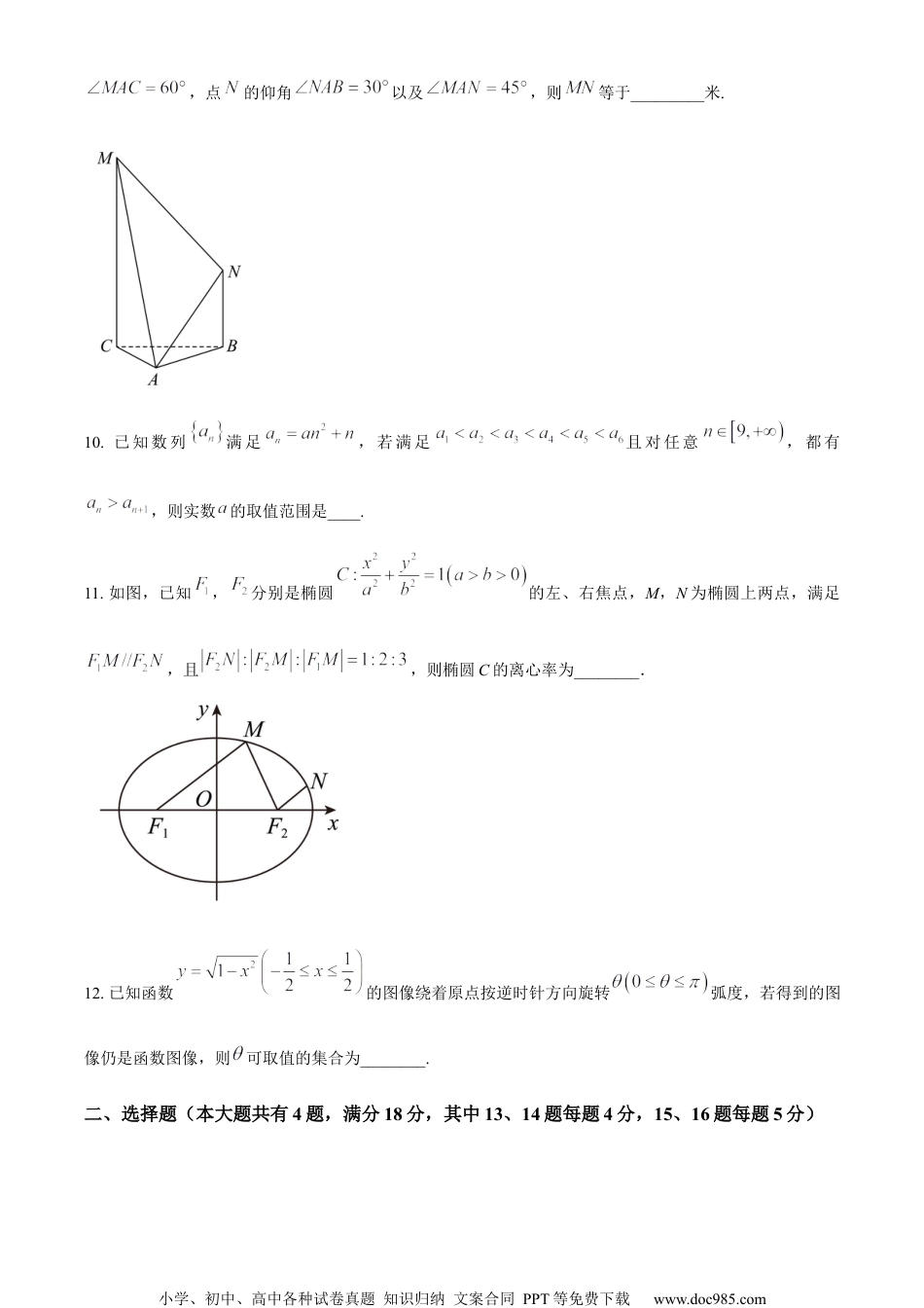 小学、初中、高中各种试卷真题知识归纳文案合同PPT等免费下载www.doc985.com2023届青浦区高考数学二模一、填空题(本大题共有12题,满分54分,其中1~6题每题4分,7~12题每题5分)1.直线a、b确定一个平面,则a、b的位置关系为__.2.已知复数满足(为虚数单位),则_______________.3.已知向量,,则在方向上的投影是_______________.4.过点与直线垂直的直线方程为_______________.5.已知集合,若,则实数的取值范围为___________.6.已知圆柱的底面直径和高都等于球的直径,圆柱的体积为,则球的表面积为______.7.已知函数的图像如图所示,则不等式的解集是_______________.8.已知函数是定义在上的奇函数,且满足,,则________.9.如图所示,要在两山顶间建一索道,需测量两山顶间的距离.已知两山的海拔高度分别是米和米,现选择海平面上一点为观测点,从点测得点的仰角小学、初中、高中各种试卷真题知识归纳文案合同PPT等免费下载www.doc985.com,点的仰角以及,则等于_________米.10.已知数列满足,若满足且对任意,都有,则实数的取值范围是____.11.如图,已知,分别是椭圆的左、右焦点,M,N为椭圆上两点,满足,且,则椭圆C的离心率为________.12.已知函数的图像绕着原点按逆时针方向旋转弧度,若得到的图像仍是函数图像,则可取值的集合为________.二、选择题(本大题共有4题,满分18分,其中13、14题每题4分,15、16题每题5分)小学、初中、高中各种试卷真题知识归纳文案合同PPT等免费下载www.doc985.com13.设是两个不平行的向量,则下列四组向量中,不能组成平面向量的一个基底的是()A.和B.和C.和D.和14.已知为正整数,则“是3的倍数”是“的二项展开式中存在常数项”的()条件.A.充分非必要B.必要非充分C.充要D.既不充分也不必要15.某产品的广告费用x与销售额y的统计数据如下表:广告费用(万元)4235销售额(万元)49263954根据上表可得回归方程中的为9.4,据此模型预报广告费用为6万元时销售额为A.63.6万元B.65.5万元C.67.7万元D.72.0万元16.已知数列满足,存在正偶数使得,且对任意正奇数有,则实数的取值范围是().A.B.C.D.三、解答题(本大题共有5题,满分78分)17.已知函数.(1)求函数的最小正周期及对称轴方程小学、初中、高中各种试卷真题知识归纳文案合同PPT等免费下载www.doc985.com(2)求在上的值域.18.如图,在直三棱柱中,底面是等腰直角三角,,为侧棱的中点.(1)求证:平面;(2)求二面角的正弦值.19.在全民抗击新冠疫情期间,某校开展了“停课不停学”活动,一个星期后,某校随机抽取了100名居家学习的高二学生进行问卷调查,得到学生每天学习时间(单位:)的频率分布直方图如下,若被抽取的这100名学生中,每天学习时间不低于8小时有30人.(1)求频率分布直方图中实数的值;(2)每天学习时间在的7名学生中,有4名男生,3名女生,现从中抽2人进行电话访谈,已知抽取的学生有男生,求抽取的2人恰好为一男一女的概率;(3)依据所抽取的样本,从每天学习时间在和的学生中按比例分层抽样抽取8人,再小学、初中、高中各种试卷真题知识归纳文案合同PPT等免费下载www.doc985.com从这8人中选3人进行电话访谈,求抽取的3人中每天学习时间在的人数分布和数学期望.20.如图,已知是抛物线上的三个点,且直线分别与抛物线相切,为抛物线的焦点.(1)若点的横坐标为,用表示线段的长;(2)若,求点的坐标;(3)证明:直线与抛物线相切.21.设是定义域为的函数,当时,.(1)已知在区间上严格增,且对任意,有,证明:函数在区间上是严格增函数;(2)已知,且对任意,当时,有,若当时,函数取得极值,求实数的值;(3)已知,且对任意,当时,有小学、初中、高中各种试卷真题知识归纳文案合同PPT等免费下载www.doc985.com,证明:.小学、初中、高中各种试卷真题知识归纳文案合同PPT等免费下载www.doc985.com