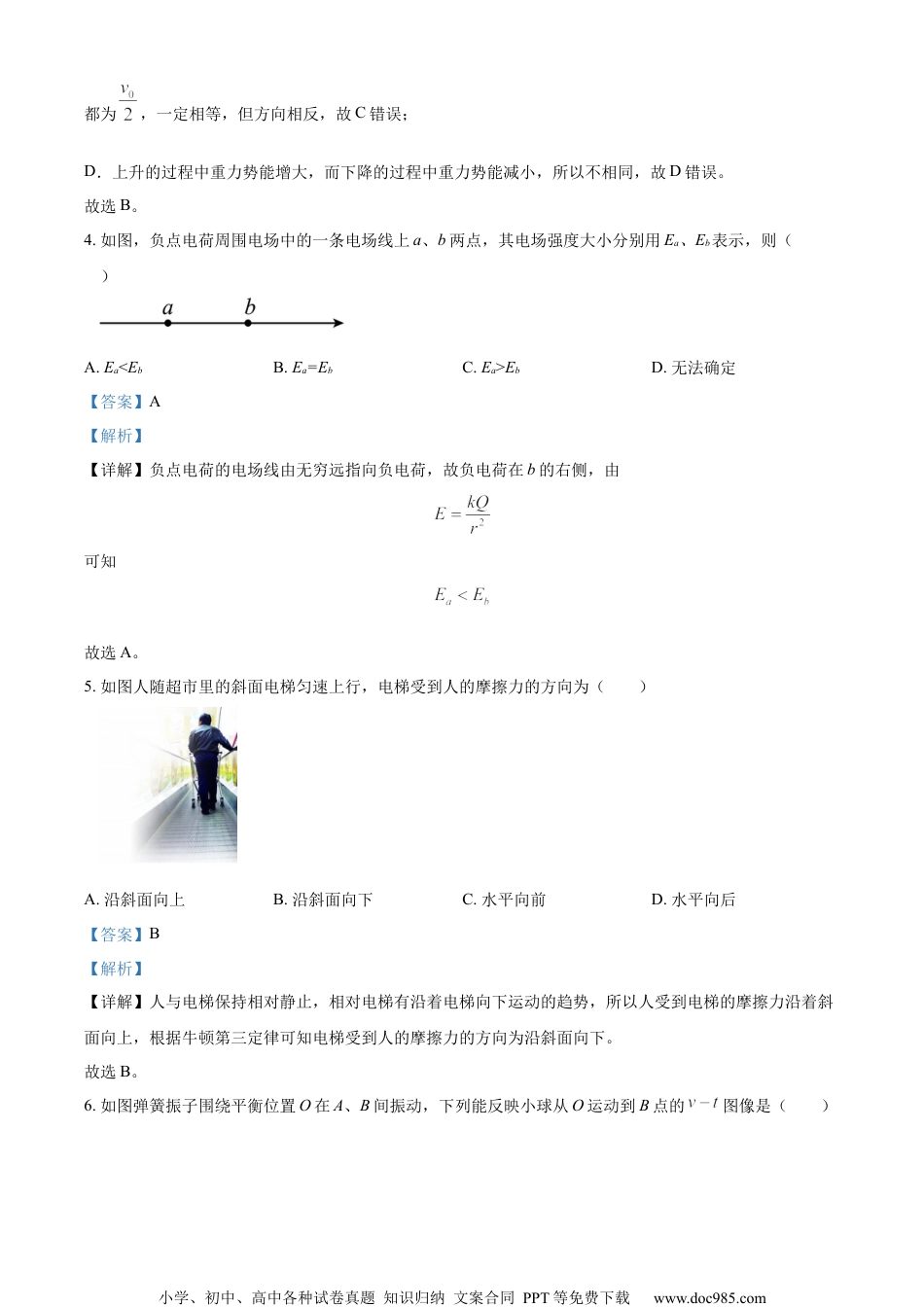 小学、初中、高中各种试卷真题知识归纳文案合同PPT等免费下载www.doc985.com2022年12月松江区高三物理练习卷考生注意:1.试卷满分100分,考试时间60分钟。2.本考试分设试卷和答题纸。试卷包括三部分,第一部分为选择题,第二部分为填空题,第三部分为综合题。3.答题前,务必在答题纸上填写学校、班级、姓名、考号。作答必须涂或写在答题纸上,在试卷上作答一律不得分。第一部分的作答必须涂在答题纸上相应的区域,第二、三部分的作答必须写在答题纸上与试卷题号对应的位置。一、单项选择题(共40分。第1-8小题,每小题3分;第9-12小题,每小题4分,每小题只有一个正确答案。)1.下列物理量单位中,属于导出单位的是()A.米B.秒C.牛顿D.开尔文【答案】C【解析】【详解】米、秒、开尔文是国际单位制中的基本单位,牛顿是导出单位,故C正确,ABD错误。故选C。2.研究落体运动规律,最先把实验和推理相结合并得出正确结论的科学家是()A.伽利略B.牛顿C.亚里士多德D.卡文迪许【答案】A【解析】【详解】最早运用实验和推理相结合的方法对落体运动进行研究并得出正确结论的科学家是伽利略。故选A。3.做竖直上抛运动的物体在上升和下落过程中,相同的是()A.位移B.加速度C.平均速度D.重力势能的变化【答案】B【解析】【详解】A.上升和下落过程的位移大小相等,方向相反,则位移不相同,故A错误;B.整个过程加速度都是,大小和方向都保持不变,故B正确;C.在整个运动过程中,物体的加速度都为g,上升和下落过程具有对称性,则上升和下落的时间一定相等,根据对称性可知落回抛出点时的速度跟物体在抛出时的初速度大小相等,上升和下落过程的平均速度大小小学、初中、高中各种试卷真题知识归纳文案合同PPT等免费下载www.doc985.com都为,一定相等,但方向相反,故C错误;D.上升的过程中重力势能增大,而下降的过程中重力势能减小,所以不相同,故D错误。故选B。4.如图,负点电荷周围电场中的一条电场线上a、b两点,其电场强度大小分别用Ea、Eb表示,则()A.Ea<EbB.Ea=EbC.Ea>EbD.无法确定【答案】A【解析】【详解】负点电荷的电场线由无穷远指向负电荷,故负电荷在b的右侧,由可知故选A。5.如图人随超市里的斜面电梯匀速上行,电梯受到人的摩擦力的方向为()A.沿斜面向上B.沿斜面向下C.水平向前D.水平向后【答案】B【解析】【详解】人与电梯保持相对静止,相对电梯有沿着电梯向下运动的趋势,所以人受到电梯的摩擦力沿着斜面向上,根据牛顿第三定律可知电梯受到人的摩擦力的方向为沿斜面向下。故选B。6.如图弹簧振子围绕平衡位置O在A、B间振动,下列能反映小球从O运动到B点的图像是()小学、初中、高中各种试卷真题知识归纳文案合同PPT等免费下载www.doc985.comA.B.C.D.【答案】D【解析】【详解】弹簧振子从平衡位置O运动到B点的过程中,根据可知振子加速度逐渐增大,由于与振子运动速度方向相反,所以振子做加速度逐渐增大的减速运动。故选D。7.电热锅通电后可以煮熟食物,而与它相连的导线却不怎么发热,原因是()A.通过电热锅的电流大B.通过导线的电流大C.电热锅的电阻小D.导线的电阻小【答案】D【解析】【详解】AB.因为电热锅和导线是串联关系,所以它们电流一定相等,故A错误,B错误;CD.电流通过任何导体时,导体都要发热,这种现象叫做电流的热效应,根据焦耳定律公式可知,串联电路,在电流和通电时间相同的情况下,导体的电阻越小,所以产生的热量就越少,故C错误,D正确。故选D。8.水平绳一端固定,用手抓住绳的另一端上下抖动,若上下抖动的频率逐渐增大,某时刻在一段绳上观察小学、初中、高中各种试卷真题知识归纳文案合同PPT等免费下载www.doc985.com到如图所示的波形,则()A.该波的传播方向向右B.该波的传播方向无法确定C.从图示时刻起,质点b比质点a先到波谷D.从图示时刻起,质点a比质点b先到波谷【答案】C【解析】【详解】AB.波在同种介质中传播速度不变,频率逐渐增大,由则波长变小,由图可知,该波的传播方向向左,故AB不符合题意;CD.由上下坡法可知ab两质点都向下振动,质点b频率大于质点a,质点b比质点a先到波谷,故C符合题意,D不符合题意。故选C。...