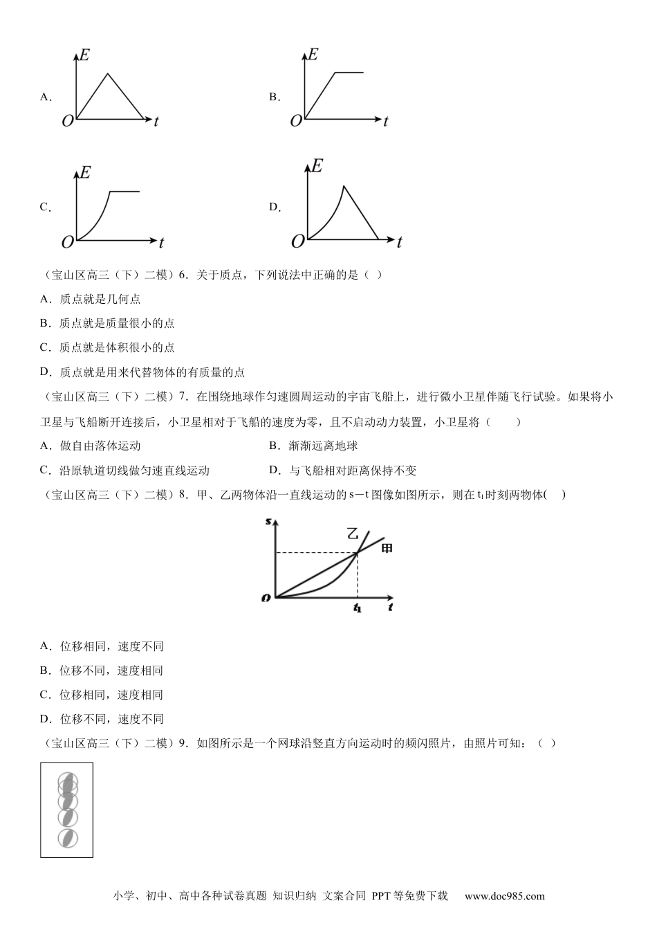 小学、初中、高中各种试卷真题知识归纳文案合同PPT等免费下载www.doc985.com2022届上海(浦东新区、徐汇、杨浦、闵行、长宁、宝山、虹口区)高考二模物理试题分类汇编力学(二)一、单选题(长宁区高三(下)二模)1.一质量分布均匀的物块用两根轻绳吊起处于静止状态,合理的是()A.B.C.D.(长宁区高三(下)二模)2.汽车在平直公路上加速运动过程中,关于牵引力F的大小及其功率P的判断正确的是()A.若F不变,则功率P不变B.若F不变,则功率P减小C.若功率P不变,则F减小D.若功率P不变,则F增大(长宁区高三(下)二模)3.质量为m的物体放在地球表面,已知地球的质量为M、半径为R,万有引力常量为G。则地球表面的重力加速度大小可表示为()A.B.C.D.(长宁区高三(下)二模)4.光滑水平面上有一质量为2kg的物体,在五个恒定的水平共点力的作用下处于平衡状态。现同时撤去大小分别为5N和15N的两个力而其余力保持不变,关于此后物体的运动情况的说法正确的是()A.一定做匀变速运动,加速度大小可能是10m/s2B.一定做匀变速直线运动,加速度大小可能是5m/s2C.可能做匀减速直线运动,加速度大小可能是2m/s2D.可能做匀速圆周运动,向心加速度大小可能是8m/s2(长宁区高三(下)二模)5.一物体在竖直向上的恒力作用下,由静止开始向上运动,到达某一高度时撤去该力。若不计空气阻力,则在整个上升过程中,物体的机械能E随时间t变化的关系图像是()小学、初中、高中各种试卷真题知识归纳文案合同PPT等免费下载www.doc985.comA.B.C.D.(宝山区高三(下)二模)6.关于质点,下列说法中正确的是()A.质点就是几何点B.质点就是质量很小的点C.质点就是体积很小的点D.质点就是用来代替物体的有质量的点(宝山区高三(下)二模)7.在围绕地球作匀速圆周运动的宇宙飞船上,进行微小卫星伴随飞行试验。如果将小卫星与飞船断开连接后,小卫星相对于飞船的速度为零,且不启动动力装置,小卫星将()A.做自由落体运动B.渐渐远离地球C.沿原轨道切线做匀速直线运动D.与飞船相对距离保持不变(宝山区高三(下)二模)8.甲、乙两物体沿一直线运动的s-t图像如图所示,则在t1时刻两物体()A.位移相同,速度不同B.位移不同,速度相同C.位移相同,速度相同D.位移不同,速度不同(宝山区高三(下)二模)9.如图所示是一个网球沿竖直方向运动时的频闪照片,由照片可知:()小学、初中、高中各种试卷真题知识归纳文案合同PPT等免费下载www.doc985.comA.网球正在上升B.网球正在下降C.网球的加速度向上D.网球的加速度向下(宝山区高三(下)二模)10.一根轻绳一端系一小球,另一端固定在点,在点有一个能测量绳的拉力大小的力传感器,让小球绕点在竖直平面内做简谐振动(类似单摆的运动),由传感器测出拉力随时间的变化图像如图所示,则下列判断正确的是()A.小球振动的周期为B.小球动能变化的周期为C.小球速度变化的周期为D.小球重力势能变化的周期为(宝山区高三(下)二模)11.如图所示,质量为的框架放在水平地面上,一轻质弹簧上端固定在框架上,下端挂一个质量为的小球,小球上下振动时,框架始终没有跳起,当框架对地面的压力为零的瞬间,小球受到的合力为()A.B.C.0D.(虹口区高三(下)二模)12.根据速度定义式,当极短时,就可以表示物体在时刻的瞬时速度,该定义应用了下列哪种物理方法()A.等效替代法B.假设法C.控制变量法D.极限的思想方法(虹口区高三(下)二模)13.竖直上抛运动的物体在上升和下落过程中,相同的是()A.位移B.速度的变化率C.平均速度D.重力势能的变化(虹口区高三(下)二模)14.某同学在100米短跑时采用蹲踞式起跑,发令枪响后,向前加速的同时提升身体重心。设该同学质量为m,在起跑前进的这段距离内重心上升高度为h,获得速度为v,克服阻力做功为W阻,重力加速度为g。则在此过程中()A.该同学的重力势能减小量为mgh小学、初中、高中各种试卷真题知识归纳文案合同PPT等免费下载www.doc985.comB.该同学的动能增加量为C.该同学的机械能增加量为D.该同学自身提供的能量至少为(虹口区高三(下)二模...