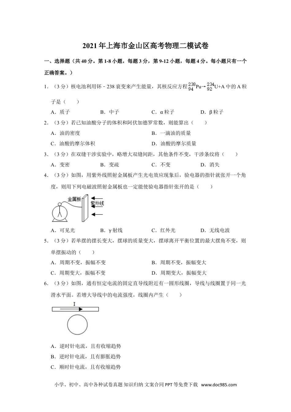 2021年上海市金山区高考物理二模试卷一、选择题(共40分。第1-8小题,每题3分,第9-12小题,每题4分。每小题只有一个正确答案。)1.(3分)核电池利用钚﹣238衰变来产生能量,其核反应方程Pu→U+A中的A粒子是()A.质子B.中子C.α粒子D.β粒子2.(3分)若已知油酸分子的体积和阿伏加德罗常数,则能算出()A.油的密度B.一滴油的质量C.油酸的摩尔体积D.油酸的摩尔质量3.(3分)在双缝干涉实验中,略增大双缝间距,其他条件不变,干涉条纹将()A.变密B.变疏C.不变D.消失4.(3分)如图,用紫外线照射金属板产生光电效应现象后,验电器的指针就张开一个角度,则用下列电磁波照射金属板也一定能使验电器指针张开的是()A.可见光B.γ射线C.红外光D.无线电波5.(3分)若单摆的摆长变大,摆球的质量变大,摆球离开平衡位置的最大摆角不变,则单摆振动的()A.周期不变,振幅不变B.周期不变,振幅变大C.周期变大,振幅不变D.周期变大,振幅变大6.(3分)如图,通有恒定电流的固定直导线附近有一圆形线圈,导线与线圈置于同一光滑水平面。若增大导线中的电流强度,线圈内产生()A.逆时针电流,且有收缩趋势B.逆时针电流,且有膨胀趋势C.顺时针电流,且有收缩趋势小学、初中、高中各种试卷真题知识归纳文案合同PPT等免费下载www.doc985.comD.顺时针电流,且有膨胀趋势7.(3分)如图,同一条过山车轨道上,一辆小车与多辆相同小车连接在一起分别以初速度v0进入圆轨道,若滑行到重心最高时速度分别为v1和v2。不计轨道和空气阻力,则v1、v2的大小关系是()A.v1<v2B.v1>v2C.v1=v2D.与小车数量有关,无法判断8.(3分)如图,一定质量的理想气体从状态A沿直线变化到状态B的过程中,其体积()A.保持不变B.逐渐变大C.逐渐变小D.先变小后变大9.(4分)一机械波沿x正方向传播。若A、B两质点某时刻速度相同且位置如图所示,则AB之间两种可能的波形是()A.B.C.D.10.(4分)如图,分别将两个质量相同的小球A、B从竖直铝管的管口上方静止释放。在A、B两球分别穿过铝管的过程中,某同学对铝管向上的平均作用力分别为10.5N、小学、初中、高中各种试卷真题知识归纳文案合同PPT等免费下载www.doc985.com10.0N,使铝管保持静止。不计空气阻力,其中一个小球是磁体,则()A.A球是磁体,铝管重约10.0NB.A球是磁体,铝管重约10.5NC.B球是磁体,铝管重约10.0ND.B球是磁体,铝管重约10.5N11.(4分)一个小球被竖直向上抛出,不计空气阻力,取g=10m/s2。若前3s内的位移和第4s内的位移大小相等、方向相反,则小球前4s内的位移和上抛初速度大小分别为()A.0m,20m/sB.0m,30m/sC.45m,20m/sD.45m,30m/s12.(4分)三个电量分别是﹣Q、+Q、+Q的点电荷固定在三角形的三个顶点,形成电场的部分等势面如图所示,粗实线①为某根电场线。下列推理中正确的是()A.根据电场线①与等势面垂直,可知等势面1和等势面2的电势相等B.根据沿电场线①方向电势降低,可知等势面1和等势面2的电势相等C.根据沿电场线①方向电势降低,可知不存在与﹣Q和+Q的连线重合的电场线D.根据﹣Q和+Q的连线与等势面不垂直,可知不存在与﹣Q和+Q的连线重合的电场线二、填空题(共20分)13.(4分)卡文迪许利用实验测量了引力常量G。两物体间的万有引力大小相等,与两物体质量是否相等(选填“有关”或“无关”)。14.(4分)如图,一带电量大小为q、质量为m的小球,用绝缘丝线悬挂在竖直墙壁上,处于与水平方向成θ角的斜向下匀强电场中,小球平衡时丝线恰好水平。则小球带电(选填“正”或“负”),此电场的电场强度为。小学、初中、高中各种试卷真题知识归纳文案合同PPT等免费下载www.doc985.com15.(4分)半径50m的摩天轮匀速转动,周期为1200s。座舱经过底部弧长5m的范围为下客区域,则舱内乘客有s时间出舱。若乘客能感受到的最小加速度约0.02m/s2,则乘客在乘坐该摩天轮时(选填“能”或“不能”)感受到因转动而产生的加速度。16.(4分)如图所示电路中,E为电源,电源内阻为r,R1和R2是定值电阻,且R1=R2>r,滑动变阻器R3的滑片P从上端向下移动过程中,电流表示数...