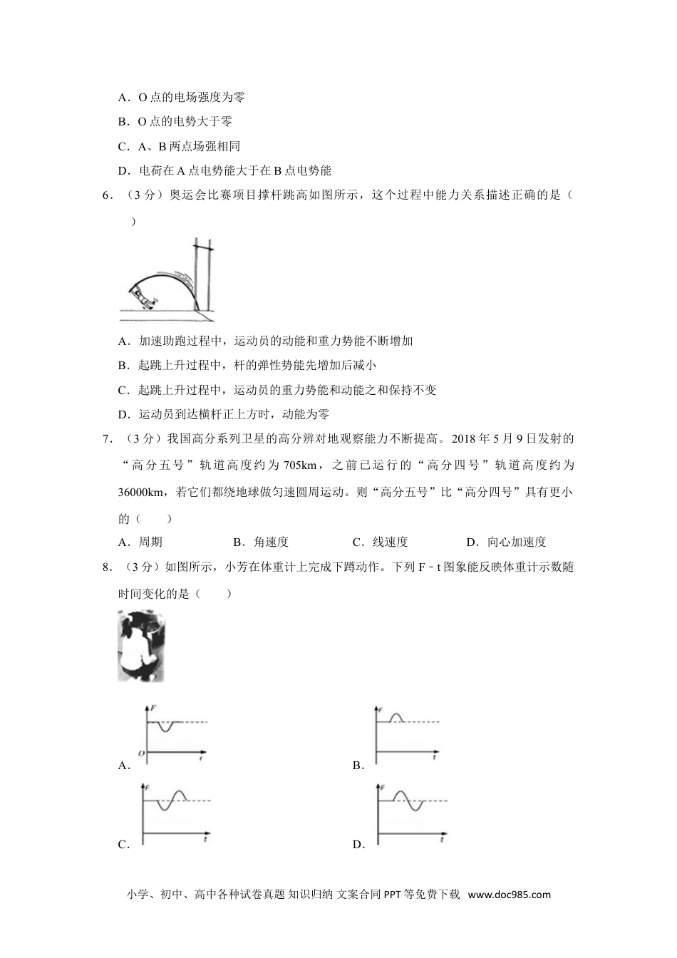 2019年上海市崇明区高考物理二模试卷一、单项选择题(共40分,1至8题每小题3分,9至12题每小题3分.每小题只有一个正确选项)1.(3分)下列哪个实验揭示了原子具有核式结构?()A.阴极射线实验B.光电效应实验C.α粒子轰击氮核实验D.α粒子散射实验2.(3分)下列国际单位中,表示能量单位的是()A.kg•m/sB.kg•m/s2C.kg•m2/s2D.kg•m2/s3.(3分)如图是Rn(氡核)发生α衰变过程中,氡核的相对含量随时间的变化图线,从图中可知,氡的半衰期为()A.1.6天B.3.8天C.7.6天D.11.4天4.(3分)用某单色光照射金属表面,金属表面有光电子飞出.若照射光的频率增大,强度减弱,则单位时间内飞出金属表面的光电子的()A.能量增大,数量增多B.能量减小,数量减少C.能量增大,数量减小D.能量减小,数量增多5.(3分)图示,虚线AB和CD分别为椭圆的长轴和短轴,相交于O点,两个等量异号点电荷分别位于椭圆的两个焦点M、N上。若取无穷远为零电势。则下列判断中正确的是()小学、初中、高中各种试卷真题知识归纳文案合同PPT等免费下载www.doc985.comA.O点的电场强度为零B.O点的电势大于零C.A、B两点场强相同D.电荷在A点电势能大于在B点电势能6.(3分)奥运会比赛项目撑杆跳高如图所示,这个过程中能力关系描述正确的是()A.加速助跑过程中,运动员的动能和重力势能不断增加B.起跳上升过程中,杆的弹性势能先增加后减小C.起跳上升过程中,运动员的重力势能和动能之和保持不变D.运动员到达横杆正上方时,动能为零7.(3分)我国高分系列卫星的高分辨对地观察能力不断提高。2018年5月9日发射的“高分五号”轨道高度约为705km,之前已运行的“高分四号”轨道高度约为36000km,若它们都绕地球做匀速圆周运动。则“高分五号”比“高分四号”具有更小的()A.周期B.角速度C.线速度D.向心加速度8.(3分)如图所示,小芳在体重计上完成下蹲动作。下列F﹣t图象能反映体重计示数随时间变化的是()A.B.C.D.小学、初中、高中各种试卷真题知识归纳文案合同PPT等免费下载www.doc985.com9.(4分)如图所示的单摆,摆长为l=40cm,摆球在t=0时刻从右侧最高点释放做简谐振动。当t=1s时,小球的运动情况是()A.向右加速B.向右减速C.向左加速D.向左减速10.(4分)a、b两个相同螺线管,电流、导线和匝数都相同,绕法不同。测得螺线管a内中部的磁感应强度大小为B,则在螺线管b内中部的磁感应强度大小为()A.0B.0.5BC.BD.2B11.(4分)如图,小物块置于倾角为θ的斜面上,与斜面一起以大小为gtanθ的加速度向左做匀加速直线运动,两者保持相对静止,则运动过程中,小物块受力的示意图为()A.B.C.D.12.(4分)如图,粗细均匀且相同的玻璃管A和B由一橡皮管连接,构成连通器,一定质量的空气被水银柱封闭在A管内,此时两管水银面一样高,B管上方与大气相通。若固定A管,保持温度不变,将B管沿竖直方向缓慢移动H,使A管内的水银面升高h,则B管的移动方向及移动距离H大小为()小学、初中、高中各种试卷真题知识归纳文案合同PPT等免费下载www.doc985.comA.向上移动H=2hB.向上移动H>2hC.向下移动H=2hD.向下移动H<2h二、填空题(每题4分,共20分)13.(4分)如图甲,让一束红色的激光通过双缝,在光屏上观察到的图案应该是图。该实验说明了光具有(波粒二象性、波动性、粒子性)。14.(4分)物体在地面附近以2m/s2的加速度匀减速竖直上升,则在上升过程中,物体的动能将,物体的机械能将。(选填增大、减小或不变)。15.(4分)如图所示电路中,电源E的电动势为3.2V,电阻R的阻值为30Ω,小灯泡L的额定电压为3.0V,额定功率为4.5W.当电键S接位置1时,电压表的读数为3V.则电源内电阻大小r=Ω,当电键S接到位置2时,小灯泡L的实际功率P=W.(假设灯泡电阻不变)16.(4分)汽车行驶时轮胎的胎压最高不能超过3.5atm,最低不低于1.6atm。已知某轮胎在t=20℃充好的气,能在零下40℃到90℃的范围内正常工作,那么,充气时的胎压最低压强为atm,最高压强为atm.(设轮胎的体积不变)17.(4分)质量为m的带正电的小球穿在光滑的绝缘细杆上,杆与水...