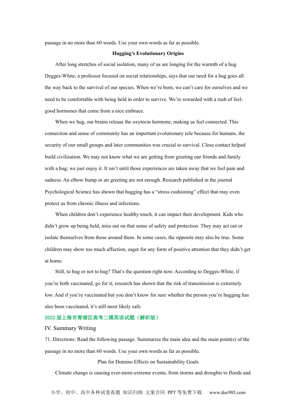 小学、初中、高中各种试卷真题知识归纳文案合同PPT等免费下载www.doc985.com上海市部分区2022届高三英语二模解析版试题分类汇编概要写作专题2022届上海市松江区高考二模英语试题(解析版)IV.SummaryWriting71.Directions:Readthefollowingpassage.Summarizethemainideaandthemainpoint(s)ofthepassageinnomorethan60words.Useyourownwordsasfaraspossible.WorkingOutWorriesbyWritingAfterhisfatherwasdriventothehospitalforemergenttreatment,43-year-oldYanathaDesouvrebegantopanic.So,hedidonethingthatheknewwouldcalmhimself:Hewrote.Overthenextfewweeks,Desouvrefilledseveralnotebooks,writingabouthisworryaswellashishappymemorieswithhisdad.“Writingallowedmetofacemyfearandprocessmypain,”hesays.Psychologistsrefertothatkindofwritingas“expressivewriting”.Peopledoitbyrecordingtheirdeepestthoughtsandfeelings.However,differentfromwritinginajournal,expressivewritingistoreflecthonestlyandthoughtfullyonaparticularfrustrationorchallenge.Awell-knownpsychologyprofessorsaysthathundredsofstudieshavelookedatthepotentialbenefitsofexpressivewritingandfounditcanhelpreducepainandimprovemood,sleepandmemory.Itmayevenhelpreducesymptomsofvariousillnesses,andpreventcoldsandflu.Expressivewritingtakeseffectbecausetranslatingapainfulexperienceintolanguageallowspeopletomakemeaningoutofit,someexpertssay.Theprocessforcesthemtoorganizetheirthoughtsandoffersasenseofcontrol,thuscompletingthepursuitofvaluefromsuchanexperience.Anotherresearchsuggestedthatduringexpressivewriting,theactoflabelingafeelingcanlessentheactivityrelatingtonervesinthethreatareaofthebrain.Withthesenervesrelaxed,peoplecanlowerthesymptomsoftheirdiseases,enhancetheirappreciationforlife,andincreasetheacceptanceofvariousexperiencesintheirlives.Whatcan’tbeignoredisthatitshouldn’tbeusedasareplacementforothermedicaltreatments.Andpeoplecopingwithaseveredepressionmaynotfinditusefultodoontheirown,withouttherapy.Yet,itcanbeapowerfulcopingtoolformany,inlargepartbecauseithelpsbattleagainsttheirreluctancetofacenegativeemotions.2022届上海市浦东新区高考二模英语试题(解析版)IV.SummaryWriting小学、初中、高中各种试卷真题知识归纳文案合同PPT等免费下载www.doc985.com71.Directions:Readthefollowingpassage.Summarizethemainideaandthemainpoint(s)ofthepassageinnomorethan60words.Useyourownwordsasfaraspossible.DoesZoomexhaustyou?DuringtheCOVID-19pandemic,associaldistancinghaskeptpeopleapartphysically,morepeopleareloggingontopopularvideochatplatformstoconnectwithcolleagues,familyandfriends.Andasaresult,virtualmeetings,or“zooming”,haveskyrocketed.However,communicationprofessorJeremyBailenson,foundingdirectoroftheStanfordVirtualHumanInteractionLab(VHIL)examinedthepsychologicalconsequencesofspendinghoursperdayontheseplatforms,warningthatthosevideocallsarelikelytiringyouout.Inanormalmeeting,peoplewillvariouslybelookingatthespeaker,takingnotes,orlookingelsewhere.ButonZoomcalls,everyoneislookingateveryone,allthetime.Alisteneristreatednonverballylikeaspeaker,soevenifyoudon’tspeakonceinameeting,youarestilllookingatfacesstaringatyou.Theamountofeyecontactisdramaticallyincreased.“Socialanxietyofpublicspeakingisoneofthebiggestfearsthatexistinourpopulation,”Bailensonsaid.“Whenyou’restandingupthereandeverybody’sstaringatyou,that’sastressfulexperience.”Mostvideoplatformsshowasquareofwhatyoulooklikeoncameraduringachat,whichisunnatural.Bailensonsaid,“Intherealworld,ifsomebodywasfollowingyouaroundwith...