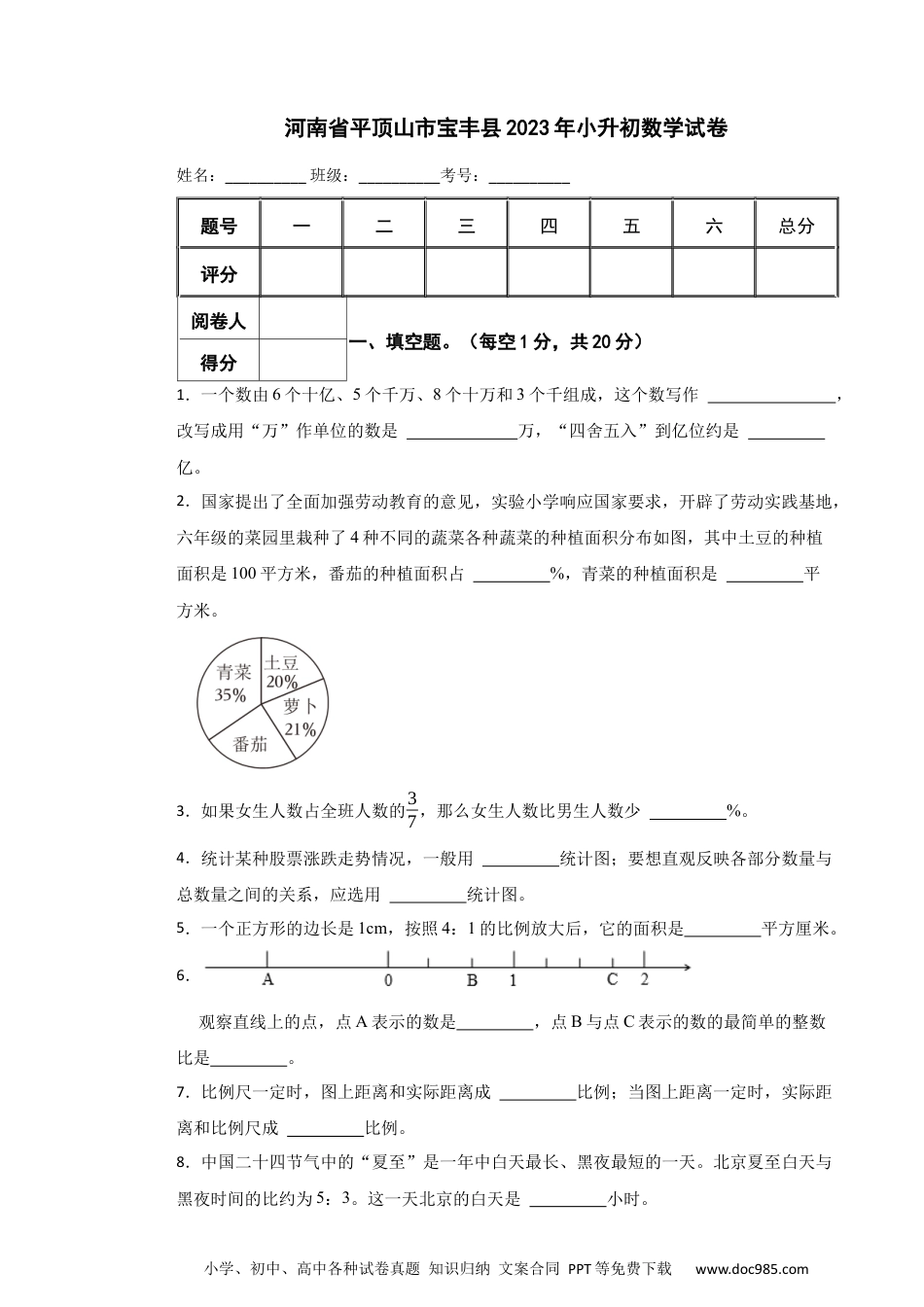 小学、初中、高中各种试卷真题知识归纳文案合同PPT等免费下载www.doc985.com河南省平顶山市宝丰县2023年小升初数学试卷姓名:__________班级:__________考号:__________题号一二三四五六总分评分阅卷人一、填空题。(每空1分,共20分)得分1.一个数由6个十亿、5个千万、8个十万和3个千组成,这个数写作,改写成用“万”作单位的数是万,“四舍五入”到亿位约是亿。2.国家提出了全面加强劳动教育的意见,实验小学响应国家要求,开辟了劳动实践基地,六年级的菜园里栽种了4种不同的蔬菜各种蔬菜的种植面积分布如图,其中土豆的种植面积是100平方米,番茄的种植面积占%,青菜的种植面积是平方米。3.如果女生人数占全班人数的37,那么女生人数比男生人数少%。4.统计某种股票涨跌走势情况,一般用统计图;要想直观反映各部分数量与总数量之间的关系,应选用统计图。5.一个正方形的边长是1cm,按照4:1的比例放大后,它的面积是平方厘米。6.观察直线上的点,点A表示的数是,点B与点C表示的数的最简单的整数比是。7.比例尺一定时,图上距离和实际距离成比例;当图上距离一定时,实际距离和比例尺成比例。8.中国二十四节气中的“夏至”是一年中白天最长、黑夜最短的一天。北京夏至白天与黑夜时间的比约为5:3。这一天北京的白天是小时。小学、初中、高中各种试卷真题知识归纳文案合同PPT等免费下载www.doc985.com9.13:45的比值是;在3:x中,前项乘3,要使比值不变,后项应加上。10.将一个长5厘米、宽3厘米的长方形绕其宽旋转一周,可以得到一个底面直径是厘米、高是厘米的圆柱,这个圆柱的表面积是。11.六(1)班的同学去划船,他们提前在网上预约了几条船。经计算,若增加一条船,则正好每条船坐6人;若减少一条船,则正好每条船坐8人,这个班共名同学。阅卷人二、选择题。(共12分)得分12.小圆的直径是6厘米,大圆的半径是5厘米。小圆面积和大圆面积的比是()A.9:25B.3:5C.25:913.有一批地砖,每块长30厘米、宽20厘米,至少要用()块这样的地砖才能铺成一个正方形。A.8B.5C.614.鸡和兔在一个笼子里,共有12个头,38只脚,则兔有()只。A.5B.6C.715.两地间的实际距离是40千米,画在图上是2厘米.这幅地图的比例尺是()A.1:20B.1:20000C.1:200000016.用一副三角尺拼一个75°的角,()拼法是正确的。A.B.小学、初中、高中各种试卷真题知识归纳文案合同PPT等免费下载www.doc985.comC.17.圆的面积和半径()A.成正比例B.成反比例C.不成比例D.不能确定阅卷人三、计算题。(共29分)得分18.直接写出得数。12×14=1130÷2230=0.125×9×8=0÷15÷45=0.99+1.1=43÷1000=48÷16=2×13÷2×13=19.求未知数x。(1)14:18=x:110(2)x4=72(3)6x10%x﹣=23.620.能简算的要简算。①205.444.56﹣﹣②2.4×1.01③1÷[(23+14)÷11]④57×16.312.31﹣÷75阅卷人四、操作与实践。(共9分)得分小学、初中、高中各种试卷真题知识归纳文案合同PPT等免费下载www.doc985.com21.(1)用数对表示三角形顶点A位置是。(2)把①号三角形向右平移7格得到②号三角形;然后再以MN为对称轴画出与②号三角形对称图形③。(3)点D在点A偏度方向。(4)把①号三角形按2:1放大得到图形④。阅卷人五、统计与分析。(共8分)得分22.我市某小学为了了解孩子们对《中国诗词大会》《挑战不可能》《最强大脑》《开讲啦》《地理中国》五种节目的喜爱程度,随机在四、五、六年级抽取了部分学生进行调查(每人只能选择一种喜爱的电视节目),并将获得的数据进行整理绘制出如图两幅不完整的统计图。请根据两幅统计图中的信息回答下列问题:(1)本次调查中共抽取了名学生;(2)补全条形统计图;(3)若该学校共有2000人,请你估计该学校喜欢《最强大脑》节目的学生有多少名?阅卷人六、解决问题。(共22分)小学、初中、高中各种试卷真题知识归纳文案合同PPT等免费下载www.doc985.com得分23.我校“阳光体育运动”已经正式启动,学校准备为同学们购买跳绳120根,若每条跳绳x元.(1)学校拿去1000元,应找回多少元?(用含有字母的式子表示出来)(2)若x=7...