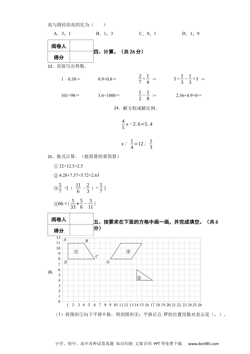 小学、初中、高中各种试卷真题知识归纳文案合同PPT等免费下载www.doc985.com河南省商丘市夏邑县2023年小升初数学试卷姓名:__________班级:__________考号:__________题号一二三四五六总分评分阅卷人一、填一填。(每空1分,共24分。)得分1.一个数由3个亿、6个千万、5个十万和8个百组成,这个数写作,读作;改写成以“万”作单位的数是万,省略“亿”位后面的尾数约是亿。2.3:8=12÷=()24=%=(填小数)。3.35:9化成最简整数比是,比值是。4.有一个数,它既是12的因数,又是12的倍数,这个数是;从这个数的因数中,选出两个质数和两个合数,把它们组成一个比例是。5.5米增加它的15是米,米增加15米是5米.6.三角形的一个内角是60°,另两个内角度数的比是1:5,这个三角形最大的内角是°,它是一个三角形.7.如图中,已知圆的半径是1cm,正方形面积是cm2,阴影部分的面积是cm2.8.口袋里有4个黄球、1个白球和2个红球,球除颜色外完全相同,从中任意摸出1个球,摸出球的可能性最大,要使摸出白球和红球的可能性相同,可以。9.用橡皮泥做一个正方体,棱长是4cm。如果把它捏成一个高8cm的长方体,长方体的底面积是cm²;在体积不变的情况下,长方体的高和底面积成比例。10.用小棒按如图方式摆三角形。小学、初中、高中各种试卷真题知识归纳文案合同PPT等免费下载www.doc985.com按照这样的方式摆下去,摆第5个图形需要根小棒;摆第n个图形需要根小棒。阅卷人二、判断。(共6分)得分11.真分数都小于1,假分数都大于1。12.同时是2、3、5倍数的最小三位数是120。()13.过直线外一点可以画无数条直线与已知直线垂直。()14.一个等腰三角形的一个腰和底边的长度可以是5cm和8cm。()15.把12米长的绳子剪成相等的两段,每段是全长的14。()16.把6克盐溶解在100克水中,这时盐水的含盐率是6%。()阅卷人三、选择。(将正确答案的序号填在括号里。)(共12分)得分17.下面的算式中,()的得数最大。(a是大于0的自然数)A.a×89B.a÷89C.a×(1﹣89)D.a÷(1﹣89)18.下列说法中,正确的是()A.1900年是闰年B.0既不是正数,也不是负数C.两个质数的积一定是奇数D.正方形和三角形都是轴对称图形19.某小学操场长108米,宽64米,画在练习本上,选比例尺()比较合适。A.1:20B.1:200C.1:2000D.1:1000020.在一个棱长6cm的正方体盒子中摆棱长2cm的正方体小方块,最多可以摆()块。A.3B.9C.27D.5421.一本书打六折出售,比原价便宜了5.4元。这本书原价是()元。A.13.5B.9C.8.64D.2.1622.一个圆柱与圆锥体的体积相等,圆柱的底面积是圆锥体的底面积的3倍,圆锥体的小学、初中、高中各种试卷真题知识归纳文案合同PPT等免费下载www.doc985.com高与圆柱的高的比为()A.3:1B.1:3C.9:1D.1:9阅卷人四、计算。(共26分)得分23.直接写出得数。10.38﹣=0.9×0.8=27÷14=1÷13−13÷1=101×98=3.6÷1000=12−18=2.56×4.9×0=24.解方程或解比例。45x−2.6=5.4x:14=12:1325.脱式计算。(能简算的要简算)①32×12.5×2.5②4.28+7.37+5.72+2.63③57÷[(116-23)×57]④66×(533+56−311)阅卷人五、按要求在下面的方格中画一画,并完成填空。(共6分)得分26.(1)将图形①向下平移6格,得到图形④;平移后点B'的位置用数对表示是(,)。小学、初中、高中各种试卷真题知识归纳文案合同PPT等免费下载www.doc985.com(2)将图形②绕点O顺时针旋转90°,得到的图形⑤。(3)将图形③按3:1放大画在方格纸上,得到图形⑥;图形③的面积是图形⑥面积的。(填分数)(4)在上面方格图的右上方,画出如图立体图形从上面看到的形状。阅卷人六、解决问题。(共26分)得分27.如图:用塑料绳捆扎一个圆柱形的蛋糕盒,打结处正好是底面圆心,打结用去绳子长25厘米。(1)捆扎这个蛋糕盒至少用去塑料绳多少厘米?(2)在蛋糕盒整个侧面贴上商标和说明,贴商标和说明部分的面积是多少平方厘米?28.一个圆锥形小麦堆,底面周长是12.56米,高是3米,每立方米小麦重750千克。这堆小麦占地面积是多少平方米?这堆小麦重多少吨?29.一本百...