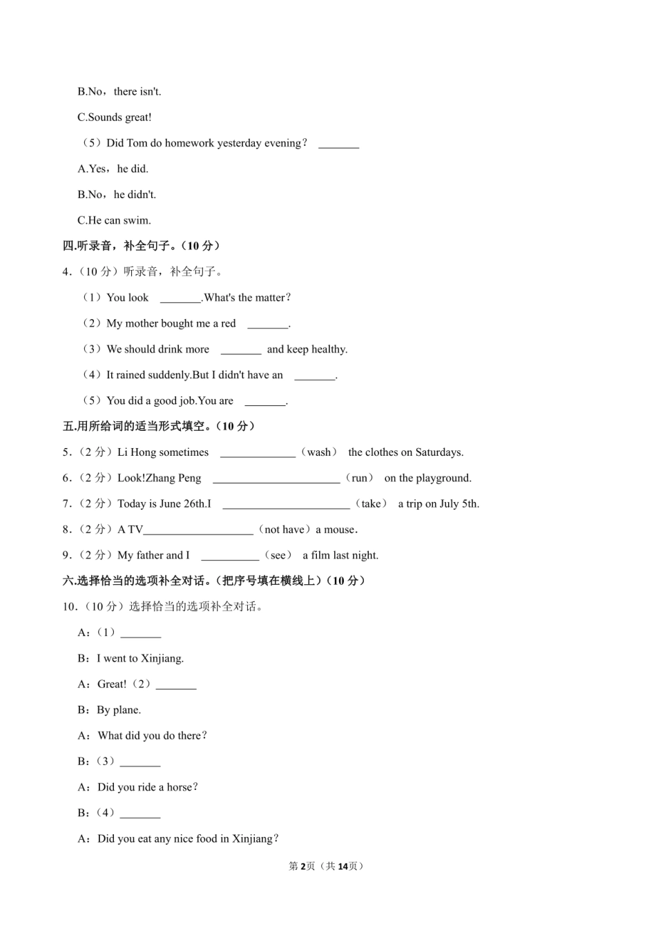 六年级下册英语期中测试卷.doc