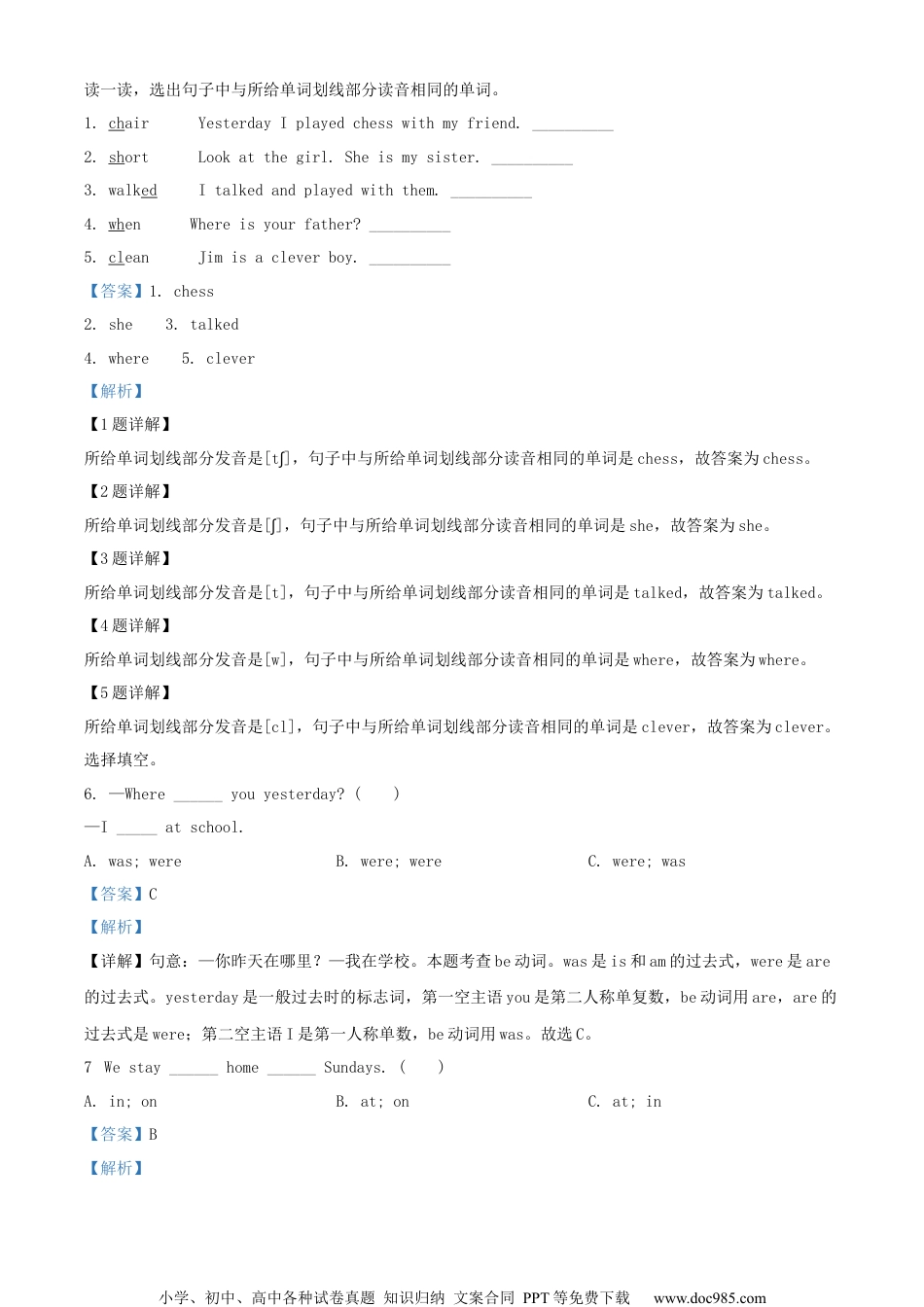 小学、初中、高中各种试卷真题知识归纳文案合同PPT等免费下载www.doc985.com河南省三门峡市灵宝市2022年人教PEP版小学毕业考试英语试卷听力部分(30分)一、听句子选出句中包含的单词,把序号写在题前括号内。读三遍。(10分)()1.A.besideB.betweenC.behindD.under()2.A.sunB.sonC.moonD.sky()3.A.robotB.roadC.carrotD.right()4.A.sawB.saidC.seeD.say()5.A.tastyB.deliciousC.healthyD.nice二、听对话选出正确的答语,把序号写在题前括号内。读三遍。(10分)()1.What’sMike’sfavouriteclass?A.MathsB.PE()2.WhydoesthegirllikeherEnglishteacherbest?A.BecauseshecanplayinterestinggamesandreadmanyEnglishstoriesinclass.B.Becausesheoftenanswersverydifficultquestions.()3.Whatwastheboylikebefore?A.Hewasshort.Hecouldn’tridebikewell.B.Hewastall.Hecouldgocyclingeveryday.()4.Howdidtheygotothehill?A.BybusB.Bycar()5.Howarethecherries(樱桃)?A.Theyarered,tastyandhealthy.B.Theyaresmall,longanddelicious.三、听短文,判断正(T)误(F)。读三遍。(10分)()1.Mike’sfamilywenttoKunmingbytaxi.()2.ThedrivertoldMikemanythingsaboutKunming.()3.Mikelefthisbaginthetaxi.()4.Mikewassadtoseethetaxidriveragain.()5.Thedriverdidn’tgiveMikethebagatlast.小学、初中、高中各种试卷真题知识归纳文案合同PPT等免费下载www.doc985.com读一读,选出句子中与所给单词划线部分读音相同的单词。1.chairYesterdayIplayedchesswithmyfriend.__________2.shortLookatthegirl.Sheismysister.__________3.walkedItalkedandplayedwiththem.__________4.whenWhereisyourfather?__________5.cleanJimisacleverboy.__________【答案】1.chess2.she3.talked4.where5.clever【解析】【1题详解】所给单词划线部分发音是[t]ʃ,句子中与所给单词划线部分读音相同的单词是chess,故答案为chess。【2题详解】所给单词划线部分发音是[]ʃ,句子中与所给单词划线部分读音相同的单词是she,故答案为she。【3题详解】所给单词划线部分发音是[t],句子中与所给单词划线部分读音相同的单词是talked,故答案为talked。【4题详解】所给单词划线部分发音是[w],句子中与所给单词划线部分读音相同的单词是where,故答案为where。【5题详解】所给单词划线部分发音是[cl],句子中与所给单词划线部分读音相同的单词是clever,故答案为clever。选择填空。6.—Where______youyesterday?()—I_____atschool.A.was;wereB.were;wereC.were;was【答案】C【解析】【详解】句意:—你昨天在哪里?—我在学校。本题考查be动词。was是is和am的过去式,were是are的过去式。yesterday是一般过去时的标志词,第一空主语you是第二人称单复数,be动词用are,are的过去式是were;第二空主语I是第一人称单数,be动词用was。故选C。7.Westay______home______Sundays.()A.in;onB.at;onC.at;in【答案】B【解析】小学、初中、高中各种试卷真题知识归纳文案合同PPT等免费下载www.doc985.com【详解】句意:我们周天待在家里。本题考查动词组和介词辨析。待在家里stayathome,排除A;星期前用介词on,排除选项C,选项B符合题意,故选B。8.—WhereisJohn?()—Heisbuyingbooksinthe______.A.bookshopB.museumC.hotel【答案】A【解析】【详解】句意:—约翰在哪?—他正______买书。本题考查名词辨析,A书店,B博物馆,C旅馆,根据常识得知买书去书店,故选A。9.—Doyoulikeeatingvegetables?()—Yes,becausetheyare______.A.friendlyB.favouriteC.healthy【答案】C【解析】【详解】句意:—你喜欢吃蔬菜吗?—是的,因为它们是______。本题考查形容词辨析。A友好的,B最喜爱的,C健康的,选项C符合题意,故选C。10.—Howwasyourholiday?()—______A.Iwenttherebybus.B.Itwasinteresting.C.Iboughtsomepresentsformyfriends.【答案】B【解析】【详解】句意:—你的假期怎么样?—_________本题考查特殊疑问句的答语,A我乘公交车去的那。B很有趣。C我给朋友们买了一些礼物。题干是询问假期怎样,故选B。11.—Whatcanyouseeinthepictu...