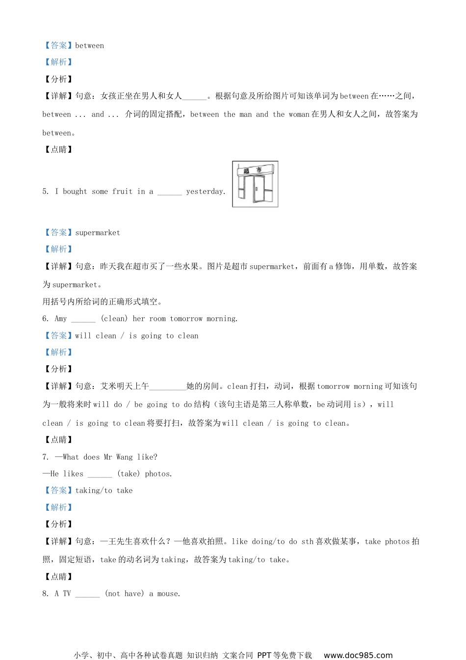 小学、初中、高中各种试卷真题知识归纳文案合同PPT等免费下载www.doc985.com2020年河南省洛阳市吉利区科普版小升初考试英语试卷听力部分(30分)1.听句子,选出句子中所听到的关键词或短语。(读两遍)(10分)()1.A.SaturdayB.holidayC.Friday()2.A.umbrellasB.clothesC.sweater()3.A.knifeB.wifeC.deaf()4.A.boughtB.tookC.made()5.A.threeB.betweenC.queen()6.A.buildB.surprisedC.tired()7.A.laughatB.stayupC.worryabout()8.A.writealetterB.seeafilmC.takephotos()9.A.travelingtoB.waitingforC.lookingfor()10.A.trythemonB.putonthedressC.getonthebusⅡ.听录音,看图标序号。(读两遍)(10分)()()()()()Ⅲ.听录音,判断所听到的内容与图片是否一致,一致的打“√”,不一致的打“×”。(读两遍)(5分)1.()2.()3.()4.()5.()Ⅳ.听录音,选择所听到的单词将短文补充完整。(读两遍)(5分)howcatchlivedwalkedafraidOncethere______aking.Helovedbirdsverymuch.Everymorninghe______inhisgardenandwatchedthem.Heoftensaid,"Oh,______beautifulthebirdsare!"ButGus,theking'sson,alwaystriedto______thebirds.Thebirdswere______ofhim.Everytimehecame,thebirdsflewaway.看图片,补全句子。每空一词。小学、初中、高中各种试卷真题知识归纳文案合同PPT等免费下载www.doc985.com1.—I'mthirsty(口渴).Couldyougivemeaglassof______?—Hereyouare.【答案】water【解析】【详解】句意:—我口渴了。你能该我一杯_____?—给你。根据图片可知是一杯水aglassofwater,water水,不可数名词,故答案为water。2.Wehadto______athomeforalongtimethiswinterholidaybecausetherewasseriousvirus(严重的病毒).【答案】stay【解析】【详解】句意:今年冬天我们不得不_____家里很长一段时间,因为有严重的病毒。根据图片及句意可知该空填stay,stayathome呆在家里,hadto后跟动词原形,故答案为stay。3.—Whatdoesyourfatherdo?—Heisa______driver.【答案】taxi【解析】【分析】【详解】句意:—你的爸爸是做什么的?—他是一名___司机。根据所给的图片,可知考查单词taxi出租车,名词,taxidriver出租车司机,名词词组,故答案为taxi。【点睛】4.Thegirlissitting______themanandthewoman.小学、初中、高中各种试卷真题知识归纳文案合同PPT等免费下载www.doc985.com【答案】between【解析】【分析】【详解】句意:女孩正坐在男人和女人______。根据句意及所给图片可知该单词为between在……之间,between...and...介词的固定搭配,betweenthemanandthewoman在男人和女人之间,故答案为between。【点睛】5.Iboughtsomefruitina______yesterday.【答案】supermarket【解析】【详解】句意:昨天我在超市买了一些水果。图片是超市supermarket,前面有a修饰,用单数,故答案为supermarket。用括号内所给词的正确形式填空。6.Amy______(clean)herroomtomorrowmorning.【答案】willclean/isgoingtoclean【解析】【分析】【详解】句意:艾米明天上午_________她的房间。clean打扫,动词,根据tomorrowmorning可知该句为一般将来时willdo/begoingtodo结构(该句主语是第三人称单数,be动词用is),willclean/isgoingtoclean将要打扫,故答案为willclean/isgoingtoclean。【点睛】7.—WhatdoesMrWanglike?—Helikes______(take)photos.【答案】taking/totake【解析】【分析】【详解】句意:—王先生喜欢什么?—他喜欢拍照。likedoing/todosth喜欢做某事,takephotos拍照,固定短语,take的动名词为taking,故答案为taking/totake。【点睛】8.ATV______(nothave)amouse.小学、初中、高中各种试卷真题知识归纳文案合同PPT等免费下载www.doc985.com【答案】doesn'thave【解析】【详解】句意:电视没有鼠标。根据句意可知句子是一般现在时,aTV是第三人称单数,根据所给单词可知句子是否定句,助动词用doesn't,doesn't后跟动词原形,故答案为doesn'thave。9.It'stwelveo'clock.We______(have)lunchnow.【答案】arehaving【解析】【分析】【详解】句意:现在是十二点。我们现在正在吃午饭。根据句中的now,可知句...
