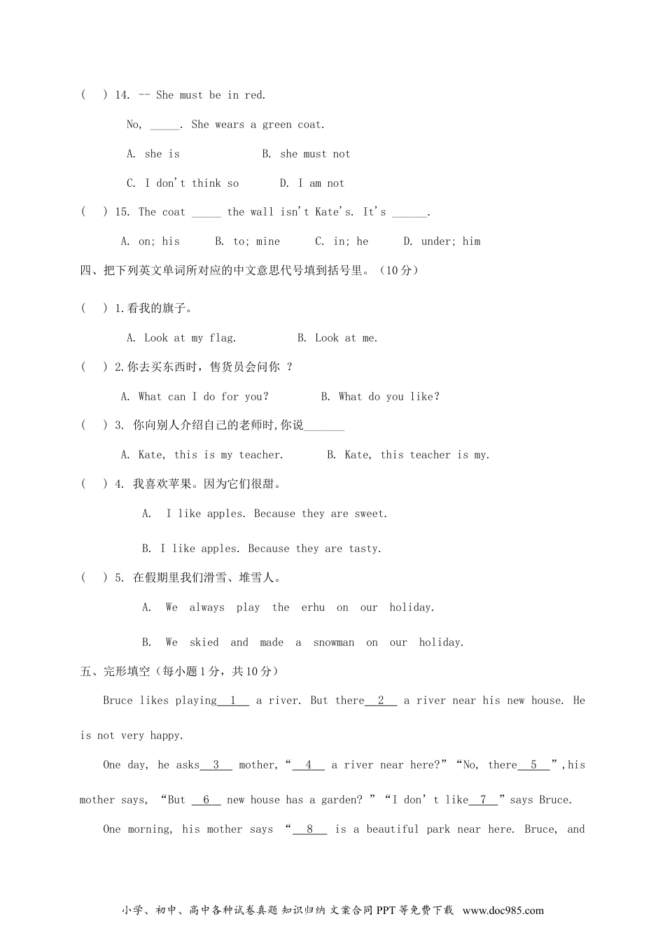 2018年河南小升初英语真题及答案(试卷满分100分,考试时间60分钟)一、找出下列画线部分发音与所给词相同的单词写序号。(5分)()1.catA.whatB.mapC.name()2.whoA.noB.boxC.soon()3.smallA.shortB.watchC.wall()4.colourA.pencilB.lookC.school()5.whatA.wantB.nameC.have二、词组互译。(共15分,每小题1.5分)1.下周____________2.小心_______________2.看电视___________4.太大____________5.滑冰_____________6.getreadfor___________7.tooheavy________8.bycar_____________9.apairofpants________10.makelunch______________三、选择填空。(30分)()1.Thedoctorisverytired____heisstillworkingveryhard.A.butB.ifC.onlyD.when()2.____boyheis!A.WhatagoodB.WhatgoodC.HowgoodD.Howagood()3.Imustfinishmyhomeworkfirst.CanIgotherealittle____?A.earlyB.earlierC.lateD.later()4.It’snotfar.It’sonlyten____walk.A.minuteB.minute’sC.minutes’D.minutes()5.IlikethesummerinBeijing,butmyfather____.小学、初中、高中各种试卷真题知识归纳文案合同PPT等免费下载www.doc985.comA.isn’tB.notlikeC.likesnotD.doesn’t()6.Classbegins.Pleasestop____.A.talkB.talkingC.totalkD.talks()7.Iwouldyou____togetherwithme.A.playB.willplayC.toplayD.playing()8.---Iwasillinbedyesterday.---_____.A.I’mgladtohearthatB.ThanksalotC.I’msorrytohearthatD.Congratulations()9.Benoften____football____theweekend,but___hardon___.A.play;at;study;weekdaysB.plays;at;studies;weekdaysC.plays;on;studies;weekendD.plaies;at;studys;weekday()10.--_______arehisfootballclothes?--Underthebed.A.WhereB.WhoC.WhoseD.What()11.Icansee______inLucy'sroom.A.otherthingB.anyotherthingC.somethingD.someotherthings()12.Theseare______.Youcanbuyapairforyourmother.A.womansockB.womensockC.womensocksD.womansocks()13.--Thankyouverymuch!--________.A.You'rerightB.AllrightC.YouarewelcomeD.OK.小学、初中、高中各种试卷真题知识归纳文案合同PPT等免费下载www.doc985.com()14.--Shemustbeinred.No,_____.Shewearsagreencoat.A.sheisB.shemustnotC.Idon'tthinksoD.Iamnot()15.Thecoat_____thewallisn'tKate's.It's______.A.on;hisB.to;mineC.in;heD.under;him四、把下列英文单词所对应的中文意思代号填到括号里。(10分)()1.看我的旗子。A.Lookatmyflag.B.Lookatme.()2.你去买东西时,售货员会问你?A.WhatcanIdoforyou?B.Whatdoyoulike?()3.你向别人介绍自己的老师时,你说_______A.Kate,thisismyteacher.B.Kate,thisteacherismy.()4.我喜欢苹果。因为它们很甜。A.Ilikeapples.Becausetheyaresweet.B.Ilikeapples.Becausetheyaretasty.()5.在假期里我们滑雪、堆雪人。A.Wealwaysplaytheerhuonourholiday.B.Weskiedandmadeasnowmanonourholiday.五、完形填空(每小题1分,共10分)Brucelikesplaying1ariver.Butthere2arivernearhisnewhouse.Heisnotveryhappy.Oneday,heasks3mother,“4arivernearhere?”“No,there5”,hismothersays,“But6newhousehasagarden?”“Idon’tlike7”saysBruce.Onemorning,hismothersays“8isabeautifulparknearhere.Bruce,and小学、初中、高中各种试卷真题知识归纳文案合同PPT等免费下载www.doc985.comthere9twopoolsinit.We’llgotherethisafternoon.”Bruceisveryhappy.Afterlunch,Bruceandhismother10thepark,andheplaysinoneofthepools.Hehasaverygoodtime.()1.A.atB.toC.inD.from()2.A.isn’tB.isC.aren’tD.are()3.A.herB.hisC.ourD.their()4.A.ThereisB.ArethereC.ThereareD.Isthere()5.A.isn’tB.isC.aren’tD.are()6.A.yourB.myC.ourD.us()7.A.youB.meC.themD.it()8.A.TheyB.ItC.ThisD.There()9.A.isB.areC.isn’tD.aren’t()10.A.gotoB.comestoC.toD.come六、短文理解。(20分)(一)根据短文内容,判断下面句子的正(T)误(F)。(10分)It'sSundaymorning.ThestudentsofClass3aregivingtheirclassroomagoodcleaning.MissHuang,th...