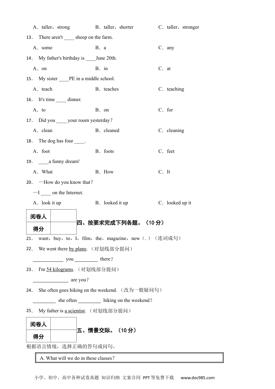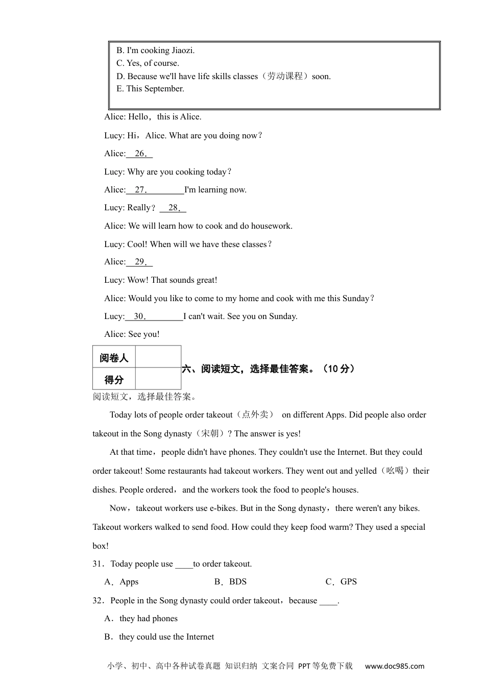 小学、初中、高中各种试卷真题知识归纳文案合同PPT等免费下载www.doc985.com河南省新乡市辉县市2023年小升初英语试卷姓名:__________班级:__________考号:__________题号一二三四五六七总分评分阅卷人一、找出每组单词中不同类的一项。(5分)得分找出每组单词中不同类的一项。1.A.biggerB.farmerC.tallerD.younger2.A.sleptB.cleanedC.tookD.worried3.A.playB.badmintonC.footballD.basketball4.A.himB.mineC.hersD.theirs5.A.todayB.tomorrowC.atnightD.yesterday阅卷人二、用所给单词的适当形式填空。(10分)得分6.There(be)aboy,twogirlsandtenmeninthepark.7.Listen!Who(play)thepipa?8.LinTaousually(study)Englishontheweekend.9.Thispencilis(he).10.I(buy)somegiftsformyfriendslastweekend.阅卷人三、选择填空。(10分)得分11.—Whoseskirtisthis?—____A.It'sred.B.It'sAmy's.C.It'sher.12.Heis____and____thanme.小学、初中、高中各种试卷真题知识归纳文案合同PPT等免费下载www.doc985.comA.taller,strongB.taller,shorterC.taller,stronger13.Therearen't____sheeponthefarm.A.someB.aC.any14.Myfather'sbirthdayis____June20th.A.onB.inC.at15.Mysister____PEinamiddleschool.A.teachB.teachesC.teaching16.It'stime____dinner.A.toB.onC.for17.Didyou____yourroomyesterday?A.cleanB.cleanedC.cleaning18.Thedoghasfour____.A.footB.footsC.feet19.____afunnydream!A.WhatB.HowC.It20.—Howdoyouknowthat?—I____ontheInternet.A.lookitupB.lookeditupC.lookedupit阅卷人四、按要求完成下列各题。(10分)得分21.want,buy,to,I,film,the,magazine,new(.)(连词成句)22.Wewenttherebyplane.(对划线部分提问)youthere?23.I'm54kilograms.(对划线部分提问)areyou?24.Sheoftengoeshikingontheweekend.(改为一般疑问句)sheoftenhikingontheweekend?25.Myfatherisascientist.(对划线部分提问)阅卷人五、情景交际。(10分)得分根据语言情境,选择正确的答句或问句。A.Whatwillwedointheseclasses?小学、初中、高中各种试卷真题知识归纳文案合同PPT等免费下载www.doc985.comB.I'mcookingJiaozi.C.Yes,ofcourse.D.Becausewe'llhavelifeskillsclasses(劳动课程)soon.E.ThisSeptember.Alice:Hello,thisisAlice.Lucy:Hi,Alice.Whatareyoudoingnow?Alice:26.Lucy:Whyareyoucookingtoday?Alice:27.I'mlearningnow.Lucy:Really?28.Alice:Wewilllearnhowtocookanddohousework.Lucy:Cool!Whenwillwehavetheseclasses?Alice:29.Lucy:Wow!Thatsoundsgreat!Alice:WouldyouliketocometomyhomeandcookwithmethisSunday?Lucy:30.Ican'twait.SeeyouonSunday.Alice:Seeyou!阅卷人六、阅读短文,选择最佳答案。(10分)得分阅读短文,选择最佳答案。Todaylotsofpeopleordertakeout(点外卖)ondifferentApps.DidpeoplealsoordertakeoutintheSongdynasty(宋朝)?Theanswerisyes!Atthattime,peopledidn'thavephones.Theycouldn'tusetheInternet.Buttheycouldordertakeout!Somerestaurantshadtakeoutworkers.Theywentoutandyelled(吆喝)theirdishes.Peopleordered,andtheworkerstookthefoodtopeople'shouses.Now,takeoutworkersusee-bikes.ButintheSongdynasty,thereweren'tanybikes.Takeoutworkerswalkedtosendfood.Howcouldtheykeepfoodwarm?Theyusedaspecialbox!31.Todaypeopleuse____toordertakeout.A.AppsB.BDSC.GPS32.PeopleintheSongdynastycouldordertakeout,because____.A.theyhadphonesB.theycouldusetheInternet小学、初中、高中各种试卷真题知识归纳文案合同PPT等免费下载www.doc985.comC.restaurantshadtakeoutworkers33.IntheSongdynasty,takeoutworkerssent(配送)food____.A.onfootB.bybikeC.bycar34.IntheSongdynasty,takeoutworkers____tokeepfoodwarm.A.walkedslowlyB.usedaspecialboxC.rodeabike35.W...