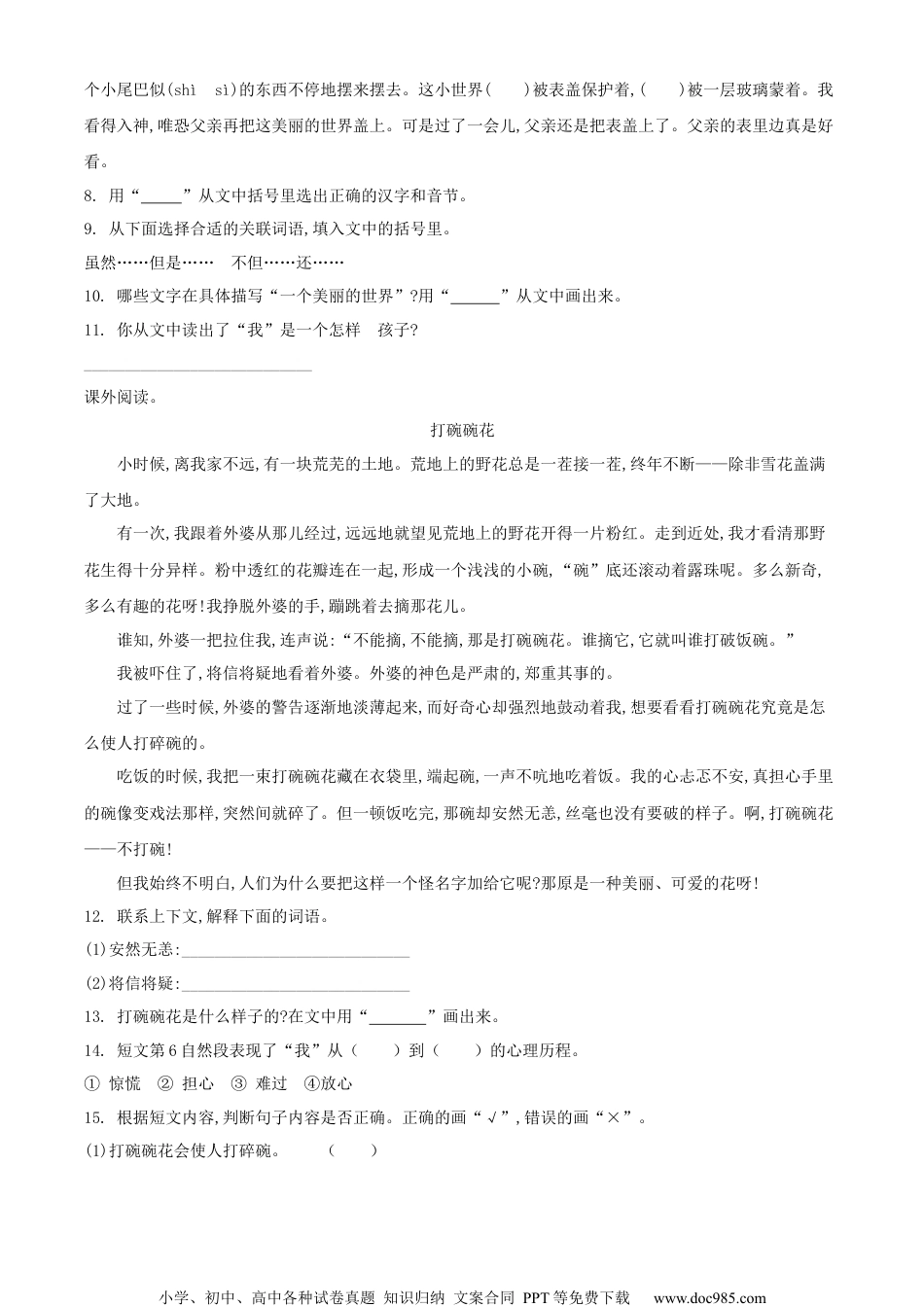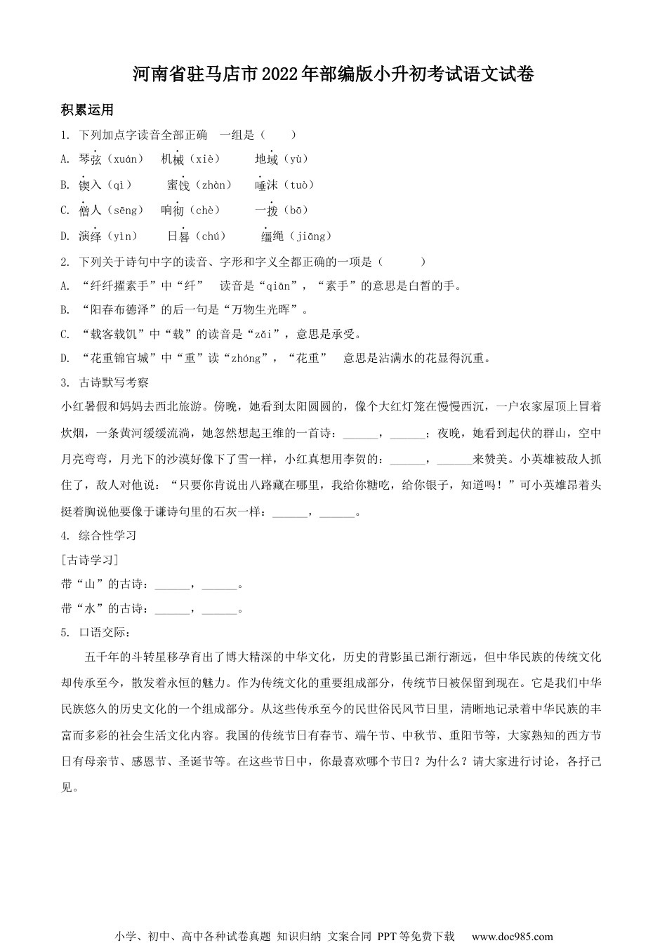 小学、初中、高中各种试卷真题知识归纳文案合同PPT等免费下载www.doc985.com河南省驻马店市2022年部编版小升初考试语文试卷积累运用1.下列加点字读音全部正确的一组是()A.琴弦(xuán)机械(xiè)地域(yù)B.锲入(qì)蜜饯(zhàn)唾沫(tuò)C.僧人(sēng)响彻(chè)一拨(bō)D.演绎(yìn)日晷(chú)缰绳(jiāng)2.下列关于诗句中字的读音、字形和字义全都正确的一项是()A.“纤纤擢素手”中“纤”的读音是“qiān”,“素手”的意思是白皙的手。B.“阳春布德泽”的后一句是“万物生光晖”。C.“载客载饥”中“载”的读音是“zǎi”,意思是承受。D.“花重锦官城”中“重”读“zhóng”,“花重”的意思是沾满水的花显得沉重。3.古诗默写考察小红暑假和妈妈去西北旅游。傍晚,她看到太阳圆圆的,像个大红灯笼在慢慢西沉,一户农家屋顶上冒着炊烟,一条黄河缓缓流淌,她忽然想起王维的一首诗:______,______;夜晚,她看到起伏的群山,空中月亮弯弯,月光下的沙漠好像下了雪一样,小红真想用李贺的:______,______来赞美。小英雄被敌人抓住了,敌人对他说:“只要你肯说出八路藏在哪里,我给你糖吃,给你银子,知道吗!”可小英雄昂着头挺着胸说他要像于谦诗句里的石灰一样:______,______。4.综合性学习[古诗学习]带“山”的古诗:______,______。带“水”的古诗:______,______。5.口语交际:五千年的斗转星移孕育出了博大精深的中华文化,历史的背影虽已渐行渐远,但中华民族的传统文化却传承至今,散发着永恒的魅力。作为传统文化的重要组成部分,传统节日被保留到现在。它是我们中华民族悠久的历史文化的一个组成部分。从这些传承至今的民世俗民风节日里,清晰地记录着中华民族的丰富而多彩的社会生活文化内容。我国的传统节日有春节、端午节、中秋节、重阳节等,大家熟知的西方节日有母亲节、感恩节、圣诞节等。在这些节日中,你最喜欢哪个节日?为什么?请大家进行讨论,各抒己见。小学、初中、高中各种试卷真题知识归纳文案合同PPT等免费下载www.doc985.com_____________________________________________根据要求,完成句子。6.选词填空。反应反映(1)请你把这件事()给校长,他会解决的。(2)老板转身拿起一块面包,见我没有(),以为我嫌少。7.用合适的关联词语把下面两句话连成一句话,并用这个关联词语造句。我们为人民的利益坚持好的,为人民的利益改正错的。我们这个队伍一定会兴旺起来。(1)连句:____________________________(2)造句:____________________________阅读理解课内阅读。没有请求,父亲就自动给我看,我高兴极了,同时我的心也加速跳动。父亲取出一把小刀,把表盖(拔拨)开,我的面前立即呈现出一个美丽的世界:蓝色的、红色的小宝石,钉住几个金黄色的齿轮,里边还有一小学、初中、高中各种试卷真题知识归纳文案合同PPT等免费下载www.doc985.com个小尾巴似(shìsì)的东西不停地摆来摆去。这小世界()被表盖保护着,()被一层玻璃蒙着。我看得入神,唯恐父亲再把这美丽的世界盖上。可是过了一会儿,父亲还是把表盖上了。父亲的表里边真是好看。8.用“”从文中括号里选出正确的汉字和音节。9.从下面选择合适的关联词语,填入文中的括号里。虽然……但是……不但……还……10.哪些文字在具体描写“一个美丽的世界”?用“”从文中画出来。11.你从文中读出了“我”是一个怎样的孩子?____________________________课外阅读。打碗碗花小时候,离我家不远,有一块荒芜的土地。荒地上的野花总是一茬接一茬,终年不断——除非雪花盖满了大地。有一次,我跟着外婆从那儿经过,远远地就望见荒地上的野花开得一片粉红。走到近处,我才看清那野花生得十分异样。粉中透红的花瓣连在一起,形成一个浅浅的小碗,“碗”底还滚动着露珠呢。多么新奇,多么有趣的花呀!我挣脱外婆的手,蹦跳着去摘那花儿。谁知,外婆一把拉住我,连声说:“不能摘,不能摘,那是打碗碗花。谁摘它,它就叫谁打破饭碗。”我被吓住了,将信将疑地看着外婆。外婆的神色是严肃的,郑重其事的。过了一些时候,外婆的警告逐渐地淡薄起来,而好奇心却强烈地鼓动着我,想要看看打碗碗花究竟是怎么使人打碎碗的。...