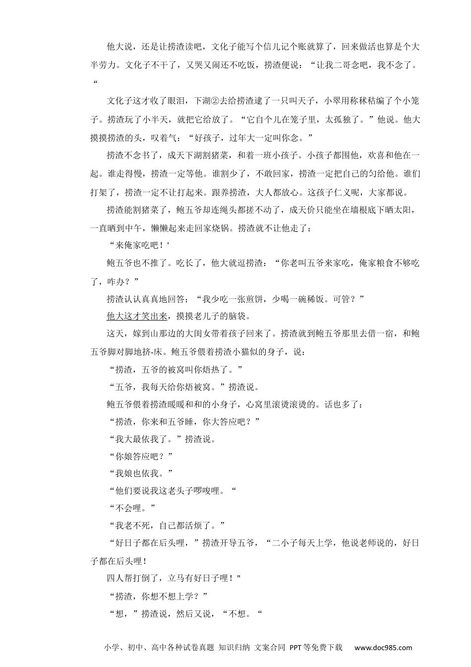 小学、初中、高中各种试卷真题知识归纳文案合同PPT等免费下载www.doc985.com河南省郑州市中原区名校2022年小升初语文招生选拔试卷姓名:__________班级:__________考号:__________题号一二三总分评分阅卷人一、基础知识积累及运用(26分)得分1.给下面的加点字注音或根据拼音写汉字。羽扇纶巾练习簿惩罚zào热目不xiá接dī防2.古诗文默写。(1)少壮不努力,。(2)己所不欲,。(3)路漫漫其修远兮,。(4)读书破万卷,。(5)洛阳亲友如相问,。(6)我劝天公重抖擞,。3.修改下列病句,将修改意见写在下面横线上。(1)《虎妈猫爸》这部电视剧之所以受到广大家长热捧的重要原因,是因为它反映了当下子女教育的热点问题,非常接地气。(2)通过中国诗词大会,使人们重拾诗词之美,也就越发珍惜诗词这一国之瑰宝。4.仔细观察下面的漫画《帮儿子做作业》,完成图文转换。小学、初中、高中各种试卷真题知识归纳文案合同PPT等免费下载www.doc985.com(1)请用简洁的语言概括漫画写了一个什么故事,交代清楚故事的起因,经过,结果。起因:经过:结果:(2)《帮儿子做作业》表现的是一个的父亲。(3)漫画《帮儿子写作业》,有译者翻译为《糟透了的家庭作业》,你认为哪一种翻译妥当?说说理由。阅卷人二、现代文阅读(14分)得分课外阅读。耕读老师来动员捞渣上学了。捞渣七岁了,该上学了。可是文化子已经在公社上中学了。一家供不起两个学生。他大①说:要就是捞渣上,要就是文化子上。要早二年,就好办了,文化子巴不得不上学呢!可如今不同了,文化子不知咋的开了窍,一下子学进去了。从班上最后一名蹿到第一名。小鲍庄只有三名考上公社中学的,他就占了一名。他读书上劲多了。家里没有粮票给他带去吃食堂,他就每天来回跑,二十里路哩,中午带一卷煎饼,泡着茶吃,苦死了。捞渣也想读书。庄上在学校的孩子,脖子上都有一条红围脖,这就叫他羡幕。他虽然还不知晓这红围脖是啥意思,可他知道是叫人学好的。那天二小子的红围脖叫老师要回去了,因为他和人打仗,把人门牙敲掉了。可见,做了坏事是不能得的,反过来,就是做好事才能得红围脖了。小学、初中、高中各种试卷真题知识归纳文案合同PPT等免费下载www.doc985.com他大说,还是让捞渣读吧,文化子能写个信儿记个账就算了,回来做活也算是个大半劳力。文化子不干了,又哭又闹还不吃饭,捞渣便说:“让我二哥念吧,我不念了。“文化子这才收了眼泪,下湖②去给捞渣逮了一只叫天子,小翠用称秫秸编了个小笼子。捞渣玩了小半天,就把它给放了。“它自个儿在笼子里,太孤独了。”他说。他大摸摸捞渣的头,叹着气:“好孩子,过年大一定叫你念。”捞渣不念书了,成天下湖割猪菜,和着一班小孩子。小孩子都围他,欢喜和他在一起。谁走得慢,捞渣一定等他。谁割少了,不敢回家,捞渣一定把自己的匀给他。谁们打架了,捞渣一定不让打起来。跟养捞渣,大人都放心。这孩子仁义呢,大家都说。捞渣能割猪菜了,鲍五爷却连绳头都搓不动了,成天价只能坐在墙根底下晒太阳,一直晒到中午,懒懒起来走回家烧锅。捞渣就不让他走了:“来俺家吃吧!'鲍五爷也不推了。吃长了,他大就逗捞渣:“你老叫五爷来家吃,俺家粮食不够吃了,咋办?”捞渣认认真真地回答:“我少吃一张煎饼,少喝一碗稀饭。可管?”他大这才笑出来,摸摸老儿子的脑袋。这天,嫁到山那边的大闺女带着孩子回来了。捞渣就到鲍五爷那里去借一宿,和鲍五爷脚对脚地挤-床。鲍五爷偎着捞渣小猫似的身子,说:“捞渣,五爷的被窝叫你焐热了。”“五爷,我每天给你焐被窝。”捞渣说。鲍五爷偎着捞渣暖暖和和的小身子,心窝里滚烫滚烫的。话也多了:“捞渣,你来和五爷睡,你大答应吧?”“我大最依我了。”捞渣说。“你娘答应吧?”“我娘也依我。”“他们要说我这老头子啰唆哩。““不会哩。”“我老不死,自己都活烦了。”“好日子都在后头哩,”捞渣开导五爷,“二小子每天上学,他说老师说的,好日子都在后头哩!四人帮打倒了,立马有好日子哩!"“捞渣,你想不想上学?”“想,”捞渣说,然后又说,“不想。“小学、初中、高中各种试卷真题知识归纳文案合同PPT等免费下...