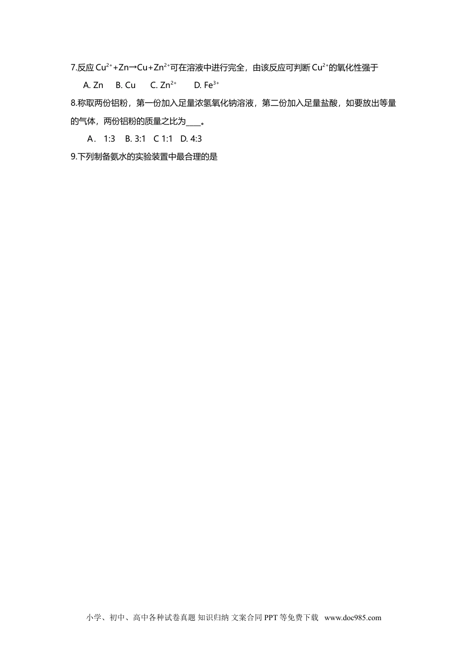 浦东新区2013~2014学年第一学期教学质量检测高三化学试卷2014.1考生注意:1.本试卷满分100分,考试时间60分钟。2.本考试设试卷和答题纸两部分,试卷包括试题与答题要求;所有答题必须涂(选择题)或写(非选择题)在答题纸上;做在试卷上一律不得分。3.答题前,考生务必在答题纸上用钢笔或圆珠笔清楚填写学校、班级、姓名、准考证号。4.答题纸与试卷在试题编号上是一一对应的,答题时应特别注意,不能错位。相对原子质量:H-1C-12N-14O-16Na-23Cl-35.5一、选择题(本题共10分,每小题2分,只有一个正确选项)1.下列金属化合物中最方便用于潜水艇舱内供氧的是A.KMnO4B.KClO3C.KNO3D.Na2O22.符号Cl中左上角的“35”代表A.元素的质量数B.原子的质量数C.元素的平均相对原子质量D.元素的近似相对原子质量3.HCl分子中氢氯键(H-Cl)的键能大约是HCl分子间范德华力的____倍。A.20B.2C.0.5D.0.054.下列关于甘油醛(1,2-二羟基丙醛)分子的写法中最合理的是A.OHCH2CH(OH)CHOB.HOCH2CH2(OH)CHOC.HOCH2CH(OH)COHD.HOCH2CH(OH)CHO5.设C+CO22CO-Q1反应速率为V1N2+3H22NH3+Q2反应速率为V2当温度升高时,速率变化情况为A.V1提高,V2下降B.V1、V2都提高C.V1下降,V2提高D.V1、V2都下降二、选择题(本题共36分,每小题3分,只有一个正确选项)6.在苯酚钠溶液中通入二氧化碳,发生反应:C6H5ONa+CO2+H2O→C6H5OH↓+NaHCO3,该反应证明苯酚钠的碱性强于A.苯酚B.碳酸钠C.碳酸氢钠D.氢氧化钠小学、初中、高中各种试卷真题知识归纳文案合同PPT等免费下载www.doc985.com7.反应Cu2++Zn→Cu+Zn2+可在溶液中进行完全,由该反应可判断Cu2+的氧化性强于A.ZnB.CuC.Zn2+D.Fe3+8.称取两份铝粉,第一份加入足量浓氢氧化钠溶液,第二份加入足量盐酸,如要放出等量的气体,两份铝粉的质量之比为____。A.1:3B.3:1C1:1D.4:39.下列制备氨水的实验装置中最合理的是小学、初中、高中各种试卷真题知识归纳文案合同PPT等免费下载www.doc985.com小学、初中、高中各种试卷真题知识归纳文案合同PPT等免费下载www.doc985.comA氯化铵和氢氧化钙蒸馏水碱石灰B氯化铵和氢氧化钙蒸馏水C氯化铵蒸馏水碱石灰D氯化铵和氢氧化钙蒸馏水小学、初中、高中各种试卷真题知识归纳文案合同PPT等免费下载www.doc985.com10.溴乙烷与硝酸银溶液混合,未见沉淀物发生,以下解释中理由最充分的是A.溴乙烷是共价化合物B.硝酸银是强电解质C.溴乙烷属非电解质D.溶液未酸化、未加热11.将碳棒和铁棒平行插入NaCl溶液,两棒的液面以上部分用铜丝相联并接入电流计,电流计指针偏转。以下说法正确的是A.电子自碳棒通过溶液流向铁棒B.电子自铁棒通过铜丝流向碳棒C.溶液中的H+得到电子放出H2D.铜丝失去电子发生氧化反应12.同分异构体指的是相同分子式不同分子结构的化合物,它描述的对象主体是化合物。同素异形体、同位素、同系物描述的对象主体依次为A.单质、原子、化合物B.元素、单质、化合物C.无机化合物、元素、有机化合物D.原子核、原子、分子13.在某水溶液样品中滴加氯化钡溶液,产生白色沉淀;再滴加盐酸,沉淀部分消失,并有无色无味的气体产生。由此判断该溶液中肯定不存在的离子是A.Ag+B.SO42-C.CO32-D.NH4+14.欲观察金属钠与苯酚间发生置换反应并在液体中产生气泡的现象,可首先将固态苯酚溶解在A.水中B.酒精中C.四氯化碳中D.煤油中15.将浓度均为0.2mol/L的CH3COOH和CH3COONa溶液等体积混合,混合液呈弱酸性,小学、初中、高中各种试卷真题知识归纳文案合同PPT等免费下载www.doc985.com0加水体积XY其中有三种微粒的浓度非常接近,这三种微粒是A.CH3COO-Na+CH3COOHB.CH3COO-CH3COOHH+C.CH3COOHOH-H+D.CH3COO-OH-H+16.NA表示阿佛加德罗常数。常温下,将下列气体通入1L水中直至饱和,溶液中溶质微粒数最接近0.1NA的是A.SO2B.CO2C.Cl2D.NH317.同是ⅤA族元素的单质,氮的熔点很低,铋的熔点较高,从物质结构来看,原因是A.氮为非金属,铋为金属B.氮的摩尔质量远低于铋的摩尔质量C.固态氮是分子晶体,而铋是金属晶体D.氮分子由叁键构成,铋原子通过金属键结合三、选择题(本题共20分,每小题4分,每小题有一个或两个正确选项。漏选给2分,错选不给分)18....