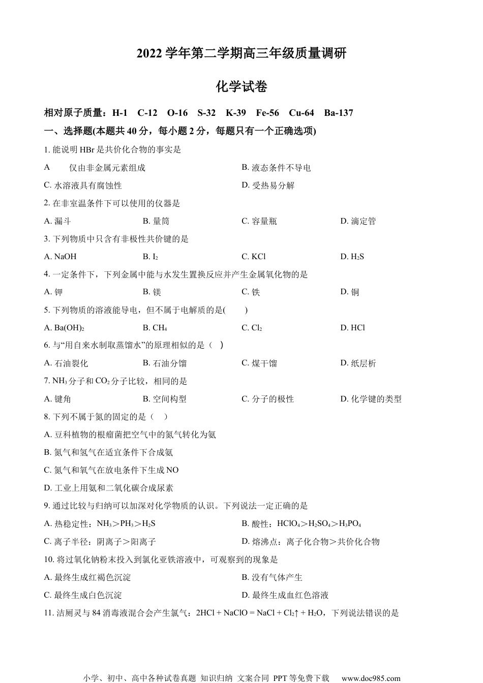 小学、初中、高中各种试卷真题知识归纳文案合同PPT等免费下载www.doc985.com2022学年第二学期高三年级质量调研化学试卷相对原子质量:H-1C-12O-16S-32K-39Fe-56Cu-64Ba-137一、选择题(本题共40分,每小题2分,每题只有一个正确选项)1.能说明HBr是共价化合物的事实是A.仅由非金属元素组成B.液态条件不导电C.水溶液具有腐蚀性D.受热易分解2.在非室温条件下可以使用的仪器是A.漏斗B.量筒C.容量瓶D.滴定管3.下列物质中只含有非极性共价键的是A.NaOHB.I2C.KClD.H2S4.一定条件下,下列金属中能与水发生置换反应并产生金属氧化物的是A.钾B.镁C.铁D.铜5.下列物质的溶液能导电,但不属于电解质的是()A.Ba(OH)2B.CH4C.Cl2D.HCl6.与“用自来水制取蒸馏水”的原理相似的是()A.石油裂化B.石油分馏C.煤干馏D.纸层析7.NH3分子和CO2分子比较,相同的是A.键角B.空间构型C.分子的极性D.化学键的类型8.下列不属于氮的固定的是()A.豆科植物的根瘤菌把空气中的氮气转化为氨B.氮气和氢气在适宜条件下合成氨C.氮气和氧气在放电条件下生成NOD.工业上用氨和二氧化碳合成尿素9.通过比较与归纳可以加深对化学物质的认识。下列说法一定正确的是A.热稳定性:NH3>PH3>H2SB.酸性:HClO4>H2SO4>H3PO4C.离子半径:阴离子>阳离子D.熔沸点:离子化合物>共价化合物10.将过氧化钠粉末投入到氯化亚铁溶液中,可观察到的现象是A.最终生成红褐色沉淀B.没有气体产生C.最终生成白色沉淀D.最终生成血红色溶液11.洁厕灵与84消毒液混合会产生氯气:2HCl+NaClO=NaCl+Cl2↑+H2O,下列说法错误的是小学、初中、高中各种试卷真题知识归纳文案合同PPT等免费下载www.doc985.comA.2molHCl反应将转移NA个电子B.n氧化剂:n还原剂=1:1C.NaClO作氧化剂,失去电子D.Cl2既是氧化产物又是还原产物12.制备下列物质过程中,净化除杂的有关操作(括号内是杂质)其中正确的是A.C2H4(SO2)——气体通过盛有溴水的洗气瓶B.CH3COOC2H5(CH3COOH)——用饱和Na2CO3溶液洗涤C.Cl2(HCl)——通过水洗,再干燥D.NH3(H2O)——浓H2SO4洗气13.将燃着的H2S不断通入盛有一定量O2的集气瓶中。当火焰熄灭后继续通入H2S,发生的主要反应是A.2H2S+O2=2S+2H2OB.2H2S+3O2=2SO2+2H2OC.2H2S+SO2=3S+2H2OD.2SO2+O2=2SO314.H2C=CH—CH=CH2通过一步反应不能得到A.B.C.D.CO215.乙炔的二聚体CH≡C-CH=CH2(乙烯基乙炔)是一种重要化工原料。下列关于CH≡C-CH=CH2说法错误的是A.其加聚产物还可以使溴水褪色B.与互为同分异构体C.催化加氢后所得烷烃的一氯代物有2种D.完全燃烧的耗氧量与等质量乙炔耗氧量相同16.从海带中提取碘元素的步骤中,选用的实验仪器不能都用到的是A.海带灼烧灰化,选用①②⑧B.加水浸泡加热,选用②④⑦C.过滤得到滤液,选用④⑤⑦D.萃取和分液,选用③④⑥17.铝空气电池因成本低廉、安全性高,有广阔的开发应用前景。一种铝空气电池放电过程示意如图,下列说法正确的是小学、初中、高中各种试卷真题知识归纳文案合同PPT等免费下载www.doc985.comA.b极为负极,放电时发生氧化反应B.电路中每转移4mol电子,消耗22.4L氧气C.放电时OH-往b极迁移D.该电池负极电极反应为:Al+4OH--3e-=AlO+2H2O18.室温下,用标准液0.01mol·L-1NaOH溶液滴定20.00ml0.01mol·L-1H2C2O4(二元弱酸)溶液,在滴定过程中有关说法正确的是A.当标准液滴到10.00mL时,溶液中存在[Na+]=[]B.滴定终点时,水电离的氢离子浓度为10-7mol·L-1C.pH=2的H2C2O4溶液中水电离的[H+]大于0.01mol·L-1NaOH溶液中水电离的[H+]D.滴定过程中始终存在[Na+]+[H+]=[]+2[]+[OH-]19.苯与Br2的催化反应历程如图所示。下列说法正确的是A.苯与Br2生成的反应为吸热反应B.图中,苯与Br2的催化反应生成了溴苯、邻二溴苯C.从图中所给信息看,生成比更稳定小学、初中、高中各种试卷真题知识归纳文案合同PPT等免费下载www.doc985.comD.由转化为的过程中有极性键的断裂与形成20.700℃时,向容积为2L的密闭容器中充入一定量的CO2(g)和H2(g),发生反应CO2(g)+3H2(g)CH3OH(g)+H2O(g)反应过程中测定的部分数据见表(表中t2>t1):反应时间/minn(CO2)/moln(H2)/mol00.601.80t10.20t20.60下列说法正确的是A.反应在0~t1min...