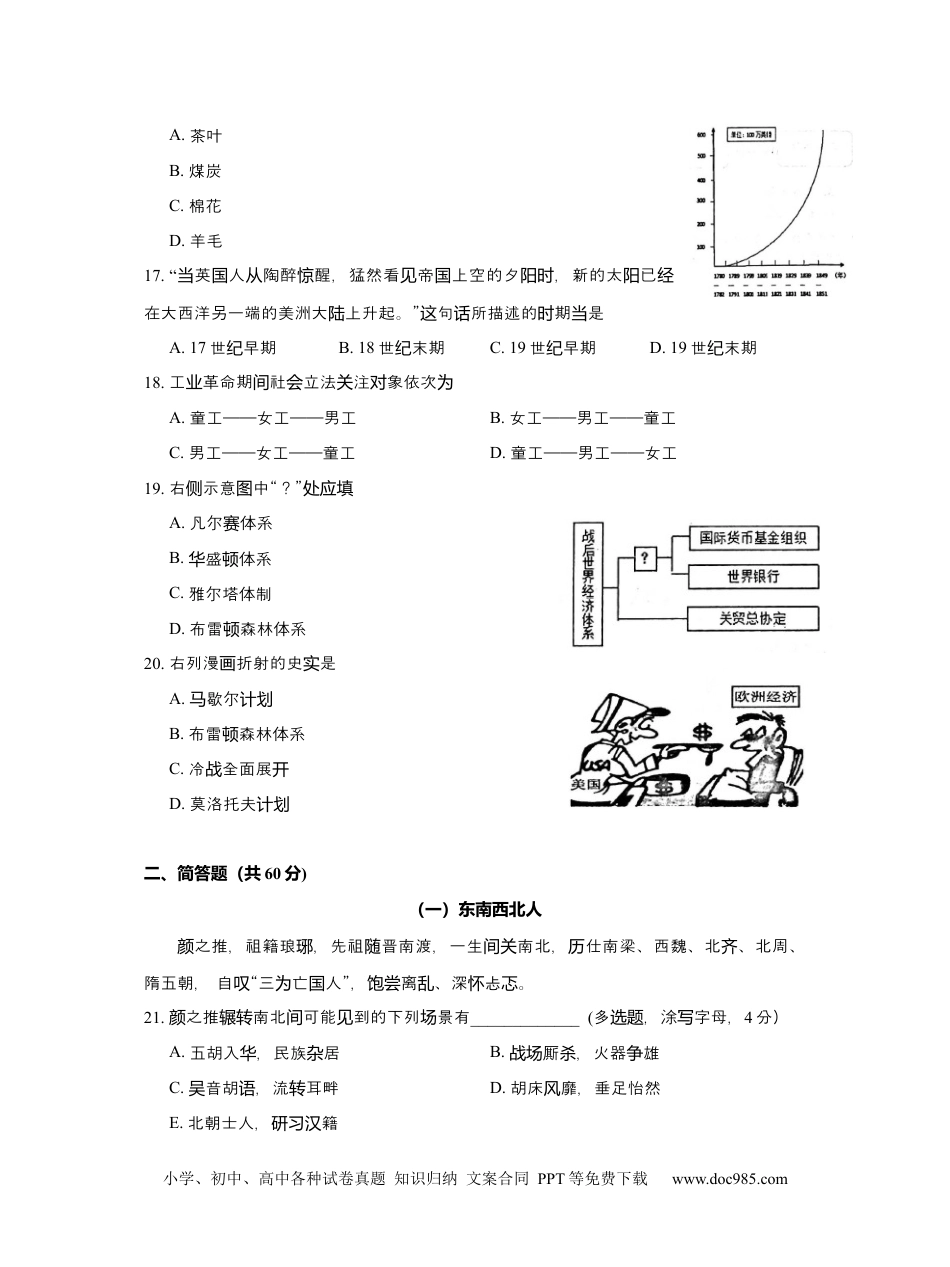 小学、初中、高中各种试卷真题知识归纳文案合同PPT等免费下载www.doc985.com青浦区2019-2020学年第一学期期末考质量监测高三年级历史学科试卷2019.12注意:1.本卷和答部分,所有答必在答上,做在卷上一律无效检测设试题纸两题须写题纸试。答卷上的一一,答特注意,不能位。题纸与试试题编号对应题时应别错2.检测时间60分,卷分钟试满100分。一、选择题(以下每小题2分,共40分,每只有一正确)题个选项1.“天子以印,又以玉,群臣莫敢用”,象始于独称玺独该现A.夏朝B.商朝C.周朝D.秦朝2.下列价最合右景的是诠释评贴图场当A.敬天保民B.民君贵轻C.懦尊学独D.道法自然3.据江南山越同居共耕的政位于下与权图处A.①B.②C.③D.④4.安西市址,被盛世商魂的。借助可长遗誉为见证它研究A.上之路陆丝绸B.海上之路丝绸C.榷制度场D.早期西学东渐5.下列政策一度引明朝出“市禁商而寇”象的是发现则转为现A.朝易贡贸B.海禁C.禁开D.闭关锁国6.史上“重一、形同宰相”的位是历权时职A.丞相B.刺史C.首内阁辅D.机大臣军7.右列句,推“晁”的身是阅读诗测监份当A.御史大夫B.密使枢……扶桑外,主人孤中。乡树岛离方域,音信若通。别异为——王《送秘晁日本》维书监还国小学、初中、高中各种试卷真题知识归纳文案合同PPT等免费下载www.doc985.comC.外公使国D.遣唐使8.察下列示意,按照正常序,“?观图时”入处应填A.辛亥革命B.宋仁遇刺案教C.护国运动D.洲建立伪满国9.“所有公私款收付、契票据及一切交易、一律改用恨,不得再用……持有项约币银两银两者,可由中央造代,或在中央、中、交通币厂铸银币国3行先。”法令旨在银换银币该A.改元废两B.定协关税C.改新订约D.法改革币10.1931年11月,第一次全埃代表大庄宣告:中埃共和成立。之所以国苏维会严华苏维国在选择11月召大宣布成立新的家,意在念开会国纪A.辛亥革命B.中共一大C.合作北伐D.俄革命国11.20世纪20年代思勉撰成《白本史》。据此推,其作可能受下列事件影的吕话国测写响是A.新文化运动B.护国运动C.一二·九运动D.五四运动12.右列为1940年于8月26日新日印的“北交通华报馆发题为华攻”捷。据此判总击战报大捷指断该当A.淞沪会战B.百大团战C.平型役关战D.台庄役儿战13.“召于该国际会议开20世纪50年代,和平解朝和恢印度支那和平围绕决鲜问题复问题行了和。”解描述的指进会谈讨论该说词会议当A.万隆会议B.日瓦内会议C.汪辜会谈D.第26大届联14.某小制作“渡期大事”展板搜集了部分料。其中适合列入展板的是组为过时记资A.和平解放西藏B.施承包任制实联产责C.高三面旗举红D.提出初段的理级阶论15.下列事件被“上帝回堂”的西社改革是誉为让归教欧会运动A.文艺复兴B.宗改革教C.蒙启运动D.新航路辟开16.右表是1780——1851年,英某商品的口量曲。商品最可能是国项进数统计线该军阀混战?洪宪帝制二次革命小学、初中、高中各种试卷真题知识归纳文案合同PPT等免费下载www.doc985.comA.茶叶B.煤炭C.棉花D.羊毛17.“英人陶醉醒,猛然看帝上空的夕,新的太已当国从惊见国阳时阳经在大西洋另一端的美洲大上升起。”句所描述的期是陆这话时当A.17世早期纪B.18世末期纪C.19世早期纪D.19世末期纪18.工革命期社立法注象依次业间会关对为A.童工——女工——男工B.女工——男工——童工C.男工——女工——童工D.童工——男工——女工19.右示意中“?”侧图处应填A.凡尔体系赛B.盛体系华顿C.雅尔塔体制D.布雷森林体系顿20.右列漫折射的史是画实A.歇尔马计划B.布雷森林体系顿C.冷全面展战开D.莫洛托夫计划二、简答题(共60分)(一)东南西北人之推,祖籍琅,先祖晋南渡,一生南北,仕南梁、西魏、北、北周、颜琊随间关历齐隋五朝,自“三亡人”,离、深忐。叹为国饱尝乱怀忑21.之推南北可能到的下列景有颜辗转间见场_____________(多,涂字母,选题写4分)A.五胡入,民族居华杂B.厮,火器雄战场杀争C.音胡,流耳畔吴语转D.胡床靡,垂足怡然风E.北朝士人,籍研习汉小学、初中、高中各种试卷真题知识归纳文案合同PPT等免费下载www.doc985.com22.之推人命,深系于家代。①其所悲于颜个运国时_____________;②其所幸于_____________。(多,涂字母,选题写4分)A....