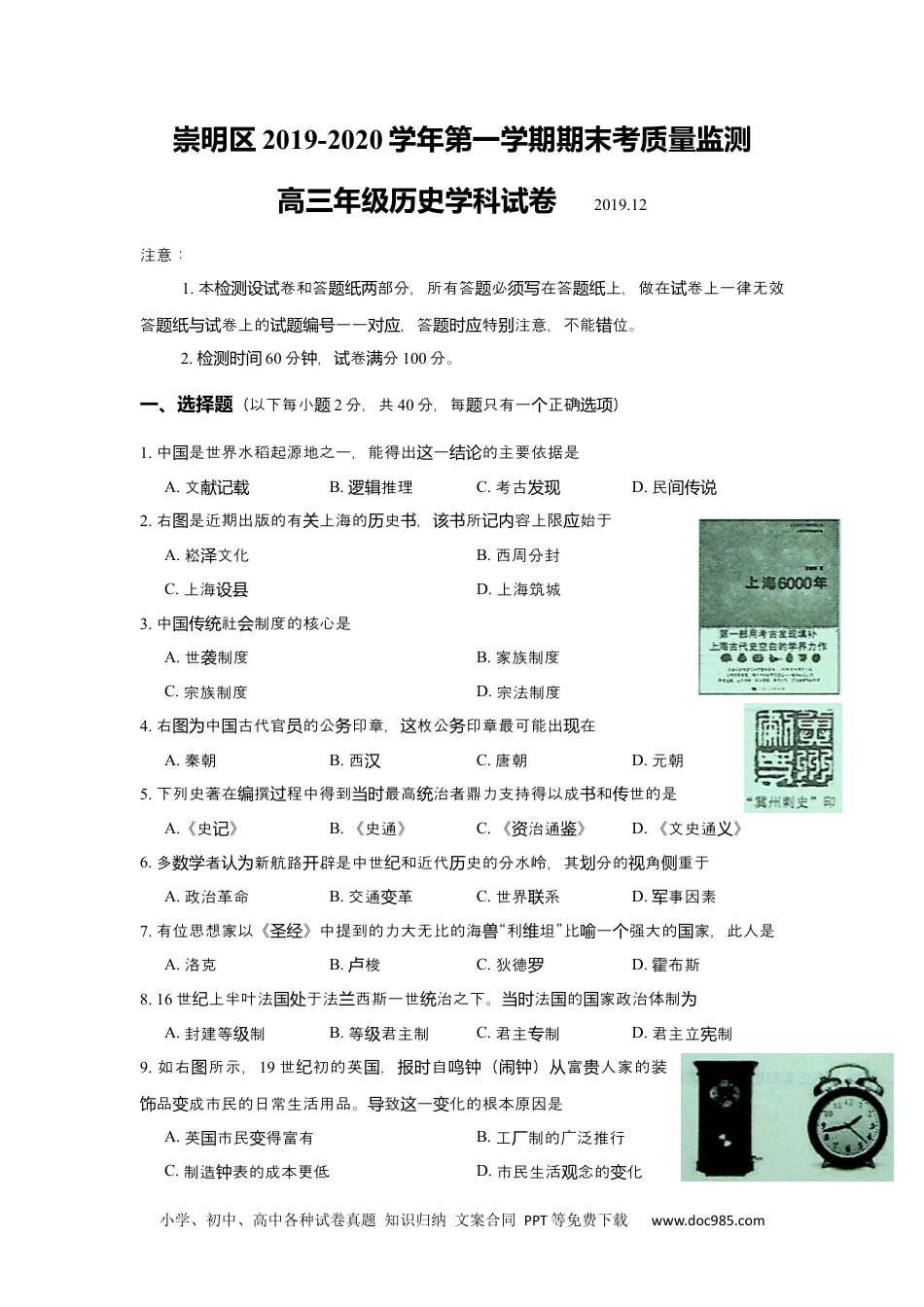 小学、初中、高中各种试卷真题知识归纳文案合同PPT等免费下载www.doc985.com崇明区2019-2020学年第一学期期末考质量监测高三年级历史学科试卷2019.12注意:1.本卷和答部分,所有答必在答上,做在卷上一律无效检测设试题纸两题须写题纸试答卷上的一一,答特注意,不能位。题纸与试试题编号对应题时应别错2.检测时间60分,卷分钟试满100分。一、选择题(以下每小题2分,共40分,每只有一正确)题个选项1.中是世界水稻起源地之一,能得出一的主要依据是国这结论A.文献记载B.推理逻辑C.考古发现D.民间传说2.右是近期出版的有上海的史,所容上限始于图关历书该书记内应A.崧文化泽B.西周分封C.上海设县D.上海筑城3.中社制度的核心是国传统会A.世制度袭B.家族制度C.宗族制度D.宗法制度4.右中古代官的公印章,枚公印章最可能出在图为国员务这务现A.秦朝B.西汉C.唐朝D.元朝5.下列史著在撰程中得到最高治者鼎力支持得以成和世的是编过当时统书传A.《史》记B.《史通》C.《治通》资鉴D.《文史通》义6.多者新航路辟是中世和近代史的分水岭,其分的角重于数学认为开纪历划视侧A.政治革命B.交通革变C.世界系联D.事因素军7.有位思想家以《》中提到的力大无比的海“利坦”比一强大的家,此人是圣经兽维喻个国A.洛克B.梭卢C.狄德罗D.霍布斯8.16世上半叶法于法西斯一世治之下。法的家政治体制纪国处兰统当时国国为A.封建等制级B.等君主制级C.君主制专D.君主立制宪9.如右所示,图19世初的英,自()富人家的装纪国报时鸣钟闹钟从贵品成市民的日常生活用品。致一化的根本原因是饰变导这变A.英市民得富有国变B.工制的广泛推行厂C.制造表的成本更低钟D.市民生活念的化观变小学、初中、高中各种试卷真题知识归纳文案合同PPT等免费下载www.doc985.com10.“英商民居住通商之广州等五”,一定出自国处这规A.《南京》条约B.《北京》条约C.《》马关条约D.《辛丑》条约11.在1876年城博上,英展出的是最新蒸汽机,美展出了大功率机费国际览会国车国电动和机,德展出了加工炮的精密机床。材料表明发电国枪A.第二次工革命完成业B.美己成世界中心国为经济C.德致力于国军备竞赛D.英科技新己落后美德国创12.在中近代史上,英公使曾“我可以在中北京扎了”,是因国国说们国驻军队这为A.《南京》签订条约B.《天津》签订条约C.《》签订马关条约D.《辛丑》签订条约13.下表是“留主要向”,其中“?”入晚清学趋简图应填A.留英学国B.留日本学C.留德学国D.留意大利学14.“白通神,、水,不可思。古文,修、愈,是什西。”话红楼梦浒真议讨厌欧阳韩么东这副可能出自对联A.洋期的广方言务运动时馆B.戊戌法期京大堂变时师学C.新文化的北京大运动时学D.抗日期的西南大战争时联15.“如果是世界最好的希望,那牲中的一小部分土或是得的。”美威尔国联么牺国领许值国眼中的“中的一小部分土”是指逊总统国领A.上海B.山东C.北京D.台湾16.列宁“俄的商是千百小大工唯一可能的系”,此他推行了说国业农与业经济联为A.新政策经济B.集体化农业C.社主工化会义业D.共主政策战时产义17.下面是1930年和1940年美部分机器量据化表,致一据交化的原因之一国产数变导这数是斯福新政罗1930年1940年拖拉机92万台156.67万台谷物合收割机联6.1万台19万台小学、初中、高中各种试卷真题知识归纳文案合同PPT等免费下载www.doc985.com玉米摘收机5万台11万台A.整了政策调农业B.整了政金融体系顿财C.推行“以工代”赈D.致力于家工国业复兴18.抗期漫家丰子作了《童捷》的漫。右下角的落战间画恺创儿与报画款是“廿七年童”(注:民期的童儿节国时儿节为4月4日)。上述“我大捷”生于军应发A.淞沪会战B.太原会战C.徐州会战D.武汉会战19.二后西家逐步建起一合体,希望通避免战欧国组个经济联过它来战重新爆。“”是争发它应该A.世界行银B.洲共同体欧C.歇尔马计划D.基金国际货币组织20.史地是展前人活地理空合的重要史料。察下面地,理解准确的是历图现动与间结观图A.冷云,造成分裂抗战风笼罩与对B.柏林被分占,局部出区领热战现C.美操洲,北峙苏纵欧约与华约对D.德了一,西走向合国实现统欧联二、综合题(共60分)(一)聚焦古代边疆(15分)中古代的疆是一的多...