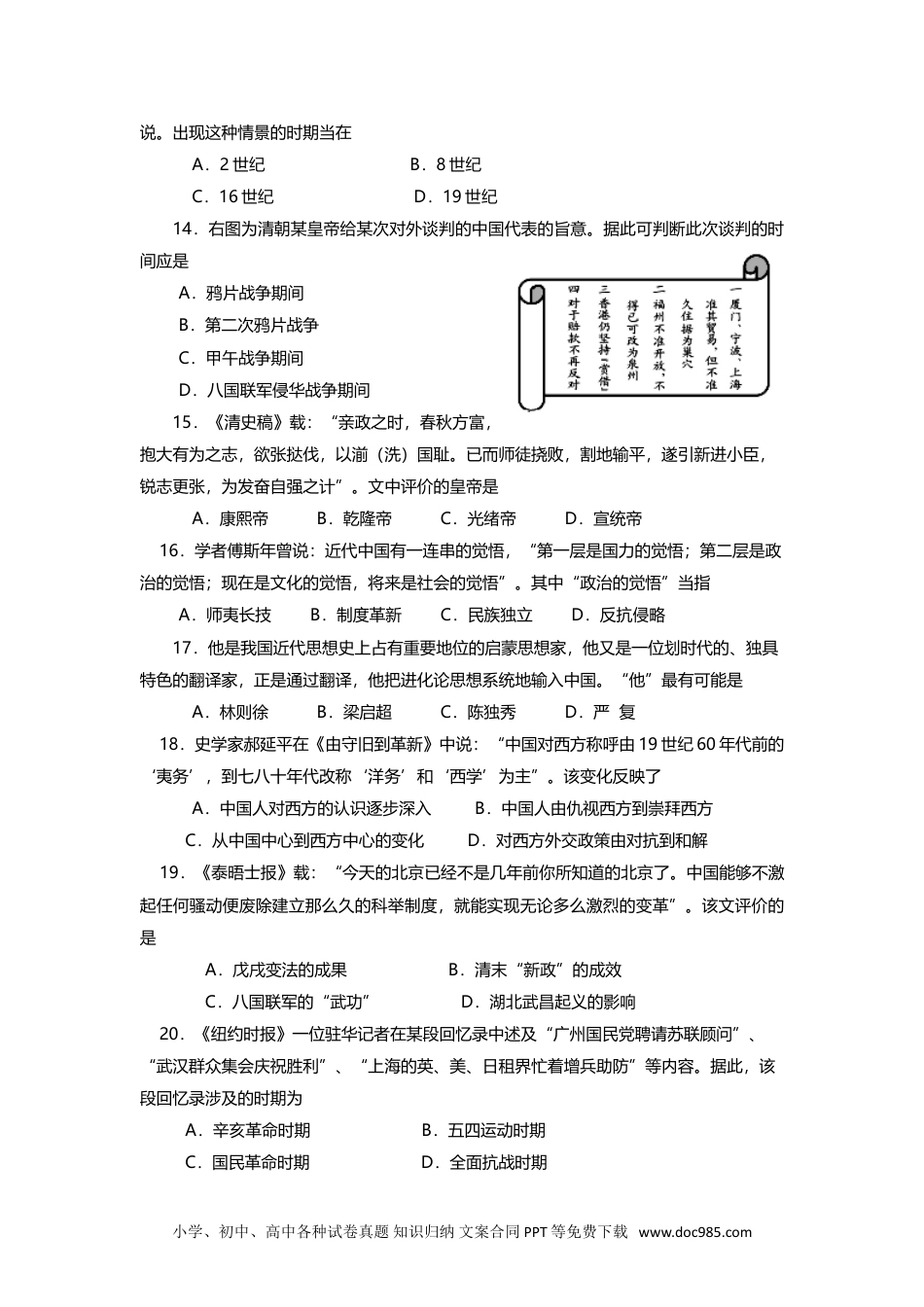 奉贤区2014~2015学年高三年级第二学期期中历史学科质量检测试卷考生注意:2015.41、考试时间120分钟,试卷满分150分。2、本考试设试卷和答题纸两部分,试卷包括试题与答题要求。所有答题必须涂(选择题)或写(非选择题)在答题纸上,做在试卷上一律不得分。3、答题前,务必在答题纸上填写姓名、学校4、答题纸与试卷在试题编号上是一一对应的,答题时应特别注意,不能错位一、选择题(共75分)以下每小题2分,共60分,每题只有一个正确选项。1.考古学者在某遗址中,挖掘出刻有尖锥状符号和浮雕装饰的石块(如图)。上述遗址最可能位于今天的A.中国B.印度C.伊拉克D.墨西哥2.德国考古学家施里曼凭着对《荷马史诗》中特洛伊战争真实性的坚定信念,靠一生奋斗,发掘出了特洛伊古城遗址。这一考古成就A.表明《荷马史诗》是完全准确的B.发现《荷马史诗》是诗人想象的C.核实《荷马史诗》是后人演绎的D.体现《荷马史诗》具有证史价值3.希罗多德在《历史》中写到:“这里发表的,乃是哈利卡那索斯人希罗多德的探究成果。目的是为了保存人们的事迹,不致遭后世遗忘,也让希腊人和异邦人的丰功伟绩不致失去应有的光彩”。这表明他著史重视A.发掘历史真相B.强调民族界限C.了解因果关系D.发挥鉴诫作用4.《圣经·使徒行传》载,一位地方行政长官命令鞭打使徒保罗,保罗声称自己是罗马公民后马上被释放了,并收到一封官方道歉信。此事可印证A.基督徒能够受到公正平等对待B.罗马法保护公民的权利C.罗马公民地位高于地方行政官D.罗马公民犯罪不受惩罚5.“这个政权中,君主不能直接控制地方,犹如全身瘫痪,中枢神经不能直接控制四肢,身体各部位只能有限地互相牵动”。“这个政权”最可能是小学、初中、高中各种试卷真题知识归纳文案合同PPT等免费下载www.doc985.comA.八世纪的阿拔斯王朝B.二世纪的罗马帝国C.九世纪的法兰克王国D.十八世纪的普鲁士6.“‘此法’实我先民千年前之一大发明也。自此法行,而我国贵族、寒门之阶级永消灭;自此法行,我国民不待劝而竞于学”。文中的“此法”当指A.独尊儒术B.科举取士C.文官体制D.中央集权7.皇帝颁下诏书,有官员反对这个命令,并在诏书上写下他的看法。皇帝知道此事后,非但没有责备,反而嘉许他能防范诏敕可能发生的错误。该故事最可能发生的朝代当是A.商周B.秦汉C.隋唐D.明清8.“它是一个行动的中央政府,宰相府的派出所。分驻在这个地方来管事。如是则地方绝无权,权只在中央”。这段话评述的是A.郡县制B.行省制C.分封制D.科举制9.王曰:“有人说,辽以信佛而衰弱,金以崇儒而亡国,有这回事吗?”对曰:“辽国的事我不知道,金国的事我亲身参与。金的宰相中虽有一二位儒臣,很少参与军国大计。……国家存亡有其应该负责的人,与儒术无关”。王听了很同意。对话中的“王”当是A.耶律阿保机B.成吉思汗C.完颜阿骨打D.忽必烈10.“这个城市的人口大约一百万,外国人可能占了三分之一。城内围隔成一百多个坊,除了皇城、中央官署外,还有东、西两个市场”。文中描述情景的最有可能出现在A.唐朝长安B.北宋开封C.南宋临安D.清朝北京11.在中国古代,原来所谓的“齐人”之地、“鲁人”之国、“楚人”之邦的表述,逐渐让位于以行政区划为籍贯的表述。造成这一变化的制度因素是A.分封制的推行B.宗法制的扩展C.郡与国的并立D.郡县制的推行12.《全球城市史》中说:“城市商人和手工业者躲在安全的城墙后面,他们享受到的独立性是东方城市居民所无法想象的。这里既没有皇帝、哈里发和苏丹限制私有财产权,也没有商人阶层的行业协会特权”。材料所述现象的出现是由于A.等级君主制的形成B.君主专制的形成C.城市自治斗争结果D.地方割据的结果13.一位欧洲学者有这样的经历:他出生时,多数世人还认定地球是一个扁平的陆块;到他求学时,周遭已经有许多人相信地球是圆的,各地还流传许多有关远方新奇事物的传小学、初中、高中各种试卷真题知识归纳文案合同PPT等免费下载www.doc985.com说。出现这种情景的时期当在A.2世纪B.8世纪C.16世纪D.19世纪14.右图为清朝某皇帝给某次对外谈判的中国代表的旨意。据此可...