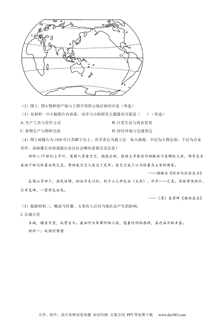 小学、初中、高中各种试卷真题知识归纳文案合同PPT等免费下载www.doc985.com2023学年高三年级第一次质量调研历史试卷考生注意:1.考试时间60分钟,试卷满分100分。2.本考试设试卷和答题纸两部分,试卷包括试题与答题要求;所有答题必须涂(选择题)或写(非选择题)在答题纸上;做在试卷上一律不得分。3.答题前,务必在答题纸上填写姓名、学校、班级,并将核对后的条形码贴在指定位置上。4.答题纸与试卷在试题编号上是一一对应的,答题时应特别注意,不能错位。1.画里乾坤以下为某学习小组搜集的部分图片及文献资料。材料一(1)图1至图4反映的劳作场景与下图字母所示地区相对应的是(填字母)小学、初中、高中各种试卷真题知识归纳文案合同PPT等免费下载www.doc985.com(2)图5、图6物种原产地与上图字母所示地区相对应是(单选)(3)从材料一中6幅图片内容看,该学习小组研究主题最有可能是()(单选)A.生产工具与劳作方式B.日常生活与商业贸易C.食物生产与物种交流D.居住环境与交通变迁(4)图2画像石为1950年江苏睢宁出土。有学者认为最上层是仙人骑鹿,中层为人物会面,下层为合家劳作。该画像石内容透露出东汉社会哪些重要历史信息?材料二17世纪上半叶,英国入侵爱尔兰,捣毁庄稼,致使大多数农作物歉收乃至颗粒无收,唯有生长在地下的马铃薯安然无恙,帮助爱尔兰人度过了荒年。爱尔兰成了以马铃薯为主食的国家。——摘编自《经济与社会生活》邑境山多田少,居民倍增,稻谷不足以给,则于山上种包谷(玉米)、洋芋……之类。深林剪伐殆尽,巨阜危峰,一望皆包谷也。——(清)袁景晖《建始县志》(5)根据材料二,概述马铃薯、玉米传入后对当地社会产生的影响。2.长城万里长城,横亘万里,纵贯古今。最初作为军事防御工程,随着时间的推移,其内涵不断丰富。材料一:战国形势图小学、初中、高中各种试卷真题知识归纳文案合同PPT等免费下载www.doc985.com(1)战国时期,诸侯国根据各自需要修筑长城。对此现象的合理解释是()(三选)A.王室衰微,诸侯自决权膨胀B.铁器使用,社会生产力发展C.经济发展,工商业联系加强D.争战频繁,各国需加强防御材料二:皇帝奋威,德并诸侯,初一泰平。堕坏城郭,决通川防,夷去险阻。——《史记·秦始皇本纪》秦已并天下,乃使蒙恬将三十万众北避戎狄,收河南。筑长城,因地形,用制险塞,起临滦,至辽东,延袤万里。——《史记·蒙恬列传》(2)从材料二看,秦朝长城在修筑背景、目的、形制上与战国时期相比有何变化?材料三边防总兵蔡元报告说古北口长城倒塌了许多,请求进行修补。康熙帝认为“帝王治天下自有本原,不专恃险阻。秦筑长城以来,汉、唐、宋亦常修理,其时岂无边患。明末我太祖统大兵长驱直入,诸路瓦解,皆莫敢当,可见守国之道,惟在修德安民,民心悦则邦本得,而边境自固,所谓众志成城者是也。”——选编自《清圣祖实录》卷一五一(3)康熙帝对修补长城一事持何种态度?请概括其理由。材料四小学、初中、高中各种试卷真题知识归纳文案合同PPT等免费下载www.doc985.com梁中铭《只有血和肉做成的万里长城才能使敌人不能摧毁!》1933年把我们的血肉,筑成我们新的长城!——田汉《义勇军进行曲》1935年万里长城万里长,长城外面是故乡……大家拼命打回去,哪怕敌人逞豪强万里长城万里长,长城外面是故乡四万万同胞心一样,新的长城万里长——潘子农“七七事变”后创作于上海(4)从材料四看,长城被赋予怎样的时代内涵?简要说明原因。材料五:1961年3月,长城被国务院公布为第一批全国重点文物保护单位1987年12月,长城被联合国教科文组织列为世界文化遗产(5)长城作为世界文化遗产被加以保护,有着怎样的历史和现实意义?3.史书决疑关于曹丕称帝时间,史书记载存在差异。材料一:延康元年(220年)十月乙卯,皇帝逊位,魏王称天子。——(南朝)范晔《后汉书·献帝纪》材料二;是岁十一月葬士卒死亡者,犹称令。是月丙午,汉帝使张愔奉玺绶,庚午,王(曹丕)升坛受禅,又是月癸酉,奉汉帝为山阳公。——(西晋)陈寿《三国志·魏志》材料三:十月辛未,受禅于汉。——《魏受禅碑》(刊刻于220年)(1)材料一中...