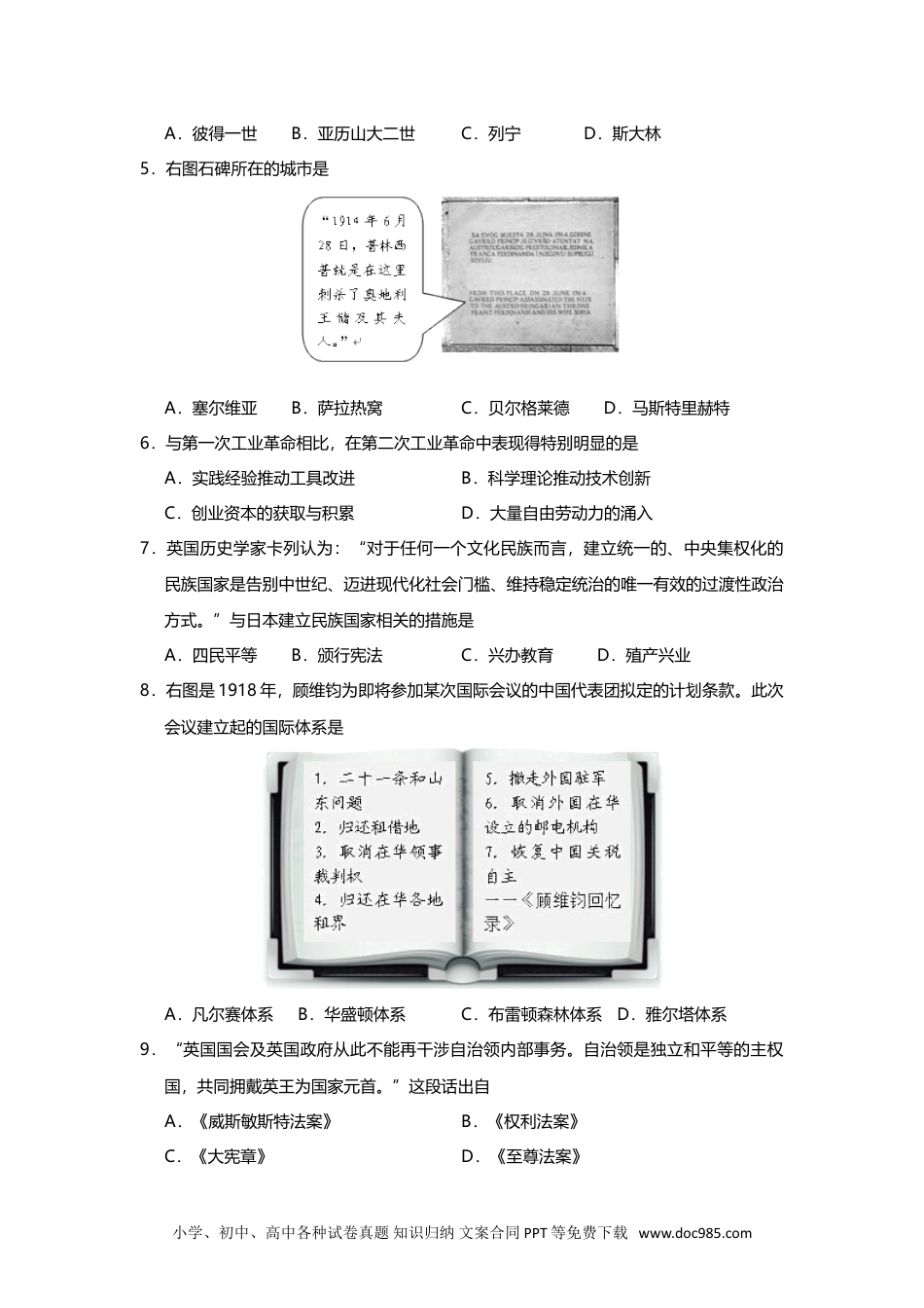 闸北区2014-2015学年第一学期期末考质量监测高三年级历史学科试卷2014.12考生注意:1.考试时间120分钟,满分150分。2.本考试设试卷和答题纸两部分,所有答题必须全部写在(或涂在)答题纸上。3.答题前,务必在答题纸上填写学校、班级、姓名和学号等信息。4.答题纸与试卷在试题编号上是一一对应的,答题时应特别注意,不能错位。一、选择题(共75分)以下每小题2分,共60分。每题只有一个正确选项。1.巴黎高等法院主席曾向出席会议的国王宣称:“您是在法律之上的,法律和命令都不能强迫您,根本没有一种权力可以强迫您去做什么。”当时法国的政治体制应是A.封建等级制B.君主专制C.等级君主制D.君主立宪制2.“人能够由于承认上帝而把他吸引到自己灵魂的狭窄范围以内来,但也能由于热爱上帝而使自己的灵魂扩展到他的无限大之中——这就是在尘世上的幸福。”这句话主要强调A.自由平等B.上帝万能C.人性至上D.幸福来源3.下图反映的是哪一时期的世界局势A.19世纪初B.19世纪中叶C.20世纪初D.20世纪中叶4.“他,目光敏锐,率先看到了学习西方先进技术的重要性,发起了声势浩大而又严厉无比的改革运动,使俄国‘从愚昧无知的深渊登上了世界光荣的舞台’”。“他”是小学、初中、高中各种试卷真题知识归纳文案合同PPT等免费下载www.doc985.comA.彼得一世B.亚历山大二世C.列宁D.斯大林5.右图石碑所在的城市是A.塞尔维亚B.萨拉热窝C.贝尔格莱德D.马斯特里赫特6.与第一次工业革命相比,在第二次工业革命中表现得特别明显的是A.实践经验推动工具改进B.科学理论推动技术创新C.创业资本的获取与积累D.大量自由劳动力的涌入7.英国历史学家卡列认为:“对于任何一个文化民族而言,建立统一的、中央集权化的民族国家是告别中世纪、迈进现代化社会门槛、维持稳定统治的唯一有效的过渡性政治方式。”与日本建立民族国家相关的措施是A.四民平等B.颁行宪法C.兴办教育D.殖产兴业8.右图是1918年,顾维钧为即将参加某次国际会议的中国代表团拟定的计划条款。此次会议建立起的国际体系是A.凡尔赛体系B.华盛顿体系C.布雷顿森林体系D.雅尔塔体系9.“英国国会及英国政府从此不能再干涉自治领内部事务。自治领是独立和平等的主权国,共同拥戴英王为国家元首。”这段话出自A.《威斯敏斯特法案》B.《权利法案》C.《大宪章》D.《至尊法案》小学、初中、高中各种试卷真题知识归纳文案合同PPT等免费下载www.doc985.com10.以下最能反映18世纪中叶—20世纪初,英国经济发展变化的图表是11.1938年—1940年间,中华民国驻维也纳总领事何凤山向数以千计的犹太人发放前往上海的签证,被誉为“生命签证”。导致“生命签证”出现的原因是A.纳粹的排犹运动B.犹太人四海为家的传统C.上海城市发展的需求D.中犹文化交流的需要12.美国总统杜鲁门在二战后期说:“由于德国军事力量行将被摧毁,结成联盟关系的唯一依据马上就要消失,苏联和西方盟国的关系已发生了根本性变化。”这种变化源自A.苏联背信弃义B.德国行将战败C.联盟纽带瓦解D.社会制度矛盾13.凯恩斯坚信要使经济周期上升,政府必须插足进来用减少失业的方法来维持购买力,这意味着“赤字开支”,但它会恢复经济的平衡。以下选项直接运用这个观点的是A.兴办公共工程,以工代赈B.调整金融秩序,鼓励存款C.完善社会保险,限制贫富差距D.推进劳资谈判,缓和矛盾14.在下列时间轴的两个“?”处,分别应填A.国联成立/新中国建立B.《布雷顿森林协定》制定/解放上海C.联合国成立/渡江战役D.关贸总协定成立/提出和平共处五项原则15.德国总理阿登纳说:“我的最大希望是德国人民保持稳定……我们处境困难,我们在世界上需要有朋友,否则我们就会失败。”据此,德国在战后首先选择的“朋友”是A.美国B.英国C.苏联D.法国16.1997年,美国在纽约东百老汇街前端树立林则徐铜像。美国此举最重要的纪念意义当是A.华裔忠烈B.中国精神C.中美友好D.禁毒先驱小学、初中、高中各种试卷真题知识归纳文案合同PPT等免费下载www.doc985.com17.19世纪中叶,响应清廷“募团丁为官勇,粮饷取诸公家”的号召,创建地方...