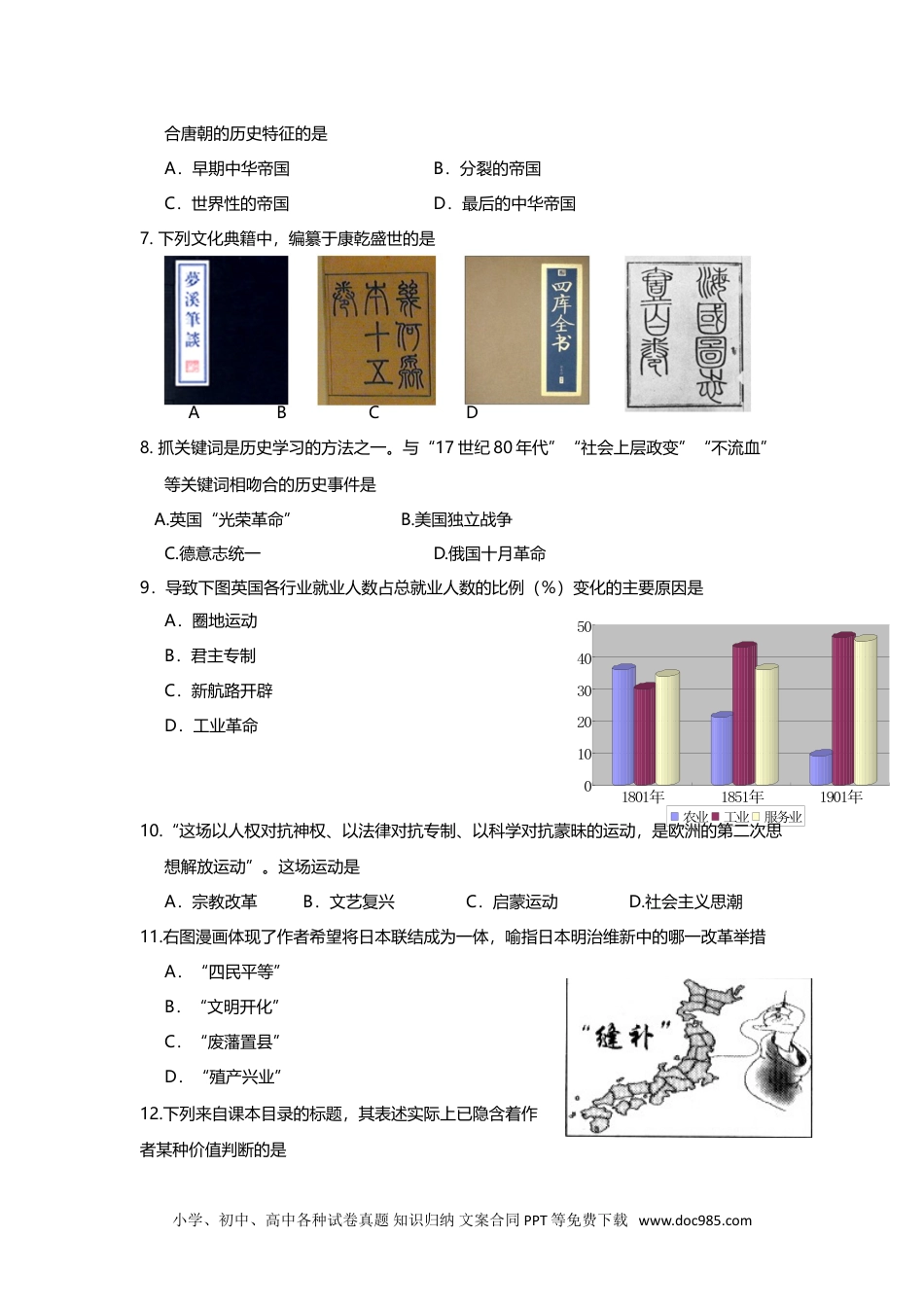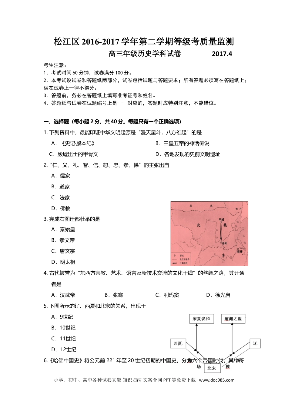 松江区2016-2017学年第二学期等级考质量监测高三年级历史学科试卷2017.4考生注意:1.考试时间60分钟,试卷满分100分。2.本考试设试卷和答题纸两部分,试卷包括试题与答题要求;所有答题必须写在答题纸上;做在试卷上一律不得分。3.答题前,务必在答题纸上填写准考证号和姓名。4.答题纸与试卷在试题编号上是一一对应的,答题时应特别注意,不能错位。一、选择题(每小题2分,共40分。每题只有一个正确选项)1.下列资料中,最能印证中华文明起源是“漫天星斗,八方雄起”的是A.《史记·殷本纪》B.三皇五帝的神话传说C.殷墟出土的甲骨文D.各地发现的史前文明遗址2.“仁、义、礼、智、信、恕、忠、孝、悌”的主张出自A.儒家B.道家C.法家D.佛教3.完成右图迁都壮举的是A.秦始皇B.孝文帝C.唐玄宗D.明太祖4.古代被誉为“东西方宗教、艺术、语言及新技术交流的文化干线”的丝绸之路,其开通者是A.汉武帝B.张骞C.利玛窦D.徐光启5.下图所示的辽、西夏和北宋的关系,出现于A.9世纪B.10世纪C.11世纪D.12世纪6.《哈佛中国史》将公元前221年至20世纪初期的中国史,分为六个帝国时代,其中符小学、初中、高中各种试卷真题知识归纳文案合同PPT等免费下载www.doc985.com010203040501801年1851年1901年农业工业服务业合唐朝的历史特征的是A.早期中华帝国B.分裂的帝国C.世界性的帝国D.最后的中华帝国7.下列文化典籍中,编纂于康乾盛世的是ABCD8.抓关键词是历史学习的方法之一。与“17世纪80年代”“社会上层政变”“不流血”等关键词相吻合的历史事件是A.英国“光荣革命”B.美国独立战争C.德意志统一D.俄国十月革命9.导致下图英国各行业就业人数占总就业人数的比例(%)变化的主要原因是A.圈地运动B.君主专制C.新航路开辟D.工业革命10.“这场以人权对抗神权、以法律对抗专制、以科学对抗蒙昧的运动,是欧洲的第二次思想解放运动”。这场运动是A.宗教改革B.文艺复兴C.启蒙运动D.社会主义思潮11.右图漫画体现了作者希望将日本联结成为一体,喻指日本明治维新中的哪一改革举措A.“四民平等”B.“文明开化”C.“废藩置县”D.“殖产兴业”12.下列来自课本目录的标题,其表述实际上已隐含着作者某种价值判断的是小学、初中、高中各种试卷真题知识归纳文案合同PPT等免费下载www.doc985.comA.社会结构与生活方式的变化B.20世纪初德国工业产值世界第二C.“三国同盟”与“三国协约”形成D.巴尔干成为“欧洲火药桶”13.下图中的“?”应填A.《南京条约》B.《天津条约》C.《北京条约》D.《马关条约》14.右图众议院聘书及银质徽章颁发于A.1912年B.1918年C.1927年D.1937年15.19世纪30年代,为“把满洲从中国本土分裂出来,自成一区,置日本势力之下”,日本发动了A.九一八事变B.华北事变C.七七事变D.八一三事变16.“把美国人民从苦难和经济大萧条中拯救出来,由于他的提倡和支持,世界上才有了联合国。”这是对谁的评价A.华盛顿B.林肯C.罗斯福D.杜鲁门17.右侧布雷顿森林货币体系漫画中的人物喻指A.英国B.法国C.美国D.苏联18.漫画中的英国准备脱离哪一国际组织A.联合国B.欧共体C.世贸组织D.欧盟19.在20世纪的国际格局出现过三次大的变动,造成第小学、初中、高中各种试卷真题知识归纳文案合同PPT等免费下载www.doc985.com三次大变动的历史事件是A.巴黎和会B.新中国成立C.雅尔塔会议D.苏联解体20.1978年下半年,全国省级以上刊物刊出的讨论文章就达650篇。当时讨论的核心问题是A.“三面红旗”B.粉碎“四人帮”C.家庭联产承包责任制D.真理标准问题二、综合分析题(一)朝代的政制特征(14分)中国古代,政治体制,代有更迭,时有创新,帝王居间,厥功甚伟。21.请将下列不同朝代的政制特征与相应的帝王进行匹配。(用序号表示)(14分)(二)学生课题研究中的近代学堂(20分)22.在学生的课题研究中,上述材料划线部分中属于历史叙述的是;属于转手史料小学、初中、高中各种试卷真题知识归纳文案合同PPT等免费下载www.doc985.com《京师大学堂章程》(1898年)首先确定了晚清以来被尊为国策的“中学为体,西学为用”(西学分为天文、农学、工学、商学、...