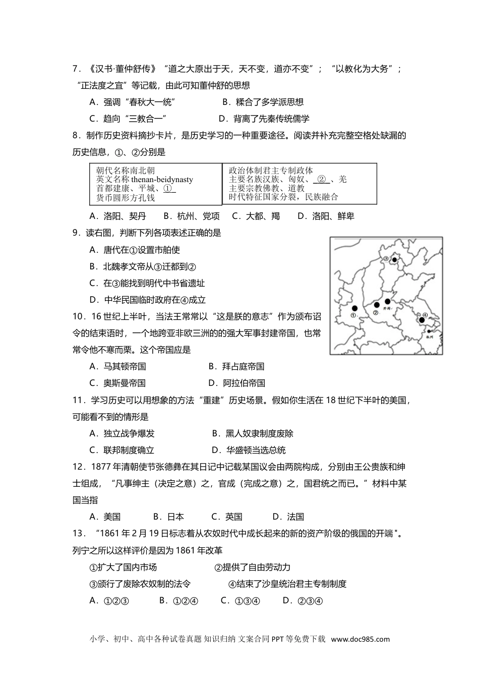 青浦区2014-2015学年第一学期期末考质量监测高三年级历史学科试卷2015.1考生注意:1.考试时间120分钟,满分150分。2.本考试设试卷和答题纸两部分,所有答题必须全部写在(或涂在)答题纸上。3.答题前,务必在答题纸上填写学校、班级、姓名和学号等信息。4.答题纸与试卷在试题编号上是一一对应的,答题时应特别注意,不能错位。一、选择题(1-30每题2分,31-35每题3分,共75分)1.司马迁在《史记·殷本纪》中说武王伐纣时,“诸侯叛殷会周者八百”。这里的“诸侯”最主要指哪类人?A.郡县官长B.方国头领C.商王子侄D.三公九卿2.周代的棺椁制度规定:“天子棺椁七重,诸侯五重,大夫三重,士再重”。材料反映出西周社会的主要特点是A.政治上实行分封制B.西周社会的宗教色彩浓厚C.贵族集团等级严格D.贵族生活腐化、政治黑暗3.有学生要对雅利安人早期征服恒河流域的历史颇有兴趣,以下文学作品可资借鉴的是A.《吉尔伽美什》B.《荷马史诗》C.《摩诃婆罗多》D.《一千零一夜》4.从遵循“习惯法”到创立一部新法律——“成文法”,可以说开创了罗马法制史上一个新的时代。促成这个“新的时代”到来的事件是A.制定《十二铜表法》B.编纂《民法大全》C.颁布《民法典》D.形成万民法5.“我们的宗教和我们的帝国是一对阿拉伯孪生兄弟”,对此理解有误的是A.强调了伊斯兰教在帝国形成过程中的作用B.突出了阿拉伯帝国是政教合一的神权国家C.强调了伊斯兰教和帝国建立在同一个年份D.突出了统一的阿拉伯国家创立的宗教背景6.《汉书·武帝纪》记载:“元光元年冬十一月,初令郡国举孝、廉各一人。”由此可见当时①分封制仍然存在②世袭制已经废止③儒家思想已经影响选官制度④选官的对象和内容比较开放A.①②B.①③C.①②③D.②③④小学、初中、高中各种试卷真题知识归纳文案合同PPT等免费下载www.doc985.com7.《汉书·董仲舒传》“道之大原出于天,天不变,道亦不变”;“以教化为大务”;“正法度之宜”等记载,由此可知董仲舒的思想A.强调“春秋大一统”B.糅合了多学派思想C.趋向“三教合一”D.背离了先秦传统儒学8.制作历史资料摘抄卡片,是历史学习的一种重要途径。阅读并补充完整空格处缺漏的历史信息,①、②分别是朝代名称南北朝英文名称thenan-beidynasty首都建康、平城、①_货币圆形方孔钱政治体制君主专制政体主要名族汉族、匈奴、_②_、羌主要宗教佛教、道教时代特征国家分裂,民族融合A.洛阳、契丹B.杭州、党项C.大都、羯D.洛阳、鲜卑9.读右图,判断下列各项表述正确的是A.唐代在①设置市舶使B.北魏孝文帝从③迁都到②C.在③能找到明代中书省遗址D.中华民国临时政府在④成立10.16世纪上半叶,当法王常常以“这是朕的意志”作为颁布诏令的结束语时,一个地跨亚非欧三洲的的强大军事封建帝国,也常常令他不寒而栗。这个帝国应是A.马其顿帝国B.拜占庭帝国C.奥斯曼帝国D.阿拉伯帝国11.学习历史可以用想象的方法“重建”历史场景。假如你生活在18世纪下半叶的美国,可能看不到的情形是A.独立战争爆发B.黑人奴隶制度废除C.联邦制度确立D.华盛顿当选总统12.1877年清朝使节张德彝在其日记中记载某国议会由两院构成,分别由王公贵族和绅士组成,“凡事绅主(决定之意)之,官成(完成之意)之,国君统之而已。”材料中某国当指A.美国B.日本C.英国D.法国13.“1861年2月19日标志着从农奴时代中成长起来的新的资产阶级的俄国的开端"。列宁之所以这样评价是因为1861年改革①扩大了国内市场②提供了自由劳动力③颁行了废除农奴制的法令④结束了沙皇统治君主专制制度A.①②③B.①②④C.①③④D.②③④小学、初中、高中各种试卷真题知识归纳文案合同PPT等免费下载www.doc985.com14.“以中国之道,用泰西之器。”以下观点和该主张类似的有A.“自由为体,民主为用”B.“以中国伦常名教为原本,辅以诸国富强之术”C.“上古三代之道”是“不易之经”、“不变之道”D.“师夷长技以制夷”15.下列不平等条约的相关条款,按时间顺序排列正确的是①“得在中国通商口岸、城邑任便从事各项工艺制造”②“大清大皇帝允以天津郡城海口作为...