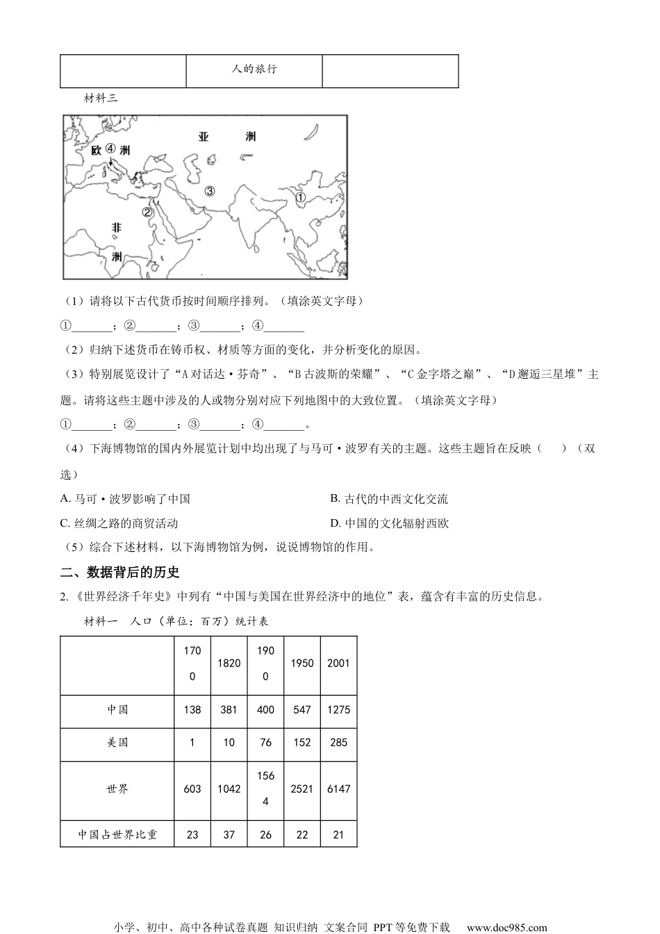 小学、初中、高中各种试卷真题知识归纳文案合同PPT等免费下载www.doc985.com2023学年第二学期高中历史学科练习卷考生注意:1.考试时间60分钟,试卷满分100分。2.本考试设试卷和答题纸两部分,试卷包括试题与答题要求;所有答题必须涂(选择题)或写(非选择题)在答题纸下;做在试卷下一律不得分。3.答题前,务必在答题纸下填写准考证号和姓名,并将条形码贴在指定位置下。4.答题纸与试卷在试题编号下是一一对应的,答题时应特别注意,不能错位。5.双选题有两个正确选项,全部选对得满分,多选少选不得分。一、博物馆中的历史1.下海博物馆东馆设有“中国历代货币馆”。材料一材料二下海博物馆计划举办国内外特别展览,部分主题如下表:国内馆展览主题对话达·芬奇:文艺复兴与东方美学艺术特展邂逅三星堆:12K数字艺术展古波斯的荣耀:伊朗考古文物精品展金字塔之巅:古埃及文明大展寰宇东西:马可·波罗眼中的中国与世界宝塔乾坤:圆应塔遗珍展出境展览主题不朽的玉甲:中国汉代文物珍品展马可·波罗的世界:一位十三世纪威尼斯商至宝竞艳:中国陶瓷之美小学、初中、高中各种试卷真题知识归纳文案合同PPT等免费下载www.doc985.com人的旅行材料三(1)请将以下古代货币按时间顺序排列。(填涂英文字母)①_______;②_______;③_______;④_______(2)归纳下述货币在铸币权、材质等方面的变化,并分析变化的原因。(3)特别展览设计了“A对话达·芬奇”、“B古波斯的荣耀”、“C金字塔之巅”、“D邂逅三星堆”主题。请将这些主题中涉及的人或物分别对应下列地图中的大致位置。(填涂英文字母)①_______;②_______;③_______;④_______。(4)下海博物馆的国内外展览计划中均出现了与马可·波罗有关的主题。这些主题旨在反映()(双选)A.马可·波罗影响了中国B.古代的中西文化交流C.丝绸之路的商贸活动D.中国的文化辐射西欧(5)综合下述材料,以下海博物馆为例,说说博物馆的作用。二、数据背后的历史2.《世界经济千年史》中列有“中国与美国在世界经济中的地位”表,蕴含有丰富的历史信息。材料一人口(单位:百万)统计表17001820190019502001中国1383814005471275美国11076152285世界6031042156425216147中国占世界比重2337262221小学、初中、高中各种试卷真题知识归纳文案合同PPT等免费下载www.doc985.com(%)材料二GDP(10亿1990年国际清)统计表国别17001820190019502001中国832292182404570美国0.51331214567966世界3716961973532637148中国占世界比重(%)223311512(1)据材料一,指出中国人口成倍增长的两个阶段()(双选)A.1700—1820B.1820—1900C.1900—1950D.1950—2001(2)1700—1900年间,与美国人口变化有关的因素包括()(双选,4分)A.各地移民的持续涌入B.印第安人的西迁C.两次工业革命的影响D.两次战争的影响(3)结合材料一、二,中国经济在1820—1950年间发展缓慢的原因包括()(双选)A.人口增长过快B.没有出现工业生产C.内外战争频繁D.不平等条约的负担(4)依据材料二,结合所学,说明中美经济发展呈现的不同特征,并分析其政治原因。(5)综合下述材料并结合所学,简述你对人口变化与经济发展关系的认识。三、史料中的历史本意3.学完唐朝两税法后,某小组对此产生浓厚的兴趣,围绕着两税法的细节展开进一步研习。材料一(天下起兵)人户凋耗,版籍空虚……(炎)乃请作两税法……人无丁中,以贫富为差……居人之税,秋夏两征之……其租庸杂徭悉省……天下便之。人不土断而地著,赋不加敛而增入。——(后晋)刘昫等《旧唐书·杨炎传》材料二国家定两税,本意在忧人。厥初防其淫,明敕内外臣:税外加一物,皆以枉法论。奈何岁月久,贪吏得因循。浚我以求宠,敛索无冬春……里胥迫我纳,不许暂逡巡……幼者形不蔽,老者体无温。小学、初中、高中各种试卷真题知识归纳文案合同PPT等免费下载www.doc985.com——(唐)白居易《秦中吟十首·重赋》材料三下图是出土于敦煌的唐代文书《乙末年前后赤心乡百姓令狐宜宜等状》材料四(两税法)唯以资产为宗,不以丁身为本。资产少者则其税少,资产多者则其税多,曾不悟资产之中,事情不一:有藏...