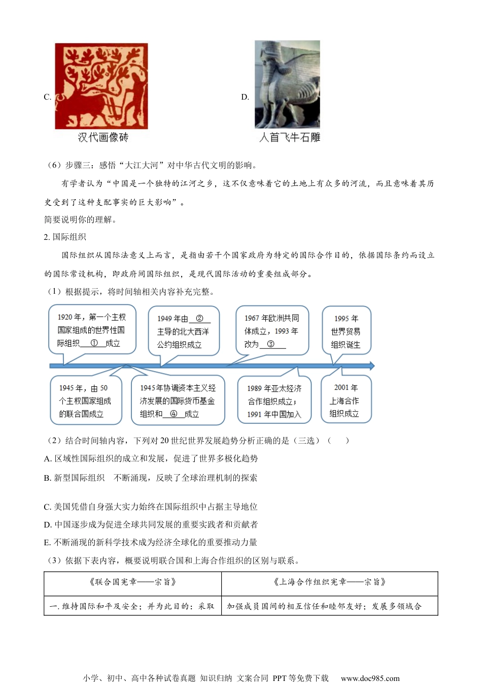 小学、初中、高中各种试卷真题知识归纳文案合同PPT等免费下载www.doc985.com2022学年第二学期期中混合式教学适应性练习高三年级历史学科练习卷考生注意:1.考试时间60分钟,试卷满分100分。2.本考试设试卷和答题纸两部分,试卷包括试题与答题要求;所有答题必须涂或写在答题纸上;在试卷上做答一律不得分。3.答题前,务必在答题纸上填写准考证号和姓名。4.答题纸与试卷在试题编号上是一一对应的,答题时应特别注意,不能错位。1.大江大河水是生命的源泉,大江大河是文明的摇篮。某历史学习小组开展“大江大河”为主题的自主性学习,步骤如下:(1)步骤一:通过查询关于大江大河的文献记载,了解相关的地理环境特征。将下列表格中的文献内容与地图所示区域相匹配。(填写对应的数字)文献内容对应区域东抵扎格罗斯山,西到叙利亚沙漠,南迄波斯湾北及托罗斯。北部为山地,向南经过草原和平原到南部沼泽性的三角洲。A从地域上讲,北起喜马拉雅山南麓的萨雷∙科拉和坚戈,南至滨临阿拉海坎贝尔海湾的坎吉达尔。B河水出东北隅,以行其北,西南又入勃海,又出海外,即西而北,入禹所导积石山。C金光熠熠耀泥罗,两岸翠绿尽婆娑。清流荡漾五千里,沙漠绿洲万顷波。公羊甲壳阿姆拉,护佑法老胜利亚。D小学、初中、高中各种试卷真题知识归纳文案合同PPT等免费下载www.doc985.com步骤二:收集相关的文明成果并适当辨识。阅读下列材料,回答问题。(2)创造了迄今所知世界上最早文字的是(单选)()A.赫梯人B.苏美尔人C.古埃及人D.古印度人(3)利用大江大河兴修水利工程是地区发展的大事。诗句“岷江遥从天际来,神功凿破古离堆。恩波浩渺连三楚,惠泽膏流润九垓。”赞美的水利工程是(单选)()A.大运河B.龙首渠C.都江堰D.郑国渠(4)国家通过特定的政治制度来实现社会治理。对下列示意图所反映的政治制度解读正确的是(单选)()A.君主专制B.等级君主制C.议会君主制D.君主立宪制(5)生产工具的进步是社会生产力发展的重要标志。下列文物能够提供相关历史信息的是(单选)()A.B.小学、初中、高中各种试卷真题知识归纳文案合同PPT等免费下载www.doc985.comC.D.(6)步骤三:感悟“大江大河”对中华古代文明的影响。有学者认为“中国是一个独特的江河之乡,这不仅意味着它的土地上有众多的河流,而且意味着其历史受到了这种支配事实的巨大影响”。简要说明你的理解。2.国际组织国际组织从国际法意义上而言,是指由若干个国家政府为特定的国际合作目的,依据国际条约而设立的国际常设机构,即政府间国际组织,是现代国际活动的重要组成部分。(1)根据提示,将时间轴相关内容补充完整。(2)结合时间轴内容,下列对20世纪世界发展趋势分析正确的是(三选)()A.区域性国际组织的成立和发展,促进了世界多极化趋势B.新型国际组织的不断涌现,反映了全球治理机制的探索C.美国凭借自身强大实力始终在国际组织中占据主导地位D.中国逐步成为促进全球共同发展的重要实践者和贡献者E.不断涌现的新科学技术成为经济全球化的重要推动力量(3)依据下表内容,概要说明联合国和上海合作组织的区别与联系。《联合国宪章——宗旨》《上海合作组织宪章——宗旨》一.维持国际和平及安全;并为此目的:采取加强成员国间的相互信任和睦邻友好;发展多领域合小学、初中、高中各种试卷真题知识归纳文案合同PPT等免费下载www.doc985.com有效集体办法,以防止且消除对于和平之威胁,制止侵略行为或其他和平之破坏;并以和平方法且依正义及国际法之原则,调整或解决足以破坏和平之国际争端或情势。二.发展国际间以尊重人民平等权利及自决原则为根据之友好关系,并采取其他适当办法,以增强普遍和平。三.促成国际合作,以解决国际间属于经济、社会、文化及人类福利性质之国际问题,且不分种族、性别、语言或宗教,增进并激励对于全体人类之人权及基本自由之尊重。四.构成一协调各国行动之中心,以达成上述共同目的。作,维护和加强地区和平、安全与稳定,推动建立民主、公正、合理的国际政治经济新秩序;共同打击一切形式的恐怖主义、分裂主义和极端主义,打击非法贩卖毒品、武器和其他跨国犯罪活动,以及非法...