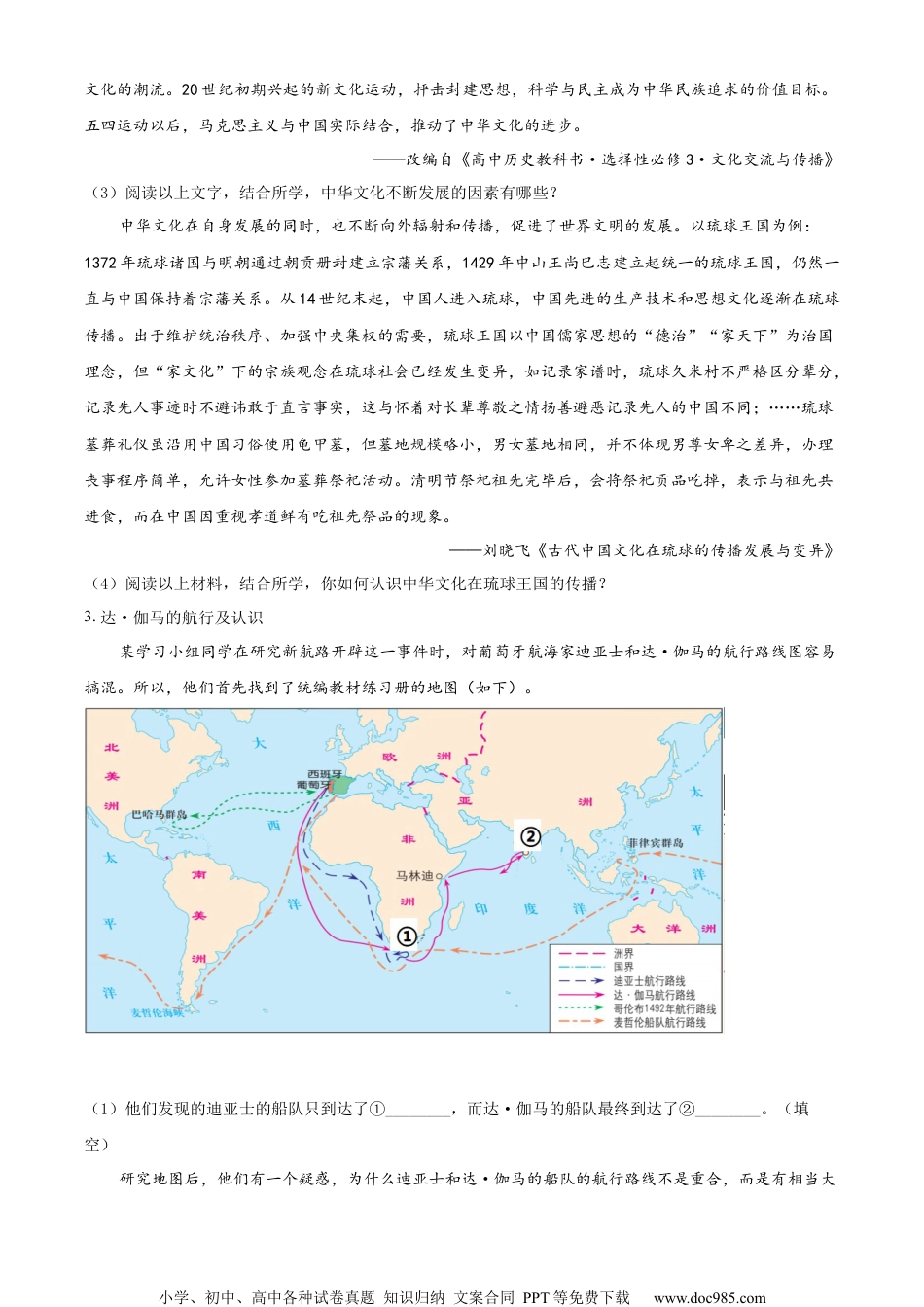 小学、初中、高中各种试卷真题知识归纳文案合同PPT等免费下载www.doc985.com2022年上海市杨浦区高考历史二模2022年4月1.人类古代文明最初的人类文明出现于东亚、西亚、南亚、北非,以及欧洲巴尔干半岛南部和爱琴海地区,在这些地区产生了一系列文明国家。古代美洲的印第安人也创造了灿烂的文明。这些古代文明在发展过程中,产生了一系列璀璨的文明成果(1)根据所学,在表格中把古代文明与文明成果准确匹配。(填写字母)。文明成果(填写字母)(1)古代西亚文明(2)古代埃及文明(3)古代中国文明(4)古代印度文明(5)古代希腊文明(6)古代美洲文明文明成果A.印章文字B.绘有重装步兵的陶壶C.放牧壁画残片小学、初中、高中各种试卷真题知识归纳文案合同PPT等免费下载www.doc985.comD.《礼记》E.《羽蛇神金字塔》F.《乌尔王竖琴嵌版画》古代各个文明基本独立发展,表现出明显的多元特征。(2)上述古代文明形成多元特征的原因有哪些?古代埃及很早即在底比斯和雅典殖民,目前仍存在于底比斯北面的土质砖顶梯形金字塔,系埃及二十一王朝时期的建筑。灌溉技术、战车、剑等,均由埃及传入。而希腊人崇拜的许多神祇,希腊人的哲学、文化等,也都受到埃及的影响,所以古代希腊才较快发展出辉煌的文化。——马克垚《世界文明史》注:埃及第二十一王朝存在时间为前1085—前945年。(3)以上材料的内容与“古代各个文明基本独立发展”的说法矛盾吗?为什么?2.中华文化的发展及传播在五千多年的历史长河中,勤劳智慧的中华民族创造了博大精深的中华文化。中华文明是人类最古老的文明之一,要研究中华文化的起源,首先要找到其多元一体的核心——华夏族,其华夏认同观念对中国后世发展有巨大影响(1)中原各国自称“华夏”,中原民众产生华夏认同观念是在(________)(单选)A.夏朝B.商朝C.西周D.春秋春秋战国时期,社会出现大变革,面对礼崩乐坏的局面,一大批思想家纷纷著书立说,成为后世思想文化的源头(2)将以下思想家与其主张准确对应。①孔子A.五德之次,从所不胜,故虞土夏木②老子B.天下有道,则礼乐征伐自天子出③邹衍C.天下之人皆相爱,强不执弱,众不劫寡,富不侮贫④韩非子D.大成若缺,大盈若冲,大直若屈,大巧若拙,大辩若讷⑤墨子E.故明主之国,无书简之文,以法为教,无先王之语,以吏为师先秦之后,中华文化继续发展。为巩固大一统的局面,汉武帝接受董仲舒的建议,尊崇儒术,确立了儒学的正统地位。随着佛教传入和道教兴起,中华文化呈现出儒、佛、道交汇融通的景象。到了宋代,吸收佛、道思想阐释儒学的新学派理学形成。明末清初社会的剧烈动荡,促进了思想界的活跃,黄宗羲等人批判理学,抨击君主专制,倡导经世致用。1840年鸦片战争爆发后,向西方学习以救亡图存逐渐成为中华小学、初中、高中各种试卷真题知识归纳文案合同PPT等免费下载www.doc985.com文化的潮流。20世纪初期兴起的新文化运动,抨击封建思想,科学与民主成为中华民族追求的价值目标。五四运动以后,马克思主义与中国实际结合,推动了中华文化的进步。——改编自《高中历史教科书·选择性必修3·文化交流与传播》(3)阅读以上文字,结合所学,中华文化不断发展的因素有哪些?中华文化在自身发展的同时,也不断向外辐射和传播,促进了世界文明的发展。以琉球王国为例:1372年琉球诸国与明朝通过朝贡册封建立宗藩关系,1429年中山王尚巴志建立起统一的琉球王国,仍然一直与中国保持着宗藩关系。从14世纪末起,中国人进入琉球,中国先进的生产技术和思想文化逐渐在琉球传播。出于维护统治秩序、加强中央集权的需要,琉球王国以中国儒家思想的“德治”“家天下”为治国理念,但“家文化”下的宗族观念在琉球社会已经发生变异,如记录家谱时,琉球久米村不严格区分辈分,记录先人事迹时不避讳敢于直言事实,这与怀着对长辈尊敬之情扬善避恶记录先人的中国不同;……琉球墓葬礼仪虽沿用中国习俗使用龟甲墓,但墓地规模略小,男女墓地相同,并不体现男尊女卑之差异,办理丧事程序简单,允许女性参加墓葬祭祀活动。清明节祭祀祖先完毕后,会将祭祀贡品吃掉,表示与祖先共进食,而在中国因重视孝道鲜有吃...