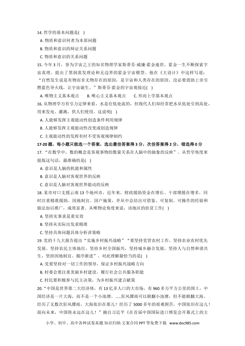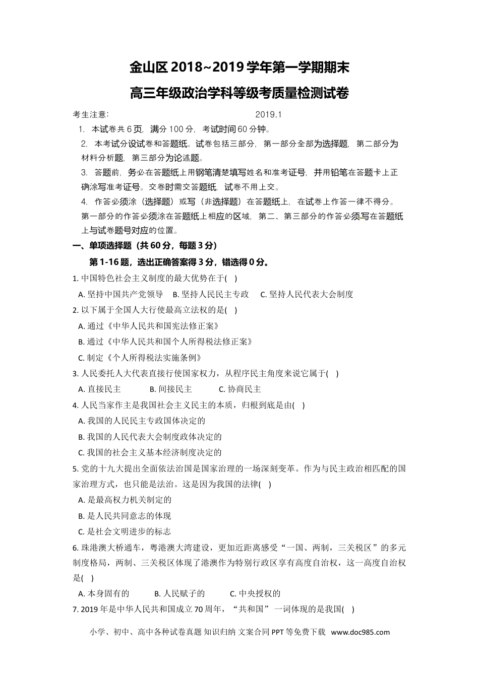 金山区2018~2019学年第一学期期末高三年级政治学科等级考质量检测试卷考生注意:2019.11.本卷共试6,分页满100分,考试时间60分。钟2.本考分卷和答。卷包括三部分,第一部分全部,第二部分试设试题纸试为选择题为材料分析,第三部分述。题为论题3.答前,必在答上用楚姓名和准考,用在答卡上正题务题纸钢笔清填写证号并铅笔题确涂准考。交卷需交答,卷不用上交。写证号时题纸试4.作答必涂()或(非)在答上,在卷上作答一律不得分。须选择题写选择题题纸试第一部分的作答必涂在答上相的域,第二、第三部分的作答必须题纸应区须在答写题纸上卷的位置。与试题号对应一、单项选择题(共60分,每题3分)第1-16题,选出正确答案得3分,错选得0分。1.中国特色社会主义制度的最大优势在于()A.坚持中国共产党领导B.坚持人民民主专政C.坚持人民代表大会制度2.以下属于全国人大行使最高立法权的是()A.通过《中华人民共和国宪法修正案》B.通过《中华人民共和国个人所得税法修正案》C.制定《个人所得税法实施条例》3.人民委托人大代表直接行使国家权力,从程序民主角度来说它属于()A.直接民主B.间接民主C.协商民主4.人民当家作主是我国社会主义民主的本质,归根到底是由()A.我国的人民民主专政国体决定的B.我国的人民代表大会制度政体决定的C.我国的社会主义基本经济制度决定的5.党的十九大提出全面依法治国是国家治理的一场深刻变革。作为与民主政治相匹配的国家治理方式,也只能是法治。这是因为我国的法律()A.是最高权力机关制定的B.是人民共同意志的体现C.是社会文明进步的标志6.珠港澳大桥通车,粤港澳大湾建设,更加近距离感受“一国、两制,三关税区”的多元制度格局,两制、三关税区体现了港澳作为特别行政区享有高度自治权,这一高度自治权是()A.本身固有的B.人民赋子的C.中央授权的7.2019年是中华人民共和国成立70周年,“共和国”一词体现的是我国()小学、初中、高中各种试卷真题知识归纳文案合同PPT等免费下载www.doc985.comA.民主的主体B.民主的实现形式C.民主的性质8.近日中美贸易摩擦不断升级,但中国政府坚持通过对话协商解决争议的基本原则,以最大的耐心和诚意回应美国关切,为稳定双边经贸关系作出了艰苦努力。这主要体现了我国()A.独立自主的基本立场B.维护世界和平与发展的根本宗旨C.和平共处五项基本准则9.今年是我国改革开放40周年。面向未来,中国还将全面深化改革,不断变革生产关系,以适应生产力的发展。下列属于此类措施的是()A.加大科技自主创断乱B.加强生态文明建设C.打造公平竞争的营商环境10.下图正确揭示供求机制下需求量与价格关系的是()11.以下为某地区近两年四个季度物价指数比较,数据均把以上一年的同期作为基期。2017年2018年第一季度102.3101.5第二季度102102.4第三季度103.2104.3第四季度102103从中可以推算出。2018年第二季度该地区CPI同比上涨了()A.2.4%B.0.4%C.0.9%12.马克思诞辰200周年之际,重温马克思的崇高精神和光辉思想。马克思说:“没有哲学,我就不能前进。”这句话主要是强调()A.马克思是研究哲学的哲学家.B.不懂哲学的人就不能进步C.哲学能指导人们认识世界和改造世界13.运动之所以是物质的根本属性,在于()A.物质是运动的主体B.活动只有物质才具有C.运动是物质的存在方式小学、初中、高中各种试卷真题知识归纳文案合同PPT等免费下载www.doc985.com14.哲学的基本问题是()A.物质和意识何者为本原问题B.物质和意识的辩证关系问题C.物质和意识的关系问题15.今年3月,誉为字宙之王的知名物理学家斯蒂芬·威廉·霍金逝世,霍金一生不断探索字宙真理。提出了黑洞蒸发理论和无边界的霍金宇宙模型。他在《大设计》中这样写道:“自然发生说是有物而非无物存在的原因,是宇宙和人类存在的原因。没必要借助上帝引燃蓝色导火线,让宇宙诞生。”斯蒂芬·霍金的宇宙观接近()A.唯物主义基本观点B.唯心主义基本观点C.形而上学基本观点16.从物理学万有引力定律来看,水是往低处流的,但现代人们却经常把水从低处引到高处,用来发电、灌溉,供人们使用。这说明()A.人能够发挥主观能动性创造条件利用规律B.人能够发挥主观能动性改变或创造规律C.主观能...
