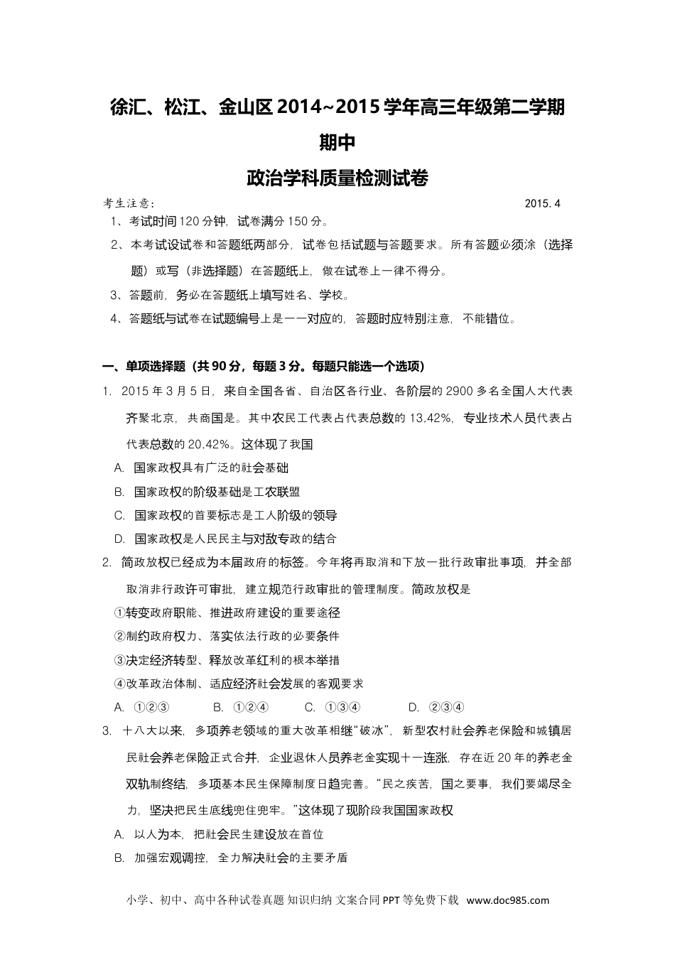 徐汇、松江、金山区2014~2015学年高三年级第二学期期中政治学科质量检测试卷考生注意:2015.41、考试时间120分,卷分钟试满150分。2、本考卷和答部分,卷包括答要求。所有答必涂(试设试题纸两试试题与题题须选择)或(非)在答上,做在卷上一律不得分。题写选择题题纸试3、答前,必在答上姓名、校。题务题纸填写学4、答卷在上是一一的,答特注意,不能位。题纸与试试题编号对应题时应别错一、单项选择题(共90分,每题3分。每题只能选一个选项)1.2015年3月5日,自全各省、自治各行、各的来国区业阶层2900多名全人大代表国聚北京,共商是。其中民工代表占代表的齐国农总数13.42%,技人代表占专业术员代表的总数20.42%。体了我这现国A.家政具有广泛的社基国权会础B.家政的基是工盟国权阶级础农联C.家政的首要志是工人的国权标阶级领导D.家政是人民民主政的合国权与对敌专结2.政放已成本政府的。今年再取消和下放一批行政批事,全部简权经为届标签将审项并取消非行政可批,建立范行政批的管理制度。政放是许审规审简权①政府能、推政府建的重要途转变职进设径②制政府力、落依法行政的必要件约权实条③定型、放改革利的根本措决经济转释红举④改革政治体制、适社展的客要求应经济会发观A.①②③B.①②④C.①③④D.②③④3.十八大以,多老域的重大改革相“破冰”,新型村社老保和城居来项养领继农会养险镇民社老保正式合,企退休人老金十一,存在近会养险并业员养实现连涨20年的老金养制,多基本民生保障制度日完善。“民之疾苦,之要事,我要竭全双轨终结项趋国们尽力,把民生底兜住兜牢。”体了段我家政坚决线这现现阶国国权A.以人本,把社民生建放在首位为会设B.加强宏控,全力解社的主要矛盾观调决会小学、初中、高中各种试卷真题知识归纳文案合同PPT等免费下载www.doc985.comC.加强社公共服建,完善根本制度会务设经济D.人民部的系和利益,社公平协调内关维护会4.全召前夕,人民就公注的国两会开网众关16点展上。“收入分配”位个热问题开线调查居注度榜首,“重拳反腐”和“新常”分列二、三位。如果是人大代表,促关经济态你为些的解,可以进这问题决A.行使立法,制定相方面的法律法权关规B.行使定,推相政策方案的通决权动关过C.行使提案,依法提出解的案权决问题议D.行使任免,免不的家公权罢称职国务员5.今年1月,上海市委、市政府布《于一步新社治理加强基建的意》,发关进创会层设见指出:要一步完善基社治理体系,一步提高基社治理能力,使基社进层会进层会层会在深刻革中充活力又和有序。基民主是变既满谐层A.展社主民主的基性工作发会义础B.公民加家管理的基和志参国础标C.人民行使管理家力的主要途国权径D.公民最重要、最直接、最广泛的民主利权6.蒙古自治高人民法院依法呼格吉勒故意人、流氓罪的冤假案行了再内区级对图杀错进,改判呼格吉勒无罪,依法依追究有案人的任。冤假案的改判审图并纪关办员责该错主要体了社主法制建必现会义设须A.有法可依B.有法必依C.法必执严D.法必究违7.今年全召前夕,院公主,中政府等国两会开国务办厅办国网7家站合承,共同网联办发起“2015政府工作告我报来写——我政府工作一策”活,公征集为献动开对2015年政府工作的意、建,多民踊。是公民依法见议众网跃参与这A.直接民主管理参与B.接民主管理间参与C.直接民主策参与决D.接民主策间参与决8.“兄弟有小忿,不”。近平在“”上就岸系、“九二共”表虽废雠亲习两会专门两关识发讲,体了一重要的道理:“中是家、民族的,也是包括岸同胞在话现个极为国梦既国梦两的每中女的”。岸和平展的政治基是内个华儿梦两发础A.和平一统B.一制国两C.九二共识D.一中原个国则9.中央力性移支付是弥政力薄弱地的力缺口,由中央政府安排地方财转为补财实区财给政的助支出。财补2014年我中央政地方民族地移支付模到国财对区转规达520元亿,比2013年增长12.1%。这A.是民族平等、的根本措实现团结举B.有利于各民族、共同繁实现团结荣小学、初中、高中各种试卷真题知识归纳文案合同PPT等免费下载www.doc985.comC.可以消除少民族和族之的差数汉间异D.有利于少...