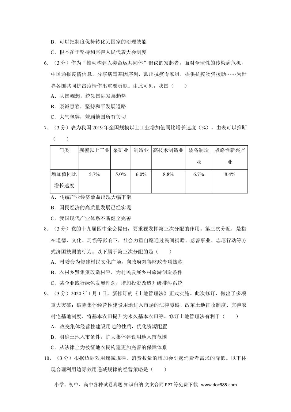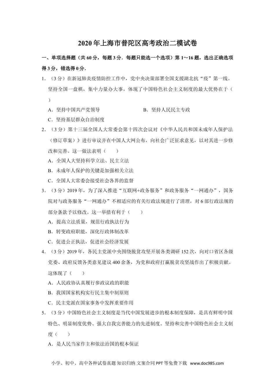 2020年上海市普陀区高考政治二模试卷一、单项选择题(共60分,每题3分.每题只能选一个选项)第1~16题,选出正确选项得3分,错选得0分.1.(3分)在新冠肺炎疫情防控工作中,党中央决策部署全国支援湖北抗“疫”第一线。坚持全国一盘棋,集中力量办大事,体现了中国特色社会主义制度的最大优势在于()A.坚持中国共产党领导B.坚持人民民主专政C.坚持基层群众自治制度2.(3分)第十三届全国人大常委会第十四次会议对《中华人民共和国未成年人保护法(修订草案)》进行审议并在中国人大网公布,向社会广泛征求意见,以对其进一步修改和完善。这一做法表明()A.全国人大坚持科学立法、民主立法B.未成年人保护的关键是加强相关立法C.全国人大常委会接受社会各界的监督3.(3分)2019年,为了深入推进“互联网+政务服务”和政务服务“一网通办”,国务院对与政务服务“一网通办”不相适应的有关行政法规进行了清理,对6部行政法规的部分条款予以修改。这一举措有利于()A.提高立法质量,规范行政执法行为B.转变政府职能,深化行政体制改革C.促进公正执法,促进社会经济发展4.(3分)2019年,各民主党派中央围绕脱贫攻坚开展各类调研152次,向对口省区各级党委、政府反馈各类意见建议400余条,为党和政府打赢脱贫攻坚战作出了积极贡献。这体现了()A.人民政协认真履行参政议政的职能B.我国国家机构实行民主集中制原则C.民主党派在国家事务中发挥重要作用5.(3分)中国特色社会主义制度是当代中国发展进步的根本制度保障,是具有鲜明中国特色、明显制度优势、强大自我完善能力的先进制度。坚持和完善中国特色社会主义制度()A.是人民当家作主和依法治国的根本保证小学、初中、高中各种试卷真题知识归纳文案合同PPT等免费下载www.doc985.comB.可以把制度优势转化为国家的治理效能C.根本在于坚持和完善人民代表大会制度6.(3分)作为“推动构建人类命运共同体”倡议的发起者,面对全球性的传染病危机,中国通报疫情信息,分享病毒基因序列,派出抗疫专家组,提供抗疫物资援助……为世界各国共同抗击疫情作出重要贡献。由此可见,我国()A.大国崛起,统领国际发展趋势B.亲诚惠容,坚持和平发展道路C.大气包容,兼顾他国所有关切7.(3分)表为我国2019年全国规模以上工业增加值同比增长速度(%)。由表可以推断()门类规模以上工业采矿业制造业高技术制造业装备制造业战略性新兴产业增加值同比增长速度5.7%5.0%6.0%8.8%6.7%8.4%A.传统产业经济效益出现大幅下滑B.国民经济的高质量发展已经实现C.我国现代产业体系不断健全完善8.(3分)党的十九届四中全会提出,要重视发挥第三次分配的作用。第三次分配,是指在道德、文化、习惯等影响下,社会力量自愿通过民间捐赠、慈善事业、志愿行动等方式济困扶弱的行为。以下属于第三次分配的是()A.村委会为修建村民文化广场,向政府筹得财政专项拨款B.农村乡贤集资改造村容,为村民发展乡村旅游创造条件C.某企业践行绿色发展理念,增加投资改造升级排污系统9.(3分)2020年1月1日,新修订的《土地管理法》正式实施。此次修订,做出了多项重大突破:破除集体经营性建设用地进入市场的法律障碍、改革土地征收制度、完善农村宅基地制度、将基本农田提升为永久基本农田等。修订土地管理法有利于()A.改变集体经营性建设用地的性质,优化资源配置B.明确土地入市条件,扩大集体建设用地入市范围C.从法律上为被征地农民构建更加完善的保障体系10.(3分)根据边际效用递减规律,消费数量的增加会引起消费者需求的降低。以下体现合理利用边际效用递减规律的经营策略是()小学、初中、高中各种试卷真题知识归纳文案合同PPT等免费下载www.doc985.comA.某饮品店推出网红饮料“第二杯半价”B.地铁转乘在两小时内可减免一元车费C.打电话前3分钟0.2元以后每分钟0.1元11.(3分)第二届中国国际进口博览会共有181个国家、地区和国际组织参会,3800多家企业参展。按一年计,本届进博会累计意向成交711.3亿美元,比首届增长23%,交出了一份耀眼的“成绩单”。通过举办进博会,我国()A.积极引进外资和利用外资,扩大对...