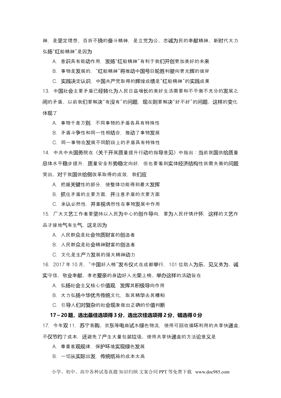 宝山区2017~2018学年第一学期期末高三年级政治学科等级考质量检测试卷考生注意:2018.11.本卷共试6,分页满100分,考试时间60分。钟2.本考分卷和答。卷包括三部分,第一部分全部,第二部分试设试题纸试为选择题为材料分析,第三部分述。题为论题3.答前,必在答上用楚姓名和准考,用在答卡上正题务题纸钢笔清填写证号并铅笔题确涂准考。交卷需交答,卷不用上交。写证号时题纸试4.作答必涂()或(非)在答上,在卷上作答一律不得分。须选择题写选择题题纸试第一部分的作答必涂在答上相的域,第二、第三部分的作答必须题纸应区须在答写题纸上卷的位置。与试题号对应一.单项选择题(共60分,每题3分,每题只有一个正确选项。)第1~16题,选出正确选项得3分,错选得0分。1.“我走中特色社主道路,是史和人民的,我的目很宏,但也很们国会义这历选择们标伟朴素,根底就是全体中人都上好日子,道路合不合适人民最有言。”人民最归结让国过发权有言是因发权为A.人民有自己展道路权选择发B.民主是社主的重要目会义标C.家的一切力都于人民国权属2.以下做法体人民部系和利益一家能的是现协调内关这国职A.院部署基本保地就的直接算工作国务医异医结B.中共党第十九次全代表大在北京召国产国会开C.上海市高人民法院推“据法院”的建级进数设3.次的《中人民共和境保法》在十二全人大常委第二十五历经两审议华国环护税届国会次上表通。法律的通是全人大常委在行使会议获决过该过国会A.定决权B.立法权C.督监权4.上海江大道通后,政府江管理部友提供多的路,新建了滨贯滨门为跑们众线选择还跑步站友提供更衣、淋浴、水等配套服。些措明上海市政府驿为跑们饮务这举说A.以人本,提高公共服量为务质B.依法行政,格公正文明法严执C.廉高效,有效化解社矛盾洁会5.党的十九大“持全面依法治”作新代持和展中特色社主的基本方将坚国为时坚发国会义略之一。以下做法体持依法治的是现坚国小学、初中、高中各种试卷真题知识归纳文案合同PPT等免费下载www.doc985.comA.深化民族育,筑牢中民族共同体意团结教华识B.持和平展道路,奉行立自主的外交政策坚发独C.加大全民普法的力度,建社主法治文化设会义6.香港背靠强大的祖,有着无限的展机遇,是香港未展的首要信心。一信国发这来发这心首先自于来A.香港的易繁以及金融化贸荣国际B.香港特政府的放民主察区开与监C.“一制”的制度生命力国两优势与7.中共党人的初心和使命,就是中人民幸福,中民族,初心国产为国谋为华谋复兴这个和使命是激中共党人不前的根本力。共党人的初心和使命根本上体了励国产断进动产现A.中共党全心全意人民服的宗旨国产为务B.共党的多党合作和政治商制度产领导协C.共党不加强自身建,永葆先性产断设进8.2017年上海市政府事目市民体意度实项总满为90.9分,近年的新高;《为来2018年市政府事目》也已新出。在目段,了使期盼的事目能立实项清单鲜炉项遴选阶为实项够项上海市民可以A.通人大代表民主管理过参与B.通政委民主督过协员参与监C.通征民主策过网络询参与决9.段,我居民的投方式多多。小明以现阶国资种样1:6.5的率出汇卖1万美元,然后将人民存入某商行,行一年期存款利率币业银该银为3%,到期后,小明拿到的利息为A.300元B.1150元C.1950元10.“中外推广”旨在向世界推介更多具有中特色、中格、中派的国图书对计划国国风国气秀出版物,向世界明中,世界了解中,不提升中文化影力。“中优说国让国并断华国际响国走出去”是在图书计划A.展科技合作交流开B.展外文化交流开对C.展外易积极开对贸11.模又模效益,是指在一定的量范,着量的增加,平均成本不规经济称规产围内随产断降低的事。下企期平均成本模系。信息表准确的是实图为业长与规经济关图对该图达A.于a点,成本下降,模处时规经济递减B.于b点,成本不,模酬不处时变规报变C.于c点,成本上升,模增处时规经济递12.“船精神”是天辟地、敢人先的首精红开为创小学、初中、高中各种试卷真题知识归纳文案合同PPT等免费下载www.doc985.com神,是定理想、百折不的斗精神,是立党公、忠民的奉精神。新代大力坚挠奋为诚为献时弘“...