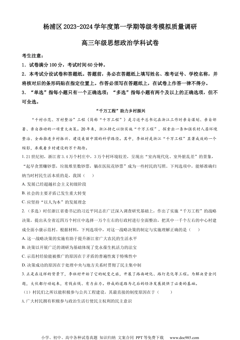 小学、初中、高中各种试卷真题知识归纳文案合同PPT等免费下载www.doc985.com杨浦区2023-2024学年度第一学期等级考模拟质量调研高三年级思想政治学科试卷考生注意:1.试卷满分100分,考试时间60分钟。2.本考试分设试卷和答题纸。答题前,务必在答题纸上填写姓名、准考证号、学校名称,并将核对后的条形码贴在指定位置上。作答必须写在答题纸上,在试卷上作答一律不得分。3.“单选”指每小题只有一个正确选项;“多选”指每小题有两个及以上的正确选项,但不可全选。“千万工程”助力乡村振兴“千村示范、万村整治”工程(简称“千万工程”)是习近平总书记在浙江工作时亲自谋划、亲自部署、亲自推动的一项重大决策。20年来,浙江持之以恒实施“千万工程”,探索出一条加强农村人居环境整治、全面推进乡村振兴、建设美丽中国的科学路径。其中,李祖村是浙江“千万工程”显著成效的一个缩影,承载着乡村建设的万千期待。1.21世纪初,浙江省3.4万个村庄中,3万个村环境较差,呈现出“室内现代化、室外脏乱差”的景象,“起早贪黑赚钞票,垃圾堆里数钞票,躺在医院花钞票”成为一些村民的写照。下列选项中,能够准确归纳当时村民生活本质的是,我国()A.发展已经超越社会主义初级阶段B.社会的主要矛盾已发生重大转变C.应坚持“以人为本”的发展理念2.(多选)时任浙江省委书记的习近平同志在广泛深入调查研究基础上,作出了实施“千万工程”的战略决策,提出从全省近四万个村庄中选择一万个左右的行政村进行全面整治,把其中一千个左右的中心村建成全面小康示范村。根据材料,下列选项中,对这一战略决策的制定与实施理解正确的是()A.这一战略决策的实施有助于提升浙江省广大农民的生活水平B.决策以开展广泛的调研为基础体现了党永葆生机活力的法宝C.示范村经验能被推广的原因在于矛盾的普遍性寓于特殊性中D.决策成功的原因在于处理中央与地方关系时贯彻了民主集中制3.正是在这样的背景下,李祖村开始了它的蜕变之旅,开展了路面硬化、路灯亮化等工程。为解决资金问题,大伙都行动起来,有钱出钱、有力出力。修成的道路为之后的经济发展提供了必要的基础。(1)村民们之所以能积极参与公共工程建设,其最直接的制度原因在于()A.广大村民拥有积极参与政治生活行使民主权利的民主意识小学、初中、高中各种试卷真题知识归纳文案合同PPT等免费下载www.doc985.comB.基层群众自治制度赋予了村民广泛的参与民主管理的渠道C.村民作为人民的一部分是我国社会主义建设事业的主人翁(2)(多选)李祖村持续推进本村的环境美化,良好的生态环境引来了“金凤凰”,目前已引进各类创业主体52家,既有创业的老村民,也有青年归乡人。丰富业态成为青年创客“展现才华的用武之地”,也带动了乡村发展,让全村人均可支配收入增加到5.2万元。由此可见()A.发展壮大农村集体经济有助于民生的改善B.建设现代市场体系才能实现资源优化配置C.非公有制经济成为改善民生的重要力量D.公共服务的优化促进了共同富裕的实现(3)刚刚大学毕业的小陈同学看到了乡村“美丽经济”背后的勃勃商机,决定用自己已有的积蓄进行投资扎根农村,以经营民宿的方式自主创业。小陈新建民宿的相关设施已就绪,准备投入运营。从法律的角度,小陈同学在创业程序上还存在哪些疏漏之处。______4.(多选)以“千万工程”为代表,经历二十年的发展,我国的城乡居民收入比从2003年的2.43缩小到2022年的1.90,这一变化趋势有助于为我国经济()A.提供澎湃的发展动力B.实现城乡之间平衡发展C.创造永续发展的条件D.落实发展为人民的目标5.浙江历届省委、省政府不断丰富“千万工程”这一政策的内涵:从“千村示范、万村整治”引领起步,推动乡村更加整洁有序,到“千村精品、万村美丽”深化提升,推动乡村更加美丽宜居,再到“千村未来、万村共富”迭代升级,强化数字赋能,逐步形成“千村向未来、万村奔共富、城乡促融合、全域创和美”的生动局面。结合材料,综合所学,从实践与认识的关系的角度,说明“千万工程”政策理念要在不同阶段不断丰富政策内涵的哲学依据。【答案】1.B2.ABC3..①B.②CD.③小陈正式经营民宿之前,应当按照规...