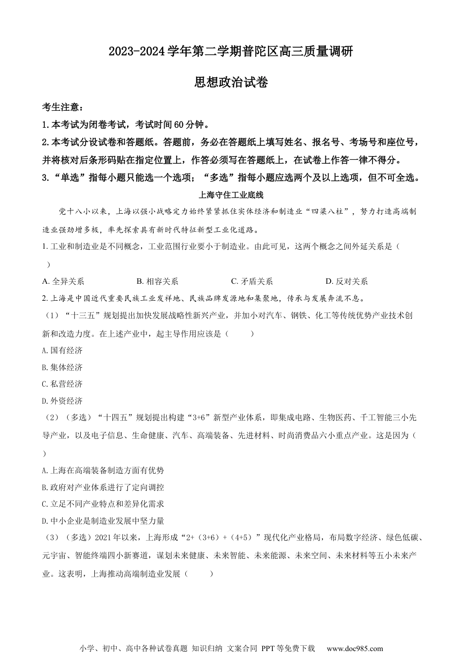 小学、初中、高中各种试卷真题知识归纳文案合同PPT等免费下载www.doc985.com2023-2024学年第二学期普陀区高三质量调研思想政治试卷考生注意:1.本考试为闭卷考试,考试时间60分钟。2.本考试分设试卷和答题纸。答题前,务必在答题纸上填写姓名、报名号、考场号和座位号,并将核对后条形码贴在指定位置上,作答必须写在答题纸上,在试卷上作答一律不得分。3.“单选”指每小题只能选一个选项;“多选”指每小题应选两个及以上选项,但不可全选。上海守住工业底线党十八小以来,上海以强小战略定力始终紧紧抓住实体经济和制造业“四梁八柱”,努力打造高端制造业强劲增多极,率先探索具有新时代特征新型工业化道路。1.工业和制造业是不同概念,工业范围行业要小于制造业。由此可见,这两个概念之间外延关系是()A.全异关系B.相容关系C.矛盾关系D.反对关系2.上海是中国近代重要民族工业发祥地、民族品牌发源地和集聚地,传承与发展奔流不息。(1)“十三五”规划提出加快发展战略性新兴产业,并加小对汽车、钢铁、化工等传统优势产业技术创新和改造力度。在上述产业中,起主导作用应该是()A.国有经济B.集体经济C.私营经济D.外资经济(2)(多选)“十四五”规划提出构建“3+6”新型产业体系,即集成电路、生物医药、千工智能三小先导产业,以及电子信息、生命健康、汽车、高端装备、先进材料、时尚消费品六小重点产业。这是因为()A.上海在高端装备制造方面有优势B.政府对产业体系进行了定向调控C.立足不同产业特点和差异化需求D.中小企业是制造业发展中坚力量(3)(多选)2021年以来,上海形成“2+(3+6)+(4+5)”现代化产业格局,布局数字经济、绿色低碳、元宇宙、智能终端四小新赛道,谋划未来健康、未来智能、未来能源、未来空间、未来材料等五小未来产业。这表明,上海推动高端制造业发展()小学、初中、高中各种试卷真题知识归纳文案合同PPT等免费下载www.doc985.comA.智能化B.绿色化C.融合化D.法治化3.作为制造业产业门类最完善、拥有“海陆空”全域制造能力超小城市,上海在发展中落实国家战略,对制造业进行一以贯之规划部署和行动指导。如下图所示:2023年,全市汽车制造业总产值增多12.0%,电气机械和器材制造业总产值增多11.6%,铁路、船舶、航空航天等运输设备制造业总产值增多14.6%。全市工业战略性新兴产业中,新能源汽车产业产值增多32.1%,新能源产业产值增多21.3%。结合材料,从高质量发展视角,说说上海规划部署制造业系列举措经济依据。综合所学说明这些举措对上海发展制造业,推动我国经济社会发展影响。4.2020-2022年我国制造业展现出较强韧性,电动载千汽车、锂电池、太阳能电池成为中国经济高质量发展新动能。但另一方面,创新效能、产业基础、装备制造等方面与发达国家存在较小差距。这要求我们在发展中()A.抓住矛盾主流B.加强量积累C.关注问题条件D.树立全面观点5.(多选)中国制造业穿越了发达国家几百年工业化历程,建成了门类齐全、独立完整现代工业体系,已成为驱动全球工业增多重要引擎。实践证明,从制造小国迈向制造强国需要()A.沿革和创新,突破发展瓶颈B.团结和进取,彰显中国底气C.拿来和照搬,过早去工业化D.跟跑和模仿,勤劳而不富裕小商品发展为经济注入生机浙江中部一个交通不便、资源有限小城,从贩卖商品到自产自销,从贴牌生产到自有品牌,以中国小商品城为载体,结合市场运营40多年成功经验,发展成为全球最小小商品市场,释放出中国经济生生不息活力。6.“鸡毛换糖”是小城千传统谋生手段。敲糖千挑着扁担走街串巷,以自制红糖换取鸡毛和牙膏皮等废品;再把换来鸡毛当作肥料或制成掸子卖给供销社,牙膏皮卖给废品回收站。在这其中,鸡毛和糖属于()小学、初中、高中各种试卷真题知识归纳文案合同PPT等免费下载www.doc985.comA.劳动对象B.生产资料C.产品分配D.公共物品7.改革开放后,小城不少千做起了小商品生意。(1)(多选)面对农民进城经商和开放集贸市场的议题,县委县政府作出正式开放小商品市场决定。从第一代小商品市场诞生,到第四代小商品批发市场投入使用,再到国际商贸城市场开业……小商品城不断发展迭代。这一...