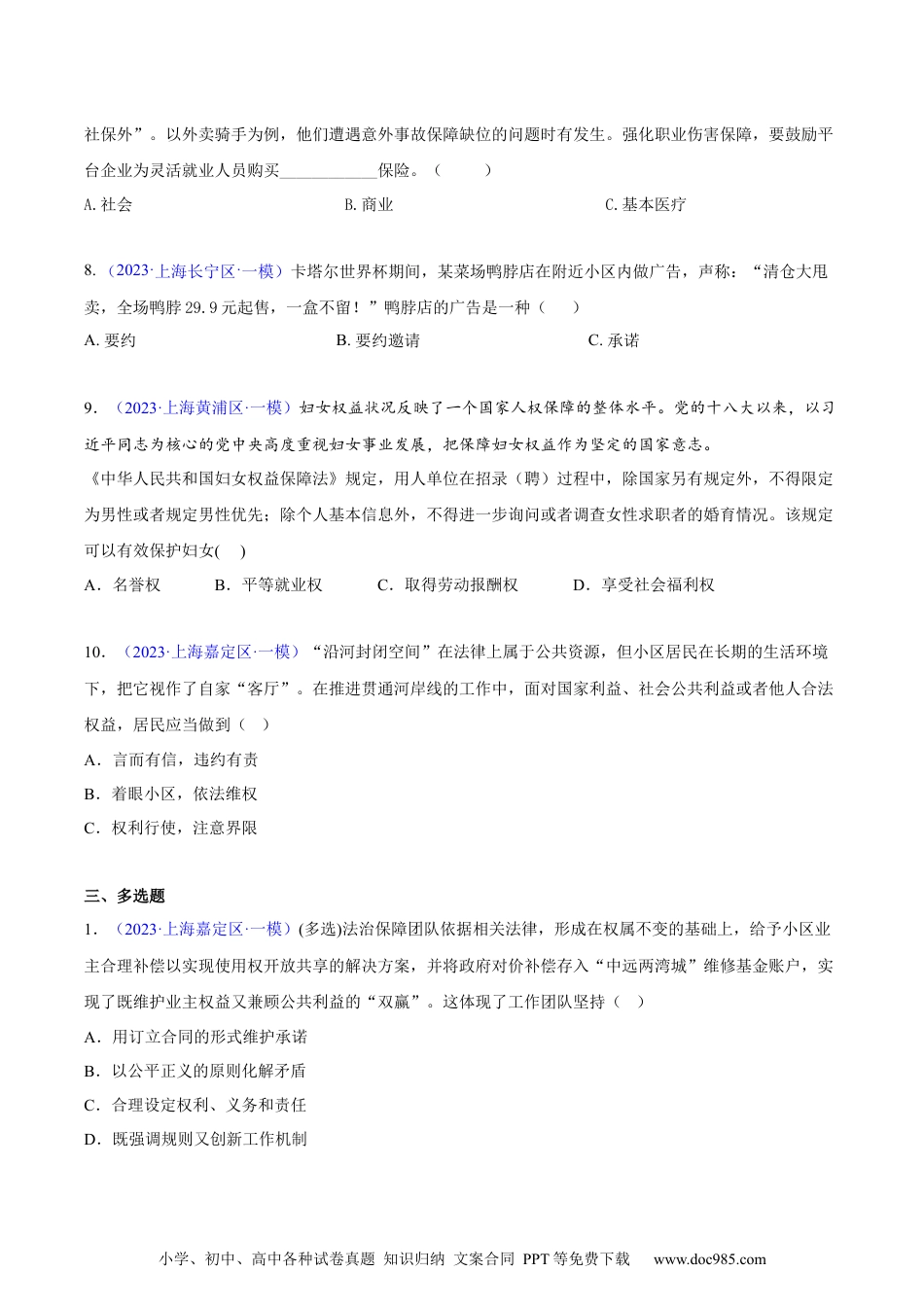 小学、初中、高中各种试卷真题知识归纳文案合同PPT等免费下载www.doc985.com专题09法律与生活一、填空题1.(2023·上海虹口区·一模)电子商务的不断成长,激发了人们新一轮的消费动力。但有的电子商务平台用“添加保障”“享受立减”等代替“购买保险”,用“放弃优惠”代替“不买保险”,类似模糊语言让消费者在毫无防备的情况下容易上当受骗。若某消费者选择通过诉讼方式维权,则属于______(民事诉讼/行政诉讼/刑事诉讼),那么,______负有举证责任。二、单选题1.(2023·上海虹口区·一模)电子商务的不断成长,激发了人们新一轮的消费动力。但有的电子商务平台用“添加保障”“享受立减”等代替“购买保险”,用“放弃优惠”代替“不买保险”,类似模糊语言让消费者在毫无防备的情况下容易上当受骗。对此,下列认识正确的是()A.互联网消费捆绑搭售行为侵犯了消费者的知情权和自主选择权B.一旦勾选,即使消费者是误选此类搭售行为,双方的合同也不可撤销C.遭遇此种行为,消费者在维权过程中申请仲裁是提起诉讼的必经程序2.(2023·上海虹口区·一模)如果长江流域某石化厂排污造成了长江流域污染,在诉讼中该厂认为其“一直进行封闭生产,并对排污进行了严格监测,其排放完全达标。”假设其说明为事实,该厂是否应承担民事责任()A.不应该,该厂没有主观过错B.应该,但可减轻其处罚程度C.应该,承担无过错侵权责任3.(2023·上海浦东区·一模)随着我国数字经济的蓬勃发展,网络消费已成为人们日常生活的一部分。我国法律及相关司法解释规定:七日无理由退货;经营者不得以商品已拆封为由拒绝消费者行使无理由退货权。此项规定着力保障了消费者的()A.安全消费权B.知情权C.自主选择权4.(2023·上海浦东区·一模)随着互联网的兴起,社区“团菜”、“团特产”、“团鲜花”……成了当下流行的生活方式,“社区团购”成为互联网行业及市场热议的话题。小学、初中、高中各种试卷真题知识归纳文案合同PPT等免费下载www.doc985.com下图是某社区微信群团购商品的记录,据此回答以下问题:(1)此次交易采用的合同形式是()A.口头形式B.书面形式(2)在图示聊天记录中的对话③,是订立合同过程中的()A.要约邀请B.要约C.承诺5.(2023·上海杨浦区·一模)《中华人民共和国黄河保护法》第一百一十九条第一款规定“在黄河流域破坏自然资源和生态、污染环境、妨碍防洪安全、破坏文化遗产等造成他人损害的,侵权人应当依法承担侵权责任。”此处的侵权责任指,不论主观上是否有过错,都要承担侵权责任,应适用()A.过错侵权责任B.过错推定责任C.无过错侵权责任6.(2023·上海长宁区·一模)在就业总量的压力之下,各种隐性或显性的就业歧视不断滋生,年龄歧视、学历歧视、性别歧视……五花八门的限制门槛成了很多人就业路上的“拦路虎”。对劳动者的就业歧视,违反了《中华人民共和国劳动法》中_____________的原则。()A.保护劳动者的合法权益B.劳动者平等竞争C.特殊劳动保护7.(2023·上海长宁区·一模)随着平台经济发展,新就业形态层出不穷,网约配送员、网约车驾驶员等劳动者数量大幅增加。二十大报告提出支持和规范发展新就业形态,加强灵活就业和新就业形态劳动者权益保障。数据显示,中国灵活就业人员数量超过2亿人。但很多灵活就业者被“困在系统里、绑在算法上、游离在小学、初中、高中各种试卷真题知识归纳文案合同PPT等免费下载www.doc985.com社保外”。以外卖骑手为例,他们遭遇意外事故保障缺位的问题时有发生。强化职业伤害保障,要鼓励平台企业为灵活就业人员购买____________保险。()A.社会B.商业C.基本医疗8.(2023·上海长宁区·一模)卡塔尔世界杯期间,某菜场鸭脖店在附近小区内做广告,声称:“清仓大甩卖,全场鸭脖29.9元起售,一盒不留!”鸭脖店的广告是一种()A.要约B.要约邀请C.承诺9.(2023·上海黄浦区·一模)妇女权益状况反映了一个国家人权保障的整体水平。党的十八大以来,以习近平同志为核心的党中央高度重视妇女事业发展,把保障妇女权益作为坚定的国家意志。《中华人民共和国妇女权益保障法》规定,用人单位在招录(聘)过程中,除国家...