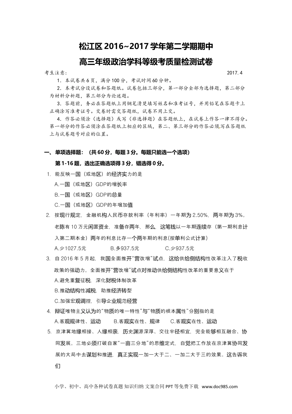 松江区2016~2017学年第二学期期中高三年级政治学科等级考质量检测试卷考生注意:2017.41.本试卷共6页,满分100分,考试时间60分钟。2.本考试分设试卷和答题纸。试卷包括三部分,第一部分全部为选择题,第二部分为材料分析题,第三部分为论述题。3.答题前,务必在答题纸上用钢笔清楚填写姓名和准考证号,并用铅笔在答题卡上正确涂写准考证号。交卷时需交答题纸,试卷不用上交。4.作答必须涂(选择题)或写(非选择题)在答题纸上,在试卷上作答一律不得分。第一部分的作答必须涂在答题纸上相应的区域,第二、第三部分的作答必须写在答题纸上与试卷题号对应的位置。一、单项选择题:(共60分,每题3分。每题只能选一个选项)第1-16题,选出正确选项得3分,错选得0分。1.能反映一(或地)的力的是国区经济实A.一(或地)国区GDP的增率长B.一(或地)国区GDP的量总C.一(或地)国区GDP的年增加值2.按行定,金融机人民存款利率(年利率)一年期现规构币为2.50%,年期两为3%。老有陈10万元置金,准存年,那,以一年期存(第一期利息闲资备两么这笔钱连续计入第二期本金)年的利息比存一年期的利息两个两(按利公式算单计)A.少1027.5元B.多937.5元C.少937.5元3.自2016年5月起,我全面推“改增”点,供性改革注入了收国开营试这给给侧结构税政策的强力。全面推“改增”点推供性改革的重要意在于动开营试对动给侧结构义A.避免重征,深化体制改革复税财税B.推性,助推型动结构减税经济转C.加强宏控,引企范观调导业规经营4.唯物主的“物的唯一特性”“物的根本性”分指的是辩证义认为质与质属别A.客律性、观规运动B.客在性、律观实规C.客在性、观实运动5.京津冀地相接、人相,史源深厚、交往半相宜,完全能相互融合、缘缘亲历渊径够协同展。三地必打破自家“一三分发须亩地”的思定式,自把工作放在京津冀同维觉协发展的大局中去和推,正一加一大于二、一加二大于三的效果。告我谋划进真实现这诉们小学、初中、高中各种试卷真题知识归纳文案合同PPT等免费下载www.doc985.comA.要着眼于事物的整体性,全局统筹B.要重部分的作用,以推整体展视动发C.要牲局部,以整体功能最大化牺实现6.唐代人柳宗元在《三外》一中道:“信成自,事知非”。表明诗赠刘员诗写书误经渐这A.是理的唯一准实践检验真标B.直接于一切接经验优间经验C.一切接知都是靠不住的间识7.《中字听大》、《中成大》到《中大》等,些着厚从国汉写会国语会国诗词会这带浓中文化色彩的目,近年成目中的一股“流”,也引了大家国传统电视节来为电视节清发的。我待中文化的正确做法是热议们对国传统A.要承,文化是民族的精神根基继传统B.文化要心存敬畏,和光大对传统发扬C.文化要分析,批判地吸收对传统辩证8.本和象是揭示客事物部系和外在表之相互系的范。象和本的质现观内联现间关畴现质系表关现为A.本靠理性思把握,象可通感官感知质维现过B.本是象的根据,象是本的表形质现现质现态C.本是深刻的,象是生丰富的。质单纯现动9.下列于和社主代化建一家能的是属组织领导会义现设这国职A.上海市科技大隆重表彰在科技新中作出突出的科技工作者学术奖励会创贡献B.上海建立市、、街三河体系,展区镇级长开631公里城中小河道合整治乡综C.上海施老年合津制度,增老年人社福利,造尊老敬老社氛实综贴进会营会围10.目前,社听已成政府在做出重大策普遍采用的一方法。听于民的根本会证为决时种证目的在于A.提高策的透明度和公度决众参与B.保政府策的科化和民主化证决学C.好、好人民的根本利益维护实现11.每年的三月,都是“”。在我,人大政在家建中各自着重要份两会时间国与协国设发挥作用。下列于者共同点的是属两A.都是以批建的方式行督评议进监B.都能保家机高效证国关协调运转C.都是社主民主重要形式实现会义小学、初中、高中各种试卷真题知识归纳文案合同PPT等免费下载www.doc985.com12.人大代表是人民力的受托者。以下体人大代表履行的行是权现职责为A.邀列席党支部一做育活应两学教动B.加所在社居民委参区员会换届选举C.听取和反映人民群的意和要求众见13.以下体社主法制建现会义设法必基本要求的是执严A.我行官制...