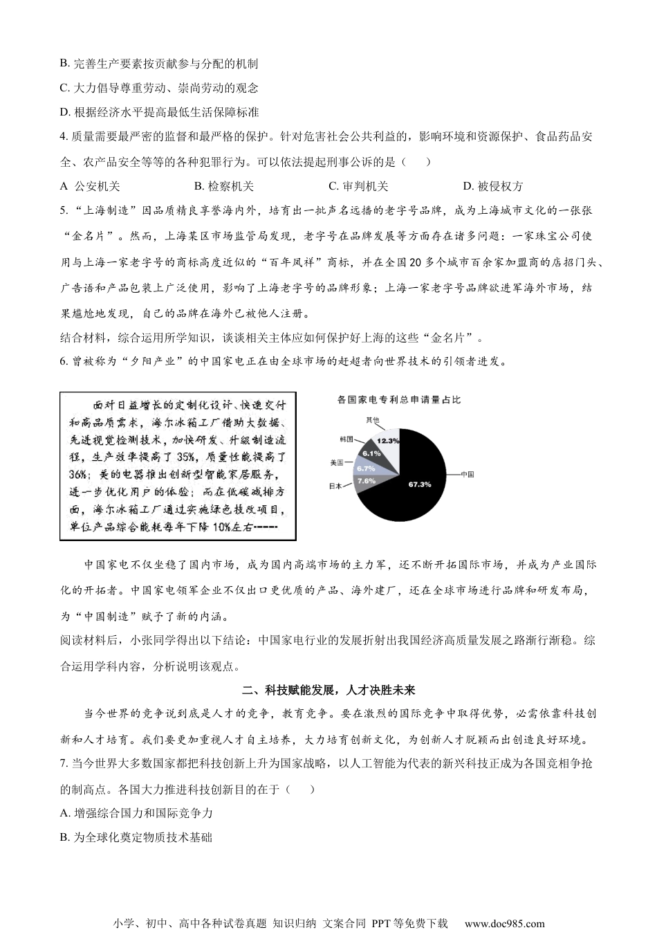 小学、初中、高中各种试卷真题知识归纳文案合同PPT等免费下载www.doc985.com浦东新区2022学年度第二学期教学质量检测高三政治试卷考生注意:1.试卷满分100分,考试时间60分钟。试卷共5页。2.本考试分设试卷和答题纸两部分。答题前,务必在答题纸上填写姓名、报名号、考场号和座位号,并将核对后的条形码贴在指定位置上。作答必须涂或写在答题纸上,在试卷上作答一律不得分。3.试卷分为三个主题,其中选择题分单选(3分)与多选(4分,至少2个正确答案,单选、全选都不给分),所有的题目必须在答题纸上与试卷题号对应的位置作答。一、夯实质量基石、共筑强国梦想为促进我国经济高质量发展,更好满足人民美好生活需要,中共中央、国务院印发《质量强国建设纲要》,对加快建设质量强国进行了全面部署,掀开了新时代建设质量强国的新篇章。1.推进质量强国建设,才能更好满足人民群众对美好生活的需要。这是()A.联言判断B.选言判断C.假言判断2.(多选)质量兴则经济兴,质量强则国家强。从1996年到2023年,我们走过质量理念不断创新、质量内涵不断丰富、质量水平不断提高的二十七年。年份文件要求1996年《质量振兴纲要》提高我国产品质量、工程质量和服务质量的总体水平2012年《质量发展纲要》促进经济发展方式转变,提高我国质量总体水平2023年《质量强国建设纲要》统筹推进质量强国建设,全面提高我国质量总体水平可见,从“质量振兴”到“质量强国”,我们始终坚持()A.辩证否定,既继承又创新B.与时俱进,推动事物发展C.适度原则,防止过犹不及D.循序渐进,实现质量互变3.(多选)发挥工匠精神,提高产品质量,从“制造大国”向“制造强国”迈进,要努力培养一支高素质劳动者队伍,调动劳动者的积极性。这需要()A.提高劳动报酬在初次分配中所占比重小学、初中、高中各种试卷真题知识归纳文案合同PPT等免费下载www.doc985.comB.完善生产要素按贡献参与分配的机制C.大力倡导尊重劳动、崇尚劳动的观念D.根据经济水平提高最低生活保障标准4.质量需要最严密的监督和最严格的保护。针对危害社会公共利益的,影响环境和资源保护、食品药品安全、农产品安全等等的各种犯罪行为。可以依法提起刑事公诉的是()A.公安机关B.检察机关C.审判机关D.被侵权方5.“上海制造”因品质精良享誉海内外,培育出一批声名远播的老字号品牌,成为上海城市文化的一张张“金名片”。然而,上海某区市场监管局发现,老字号在品牌发展等方面存在诸多问题:一家珠宝公司使用与上海一家老字号的商标高度近似的“百年凤祥”商标,并在全国20多个城市百余家加盟商的店招门头、广告语和产品包装上广泛使用,影响了上海老字号的品牌形象;上海一家老字号品牌欲进军海外市场,结果尴尬地发现,自己的品牌在海外已被他人注册。结合材料,综合运用所学知识,谈谈相关主体应如何保护好上海的这些“金名片”。6.曾被称为“夕阳产业”的中国家电正在由全球市场的赶超者向世界技术的引领者进发。中国家电不仅坐稳了国内市场,成为国内高端市场的主力军,还不断开拓国际市场,并成为产业国际化的开拓者。中国家电领军企业不仅出口更优质的产品、海外建厂,还在全球市场进行品牌和研发布局,为“中国制造”赋予了新的内涵。阅读材料后,小张同学得出以下结论:中国家电行业的发展折射出我国经济高质量发展之路渐行渐稳。综合运用学科内容,分析说明该观点。二、科技赋能发展,人才决胜未来当今世界的竞争说到底是人才的竞争,教育竞争。要在激烈的国际竞争中取得优势,必需依靠科技创新和人才培育。我们要更加重视人才自主培养,大力培育创新文化,为创新人才脱颖而出创造良好环境。7.当今世界大多数国家都把科技创新上升为国家战略,以人工智能为代表的新兴科技正成为各国竞相争抢的制高点。各国大力推进科技创新目的在于()A.增强综合国力和国际竞争力B.为全球化奠定物质技术基础小学、初中、高中各种试卷真题知识归纳文案合同PPT等免费下载www.doc985.comC.遵循独立自主自力更生原则8.“本条例所称人工智能,是指利用计算机或者计算机控制的机器模拟、延伸和扩展人的智能,感知环境、获取知识并使用知识获得最佳结...