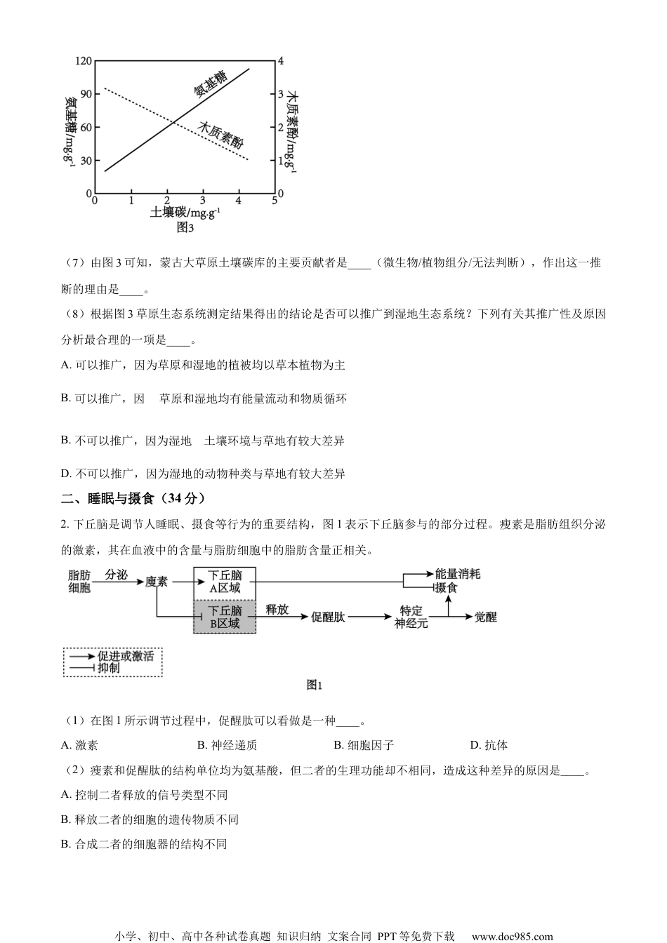小学、初中、高中各种试卷真题知识归纳文案合同PPT等免费下载www.doc985.com静安区2065-2024学年第二学期期中教学质量调研高中生物学试卷2024.04考生须知:1.答题前,请将你的姓名及准考证号认真填、涂在试卷和答题纸上。2.本试卷共8页,满分为100分。考试时间为60分钟。3.所有答案必须涂(单选题、多选题、编号选填题)或写在答题纸的相应位置上。一、土壤碳库(22分)1.“碳中和”指BO2的产生和吸收实现抵消,达到相对“零排放”。节能减排、碳封存等都是实现碳中和的重要手段。碳封存就是把大气中的BO2存储在自然界的一些碳储库(如土壤碳库)中。图1表示某生态系统,“地上”为几种主要生物组成的食物网,“地下”为土壤碳库的部分来源。枯枝落叶等植物组分经土壤动物、微生物分解后的残余碳也会在土壤中积累下来。(1)图1所示生态系统中,狼属于____。(编号选填)①生产者②消费者③分解者④第一营养级⑤第二营养级⑥第三营养级(2)如果该生态系统遭遇干旱,可能会导致兔的种群数量____(增加/减少);如果该生态系统遭遇大火,而后又逐渐恢复,该过程属于____(初生/次生)演替。(3)在图1所示生态系统中,狮的种群数量很少,可能的原因是____。A.能量在沿营养级单向流动中逐级递减B.物质在生物群落与无机环境间不断循环B.在该生态系统中,狮处于最高营养级D.环境污染物通过食物链在生物体内富集(4)在草原生态系统中,鹿、兔等食草动物的奔跑速度很快,下列对此现象的分析合理的是____。A.为了避免被狮等动物捕食,鹿、兔等动物定点突变出了快速奔跑基因B.为了获得充足的食物,鹿、兔等需要不断练习奔跑,增强了奔跑能力小学、初中、高中各种试卷真题知识归纳文案合同PPT等免费下载www.doc985.comB.奔跑速度快的鹿、兔不易被狮等动物捕食,更容易在生存斗争中存活D.奔跑速度慢的鹿、兔繁殖能力弱,没有生存斗争,奔跑能力得不到发展(5)根据图1,选择适当的编号,补全该生态系统碳循环示意图。①树、草②鹿、兔、狼、狮③土壤动物、微生物④光合作用⑤呼吸作用⑥富集作用⑦化石燃料燃⑧土壤碳库(1)____(2)____(3)____(4)____(5)____(6)____(7)____(8)____(6)研究发现木质素(主要存在于树干等木质部)会影响植物组分的降解速率(如图2所示),由图可知木质素会____(加快/减慢)植物组分的降解速率,从而____(增加/减少)土壤碳库的积累。由于土壤微生物能降解植物组分,由此推测土壤微生物不利于土壤碳库积累;但也有人认为土壤微生物在降解植物组分过程中大量繁殖,其残体与矿物结合,可在土壤中长期贮存,有利于土壤碳库积累。为此,科学家在蒙古大草原进行了测定,得到了图3所示的结果。其中,氨基糖是微生物残体的标志物,木质素酚是植物组分的标志物。小学、初中、高中各种试卷真题知识归纳文案合同PPT等免费下载www.doc985.com(7)由图3可知,蒙古大草原土壤碳库的主要贡献者是____(微生物/植物组分/无法判断),作出这一推断的理由是____。(8)根据图3草原生态系统测定结果得出的结论是否可以推广到湿地生态系统?下列有关其推广性及原因分析最合理的一项是____。A.可以推广,因为草原和湿地的植被均以草本植物为主B.可以推广,因为草原和湿地均有能量流动和物质循环B.不可以推广,因为湿地的土壤环境与草地有较大差异D.不可以推广,因为湿地的动物种类与草地有较大差异二、睡眠与摄食(34分)2.下丘脑是调节人睡眠、摄食等行为的重要结构,图1表示下丘脑参与的部分过程。瘦素是脂肪组织分泌的激素,其在血液中的含量与脂肪细胞中的脂肪含量正相关。(1)在图1所示调节过程中,促醒肽可以看做是一种____。A.激素B.神经递质B.细胞因子D.抗体(2)瘦素和促醒肽的结构单位均为氨基酸,但二者的生理功能却不相同,造成这种差异的原因是____。A.控制二者释放的信号类型不同B.释放二者的细胞的遗传物质不同B.合成二者的细胞器的结构不同小学、初中、高中各种试卷真题知识归纳文案合同PPT等免费下载www.doc985.comD.构成二者的氨基酸的序列不同(3)我们常有这样的体验:吃饱后不再有摄食欲望且容易犯困。请结合题干和已学知识做出解释:__...