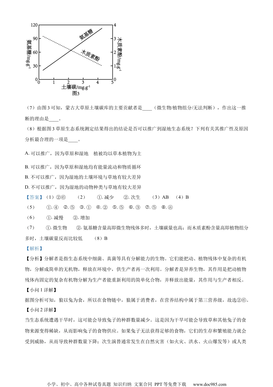 小学、初中、高中各种试卷真题知识归纳文案合同PPT等免费下载www.doc985.com静安区2065-2024学年第二学期期中教学质量调研高中生物学试卷2024.04考生须知:1.答题前,请将你的姓名及准考证号认真填、涂在试卷和答题纸上。2.本试卷共8页,满分为100分。考试时间为60分钟。3.所有答案必须涂(单选题、多选题、编号选填题)或写在答题纸的相应位置上。一、土壤碳库(22分)1.“碳中和”指BO2的产生和吸收实现抵消,达到相对“零排放”。节能减排、碳封存等都是实现碳中和的重要手段。碳封存就是把大气中的BO2存储在自然界的一些碳储库(如土壤碳库)中。图1表示某生态系统,“地上”为几种主要生物组成的食物网,“地下”为土壤碳库的部分来源。枯枝落叶等植物组分经土壤动物、微生物分解后的残余碳也会在土壤中积累下来。(1)图1所示生态系统中,狼属于____。(编号选填)①生产者②消费者③分解者④第一营养级⑤第二营养级⑥第三营养级(2)如果该生态系统遭遇干旱,可能会导致兔的种群数量____(增加/减少);如果该生态系统遭遇大火,而后又逐渐恢复,该过程属于____(初生/次生)演替。(3)在图1所示生态系统中,狮的种群数量很少,可能的原因是____。A.能量在沿营养级单向流动中逐级递减B.物质在生物群落与无机环境间不断循环B.在该生态系统中,狮处于最高营养级D.环境污染物通过食物链在生物体内富集(4)在草原生态系统中,鹿、兔等食草动物的奔跑速度很快,下列对此现象的分析合理的是____。A.为了避免被狮等动物捕食,鹿、兔等动物定点突变出了快速奔跑基因小学、初中、高中各种试卷真题知识归纳文案合同PPT等免费下载www.doc985.comB.为了获得充足的食物,鹿、兔等需要不断练习奔跑,增强了奔跑能力B.奔跑速度快的鹿、兔不易被狮等动物捕食,更容易在生存斗争中存活D.奔跑速度慢的鹿、兔繁殖能力弱,没有生存斗争,奔跑能力得不到发展(5)根据图1,选择适当的编号,补全该生态系统碳循环示意图。①树、草②鹿、兔、狼、狮③土壤动物、微生物④光合作用⑤呼吸作用⑥富集作用⑦化石燃料燃⑧土壤碳库(1)____(2)____(3)____(4)____(5)____(6)____(7)____(8)____(6)研究发现木质素(主要存在于树干等木质部)会影响植物组分的降解速率(如图2所示),由图可知木质素会____(加快/减慢)植物组分的降解速率,从而____(增加/减少)土壤碳库的积累。由于土壤微生物能降解植物组分,由此推测土壤微生物不利于土壤碳库积累;但也有人认为土壤微生物在降解植物组分过程中大量繁殖,其残体与矿物结合,可在土壤中长期贮存,有利于土壤碳库积累。为此,科学家在蒙古大草原进行了测定,得到了图3所示的结果。其中,氨基糖是微生物残体的标志物,木质素酚是植物组分的标志物。小学、初中、高中各种试卷真题知识归纳文案合同PPT等免费下载www.doc985.com(7)由图3可知,蒙古大草原土壤碳库的主要贡献者是____(微生物/植物组分/无法判断),作出这一推断的理由是____。(8)根据图3草原生态系统测定结果得出的结论是否可以推广到湿地生态系统?下列有关其推广性及原因分析最合理的一项是____。A.可以推广,因为草原和湿地的植被均以草本植物为主B.可以推广,因为草原和湿地均有能量流动和物质循环B.不可以推广,因为湿地的土壤环境与草地有较大差异D.不可以推广,因为湿地的动物种类与草地有较大差异【答案】(1)②⑥(2)①.减少②.次生(3)AB(4)B(5)①.④.②⑤.③①.④②.⑤⑤.⑥③.⑦⑤.⑧⑧(6)①.减慢②.增加(7)①.微生物②.氨基糖含量高即微生物残体多时,土壤碳量也高;而木质素酚含量高即植物组分多时,土壤碳量反而比较低(8)B【解析】【分析】分解者是指生态系统中细菌、真菌等具有分解能力的生物。它们能把动、植物残体中复杂的有机物,分解成简单的无机物,释放在环境中,供生产者再一次利用。分解者是异养生物,其作用是把动植物残体内固定的复杂有机物分解为生产者能重新利用的简单化合物,并释放出能量,其作用与生产者相反。【小问1详解】据图分析可知,狼以兔为食,所以在食物链中,狼属于消费者,在营养结构中属于第三营养级,故选...