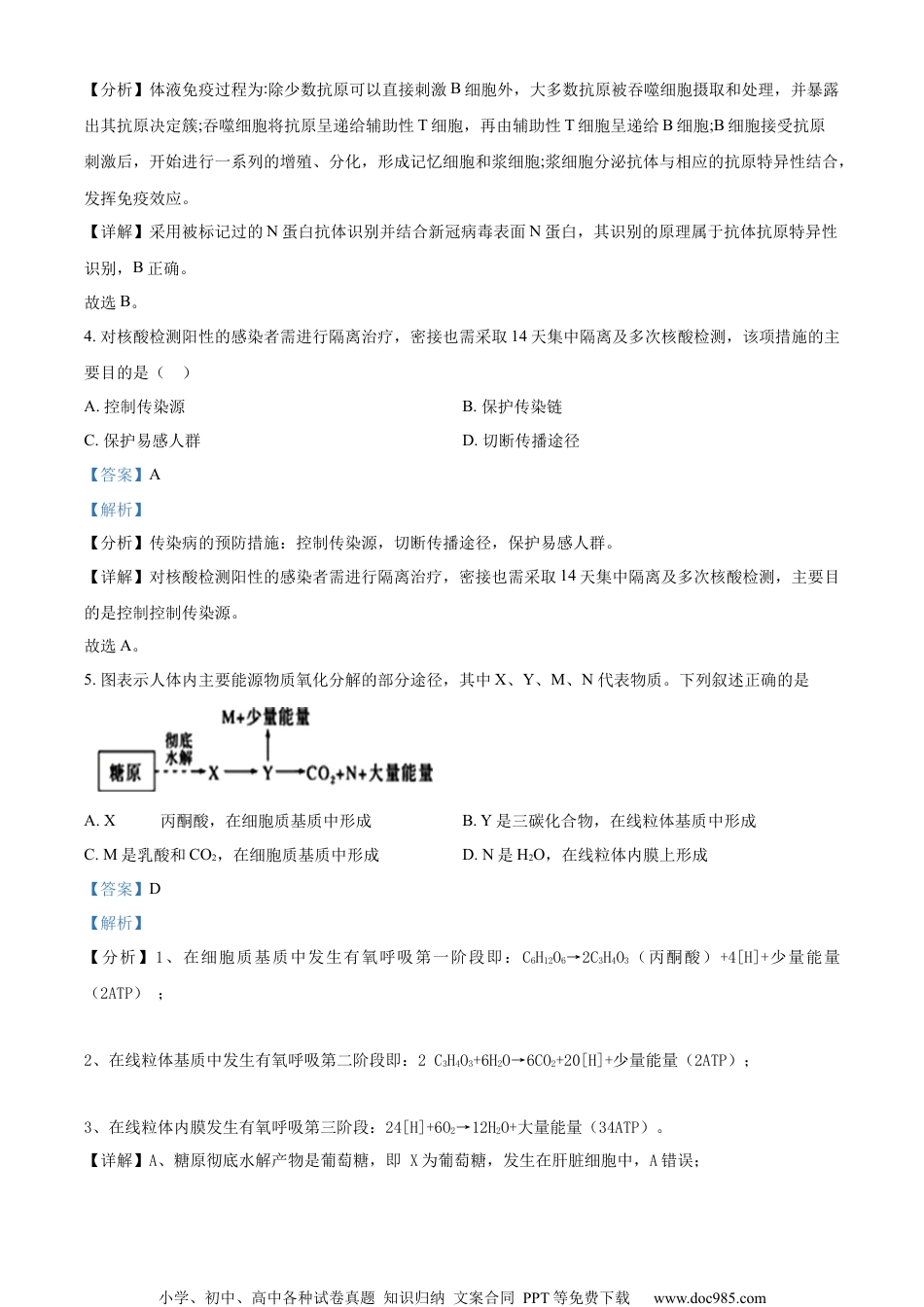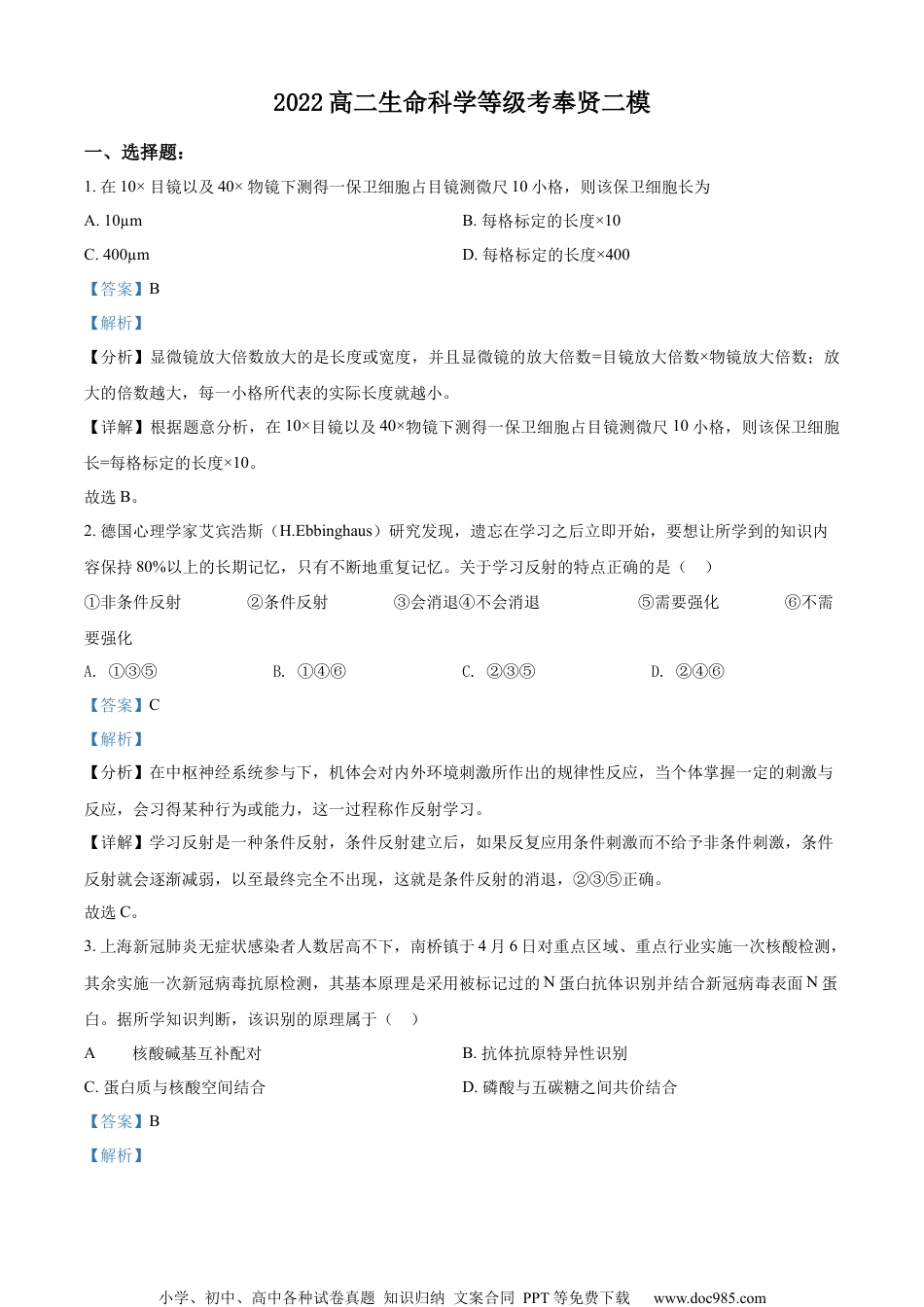 小学、初中、高中各种试卷真题知识归纳文案合同PPT等免费下载www.doc985.com2022高二生命科学等级考奉贤二模一、选择题:1.在10×目镜以及40×物镜下测得一保卫细胞占目镜测微尺10小格,则该保卫细胞长为A.10µmB.每格标定的长度×10C.400µmD.每格标定的长度×400【答案】B【解析】【分析】显微镜放大倍数放大的是长度或宽度,并且显微镜的放大倍数=目镜放大倍数×物镜放大倍数;放大的倍数越大,每一小格所代表的实际长度就越小。【详解】根据题意分析,在10×目镜以及40×物镜下测得一保卫细胞占目镜测微尺10小格,则该保卫细胞长=每格标定的长度×10。故选B。2.德国心理学家艾宾浩斯(H.Ebbinghaus)研究发现,遗忘在学习之后立即开始,要想让所学到的知识内容保持80%以上的长期记忆,只有不断地重复记忆。关于学习反射的特点正确的是()①非条件反射②条件反射③会消退④不会消退⑤需要强化⑥不需要强化A.①③⑤B.①④⑥C.②③⑤D.②④⑥【答案】C【解析】【分析】在中枢神经系统参与下,机体会对内外环境刺激所作出的规律性反应,当个体掌握一定的刺激与反应,会习得某种行为或能力,这一过程称作反射学习。【详解】学习反射是一种条件反射,条件反射建立后,如果反复应用条件刺激而不给予非条件刺激,条件反射就会逐渐减弱,以至最终完全不出现,这就是条件反射的消退,②③⑤正确。故选C。3.上海新冠肺炎无症状感染者人数居高不下,南桥镇于4月6日对重点区域、重点行业实施一次核酸检测,其余实施一次新冠病毒抗原检测,其基本原理是采用被标记过的N蛋白抗体识别并结合新冠病毒表面N蛋白。据所学知识判断,该识别的原理属于()A.核酸碱基互补配对B.抗体抗原特异性识别C.蛋白质与核酸空间结合D.磷酸与五碳糖之间共价结合【答案】B【解析】小学、初中、高中各种试卷真题知识归纳文案合同PPT等免费下载www.doc985.com【分析】体液免疫过程为:除少数抗原可以直接刺激B细胞外,大多数抗原被吞噬细胞摄取和处理,并暴露出其抗原决定簇;吞噬细胞将抗原呈递给辅助性T细胞,再由辅助性T细胞呈递给B细胞;B细胞接受抗原刺激后,开始进行一系列的增殖、分化,形成记忆细胞和浆细胞;浆细胞分泌抗体与相应的抗原特异性结合,发挥免疫效应。【详解】采用被标记过的N蛋白抗体识别并结合新冠病毒表面N蛋白,其识别的原理属于抗体抗原特异性识别,B正确。故选B。4.对核酸检测阳性的感染者需进行隔离治疗,密接也需采取14天集中隔离及多次核酸检测,该项措施的主要目的是()A.控制传染源B.保护传染链C.保护易感人群D.切断传播途径【答案】A【解析】【分析】传染病的预防措施:控制传染源,切断传播途径,保护易感人群。【详解】对核酸检测阳性的感染者需进行隔离治疗,密接也需采取14天集中隔离及多次核酸检测,主要目的是控制控制传染源。故选A。5.图表示人体内主要能源物质氧化分解的部分途径,其中X、Y、M、N代表物质。下列叙述正确的是A.X是丙酮酸,在细胞质基质中形成B.Y是三碳化合物,在线粒体基质中形成C.M是乳酸和CO2,在细胞质基质中形成D.N是H2O,在线粒体内膜上形成【答案】D【解析】【分析】1、在细胞质基质中发生有氧呼吸第一阶段即:C6H12O6→2C3H4O3(丙酮酸)+4[H]+少量能量(2ATP);2、在线粒体基质中发生有氧呼吸第二阶段即:2C3H4O3+6H2O→6CO2+20[H]+少量能量(2ATP);3、在线粒体内膜发生有氧呼吸第三阶段:24[H]+6O2→12H2O+大量能量(34ATP)。【详解】A、糖原彻底水解产物是葡萄糖,即X为葡萄糖,发生在肝脏细胞中,A错误;小学、初中、高中各种试卷真题知识归纳文案合同PPT等免费下载www.doc985.comB、X→Y过程为细胞呼吸的第一阶段,发生在细胞质基质中,Y最可能是丙酮酸,B错误;C、根据图示最终有CO2生成,该总过程只能表示有氧呼吸,M不能为无氧呼吸产生的乳酸,C错误;D、N是有氧呼吸第三阶段产生的水,在线粒体内膜上形成,D正确。故选D。6.下列所述生产与生活中的做法,合理的是()A.做面包时加入酵母菌并维持密闭状态B.水稻田适时排水晒田以保证根系通气C.白天定时给栽培大棚通风以保证氧气供应D.用不透气的消毒材料包扎伤口以避免感染【答案】B【解析...