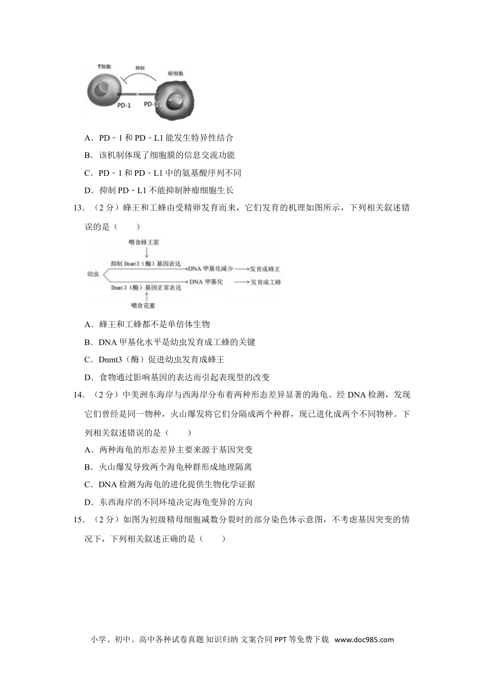 2021年上海市浦东新区高考生物二模试卷一、选择题(共40分,每小题2分。每小题只有一个正确答案)1.(2分)好奇心能促进人们不断探索不断进取,生命科学的探究过程起始于()A.提出疑问B.设计实验C.实施实验D.得出结论2.(2分)小萌同学养了一株绿萝,一段时间后,发现叶脉缺绿,叶片变黄。解决这个问题,需给绿萝补充的元素是()A.钾B.铁C.镁D.钠3.(2分)生物体的细胞内外均是以水为基础的液体环境,下列说法与此现象无关的是()A.水是生物体含量最多的化合物B.水具有物质运输的作用C.水是生物体重要的能源物质D.水是绝大多数生化反应的介质4.(2分)核黄素是人体不可缺少的微量小分子有机化合物,参与细胞氧化反应。据此分析可知核黄素属于()A.蛋白质B.糖原C.脂肪D.维生素5.(2分)新型冠状病毒是引起新冠肺炎的病原体,属于RNA病毒。下列关于新型冠状病毒的叙述正确的是()A.有细胞结构B.能在通用培养基上生长C.遗传物质是RNAD.能在宿主细胞外增殖6.(2分)如图是肽链通过加工形成特定空间结构的过程,该过程发生在()A.细胞核B.内质网C.溶酶体D.细胞质基质7.(2分)如图是洋葱鳞叶外表皮细胞在30%蔗糖溶液中的状态,下列能让它最快复原的试剂是()小学、初中、高中各种试卷真题知识归纳文案合同PPT等免费下载www.doc985.comA.清水B.10%的蔗糖溶液C.30%的蔗糖溶液D.40%的蔗糖溶液8.(2分)课堂上,听到老师点名后学生立刻站起来,完成该动作所需的结构基础和反射类型分别是()A.反射弧;非条件反射B.反射弧;条件反射C.脊髓;条件反射D.大脑;非条件反射9.(2分)多肉植物鸡冠掌通常利用落叶上长出的不定芽繁殖,这种繁殖类型是()A.出芽生殖B.营养繁殖C.分裂生殖D.有性生殖10.(2分)人体长期吸入高浓度PM2.5会损害人体呼吸道黏膜,从而会影响人体的()A.体液免疫B.细胞免疫C.特异性免疫D.非特异性免疫11.(2分)ATP合成酶像一个“微型水电站”,其工作原理如图所示,下列相关叙述错误的是()A.ATP合成酶有运输和催化功能B.H+的跨膜方式是主动运输C.线粒体内膜上ATP合成酶的数量较多D.合成ATP的能量来源于膜内外的H+浓度差12.(2分)如图表示肿瘤细胞逃逸T细胞免疫的机制,下列相关叙述错误的是()小学、初中、高中各种试卷真题知识归纳文案合同PPT等免费下载www.doc985.comA.PD﹣1和PD﹣L1能发生特异性结合B.该机制体现了细胞膜的信息交流功能C.PD﹣1和PD﹣L1中的氨基酸序列不同D.抑制PD﹣L1不能抑制肿瘤细胞生长13.(2分)蜂王和工蜂由受精卵发育而来,它们发育的机理如图所示,下列相关叙述错误的是()A.蜂王和工蜂都不是单倍体生物B.DNA甲基化水平是幼虫发育成工蜂的关键C.Dnmt3(酶)促进幼虫发育成蜂王D.食物通过影响基因的表达而引起表现型的改变14.(2分)中美洲东海岸与西海岸分布着两种形态差异显著的海龟。经DNA检测,发现它们曾经是同一物种,火山爆发将它们分隔成两个种群,现已进化成两个不同物种。下列相关叙述错误的是()A.两种海龟的形态差异主要来源于基因突变B.火山爆发导致两个海龟种群形成地理隔离C.DNA检测为海龟的进化提供生物化学证据D.东西海岸的不同环境决定海龟变异的方向15.(2分)如图为初级精母细胞减数分裂时的部分染色体示意图,不考虑基因突变的情况下,下列相关叙述正确的是()小学、初中、高中各种试卷真题知识归纳文案合同PPT等免费下载www.doc985.comA.图中有2对同源染色体B.图中1和2的遗传信息不同C.3和4在形成次级精母细胞时分开D.A﹣b之间遵循连锁交换定律16.(2分)将燕麦胚芽鞘尖端套上一个不透光的锡纸小帽,然后在暗室中从左侧光照,胚芽鞘将()A.向左弯曲B.不弯曲C.向右弯曲D.无规律弯曲17.(2分)若在固体培养基上用稀释涂布法培养细菌,看到的结果不可能是()A.B.C.D.18.(2分)垂体不仅能产生生长激素和催乳激素,也能调节和控制其他内分泌腺的活动。幼年哺乳动物的垂体损伤会引起()①水盐调节紊乱②体温调节紊乱③生长发育停止④性腺发育停止⑤体液免疫能力下降A.①③④B.①②⑤C.①②③④D.②③④⑤19.(...