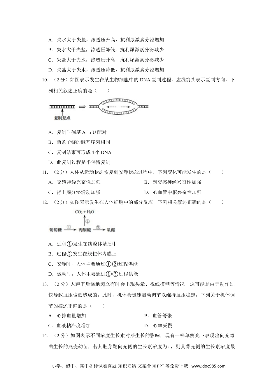 2021年上海市静安区高考生物二模试卷一、选择题(共40分,每小题2分,每小题只有一个正确答案)1.(2分)颤藻和水绵都具有的结构和成分包括()①细胞膜②核膜③核糖体④叶绿体⑤DNAA.①②③B.①②④C.①③⑤D.③④⑤2.(2分)某同学用图所示的形式对生物体内的常见糖类进行分类,下列各项中的糖与图中的①、②、③处对应正确的是()A.①乳糖、②淀粉、③蔗糖B.①乳糖、②糖原、③纤维素C.①淀粉、②葡萄糖、③蔗糖D.①糖原、②葡萄糖、③纤维素3.(2分)科学家用显微技术除去变形虫的细胞核,发现其新陈代谢减弱、运动停止;当重新植入细胞核后,发现其代谢等活动又恢复,这说明细胞核是()A.细胞遗传特性的控制中心B.细胞代谢的主要场所C.细胞生命活动的控制中心D.遗传物质的储存场所4.(2分)用蚕豆叶下表皮永久装片完成“细胞的观察和测量”实验,下列关于实验操作和实验结果的叙述正确的是()A.高倍镜下的测量结果比低倍镜下的大B.目镜测微尺随目镜转动而转动C.高倍镜下的测量结果比低倍镜下的小D.目镜测微尺随装片移动而移动5.(2分)某同学用如图所示的装置探究酶的特性,下列相关叙述错误的是()小学、初中、高中各种试卷真题知识归纳文案合同PPT等免费下载www.doc985.comA.滤纸片的数量可表示过氧化氢酶的量B.滤纸片相互重叠会影响实验的准确性C.可用产生气泡的速率表示反应速率D.需要将该装置置于适宜光照条件下6.(2分)果蝇体细胞有8条染色体,在细胞周期中,单个细胞中的DNA分子数量始终为8的时期为()A.G1期B.S期C.G2期D.M期7.(2分)如图表示ATP的结构,下列相关叙述正确的是()A.A表示腺苷,由腺嘌呤和脱氧核糖组成B.~表示高能磷酸键,因能量高而很稳定C.光合作用过程中涉及①的断裂和形成D.光合作用过程中涉及②的断裂和形成8.(2分)某同学对四个地区进行物种多样性调查,获得了下列结果,推测辛普森指数最大的是()A.B.C.D.9.(2分)人在剧烈运动时往往大量出汗,此时人体()小学、初中、高中各种试卷真题知识归纳文案合同PPT等免费下载www.doc985.comA.失水大于失盐,渗透压升高,抗利尿激素分泌增加B.失水大于失盐,渗透压降低,抗利尿激素分泌减少C.失盐大于失水,渗透压升高,抗利尿激素分泌减少D.失盐大于失水,渗透压降低,抗利尿激素分泌增加10.(2分)如图表示发生在某生物细胞中的DNA复制过程,虚线箭头表示复制方向,下列相关叙述正确的是()A.复制时碱基A与U配对B.两条子链的碱基序列相同C.复制结束可形成4个DNAD.此复制过程是半保留复制11.(2分)人体从运动状态恢复到安静状态过程中,下列变化可能发生的是()A.交感神经兴奋性加强B.副交感神经兴奋性加强C.肾上腺分泌活动加强D.心血管中枢兴奋性加强12.(2分)如图表示发生在人体细胞中的部分反应,下列相关叙述正确的是()A.过程①发生在线粒体基质中B.过程②发生在线粒体内膜上C.安静时,人体主要通过①②过程供能D.运动时,人体主要通过①③过程供能13.(2分)人蹲下后猛地起立有时会出现头晕、视线模糊等情况,这可能是由于动作过快导致血压偏低造成的,此时,机体会迅速启动调节以维持血压稳定,下列关于机体调节的描述正确的是()A.心排血量增加B.血管舒张C.血液粘滞度增加D.心率减慢14.(2分)如图表示不同浓度生长素对芽生长的影响,现有一株单侧光下表现出向光弯曲生长的燕麦幼苗,若其胚芽鞘向光侧的生长素浓度为a,则其背光侧的生长素浓度最小学、初中、高中各种试卷真题知识归纳文案合同PPT等免费下载www.doc985.com可能为()A.aB.bC.cD.d15.(2分)斑姬鹟与白领姬鹟的分布区域存在部分重叠,发现两者能杂交产生后代,但杂交后代由于声带结构改变而无法吸引其他异性交配。这说明斑姬鹟与白领姬鹟()A.存在地理隔离B.存在生殖隔离C.为一个种群D.为一个物种16.(2分)实验室有一瓶标签部分缺失的细菌培养基粉末,按标签(如图)中的“用法”配制的培养基()A.属于液体培养基B.属于通用培养基C.可鉴定大肠杆菌D.可分离自生固氮菌17.(2分)研究发现,在特殊条件下,成年小鼠的肌肉干...