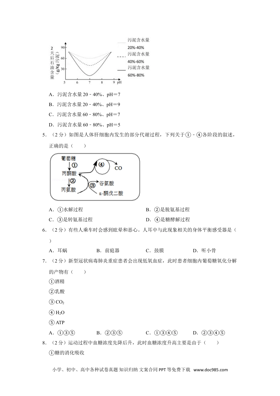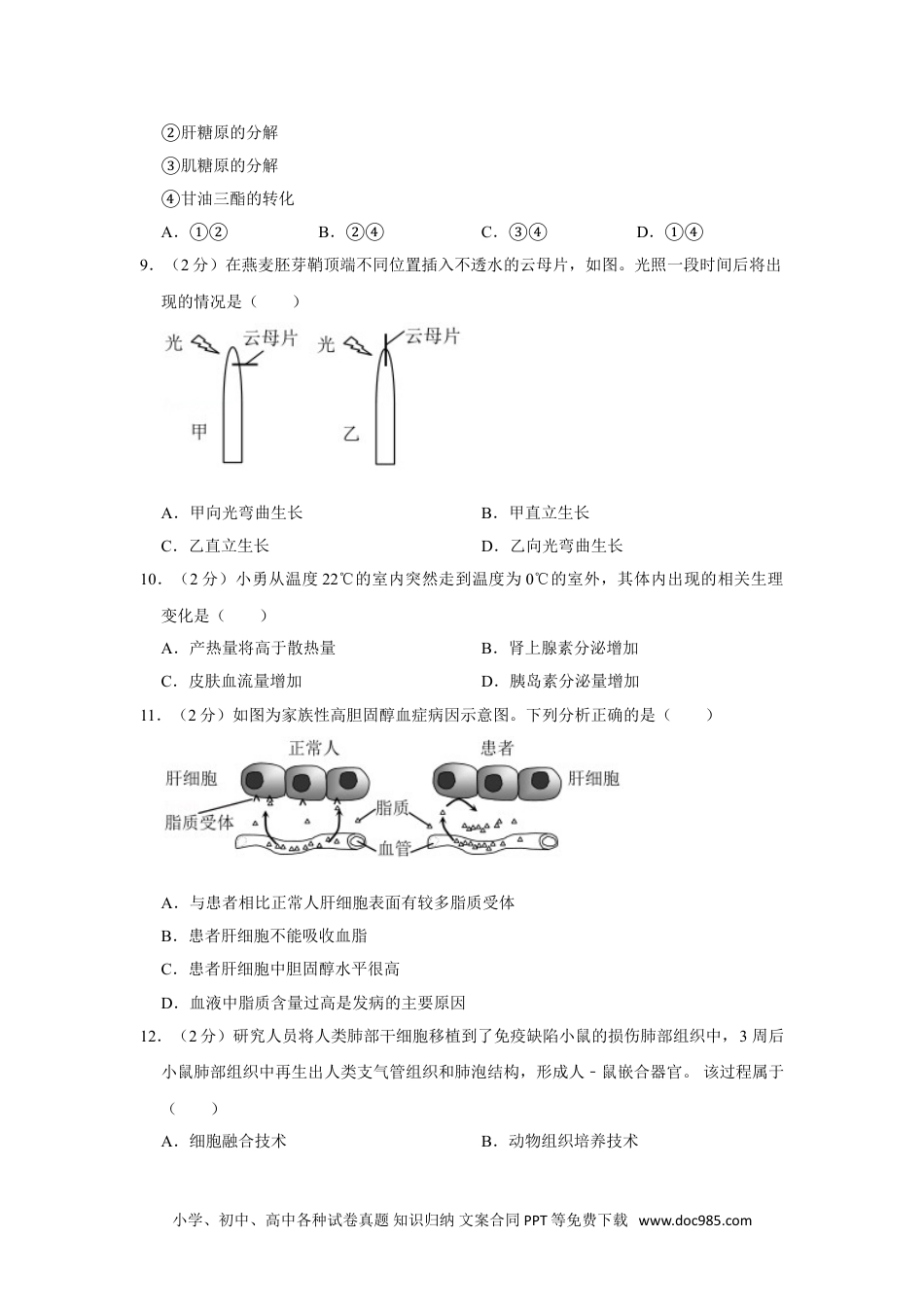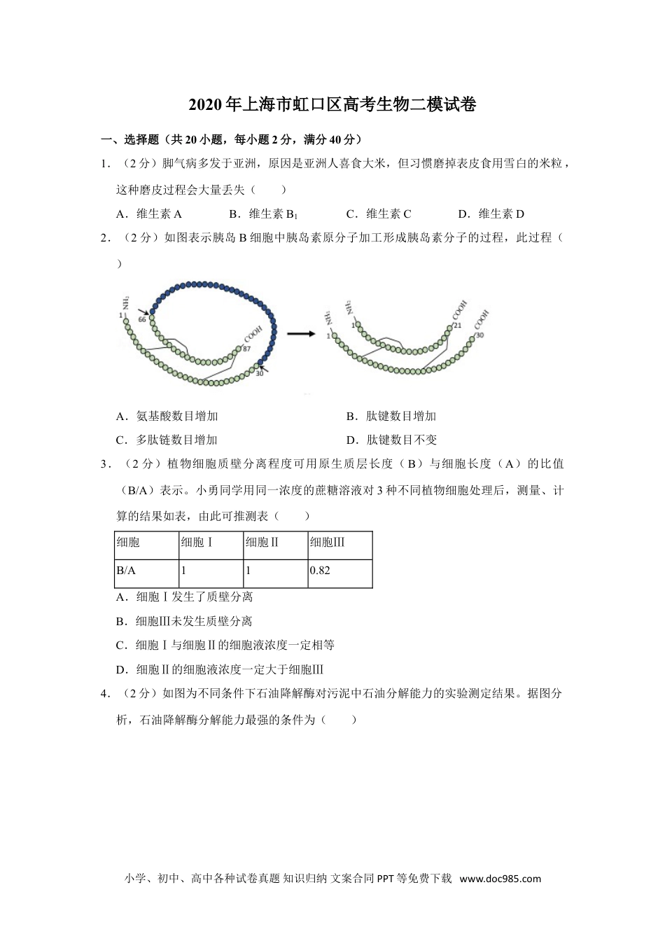 2020年上海市虹口区高考生物二模试卷一、选择题(共20小题,每小题2分,满分40分)1.(2分)脚气病多发于亚洲,原因是亚洲人喜食大米,但习惯磨掉表皮食用雪白的米粒,这种磨皮过程会大量丢失()A.维生素AB.维生素B1C.维生素CD.维生素D2.(2分)如图表示胰岛B细胞中胰岛素原分子加工形成胰岛素分子的过程,此过程()A.氨基酸数目增加B.肽键数目增加C.多肽链数目增加D.肽键数目不变3.(2分)植物细胞质壁分离程度可用原生质层长度(B)与细胞长度(A)的比值(B/A)表示。小勇同学用同一浓度的蔗糖溶液对3种不同植物细胞处理后,测量、计算的结果如表,由此可推测表()细胞细胞Ⅰ细胞Ⅱ细胞ⅢB/A110.82A.细胞Ⅰ发生了质壁分离B.细胞Ⅲ未发生质壁分离C.细胞Ⅰ与细胞Ⅱ的细胞液浓度一定相等D.细胞Ⅱ的细胞液浓度一定大于细胞Ⅲ4.(2分)如图为不同条件下石油降解酶对污泥中石油分解能力的实验测定结果。据图分析,石油降解酶分解能力最强的条件为()小学、初中、高中各种试卷真题知识归纳文案合同PPT等免费下载www.doc985.comA.污泥含水量20﹣40%、pH=7B.污泥含水量20﹣40%、pH=9C.污泥含水量60﹣80%、pH=7D.污泥含水量60﹣80%、pH=55.(2分)如图是人体肝细胞内发生的部分代谢过程,下列关于①﹣④各阶段的叙述,正确的是()A.①水解过程B.②是脱氨基过程C.③是转氨基过程D.④是糖酵解过程6.(2分)有些人乘车时会感到眩晕和恶心。人耳中与此现象相关的身体平衡感受器是()A.耳蜗B.前庭器C.鼓膜D.听小骨7.(2分)新型冠状病毒肺炎重症患者会出现低氧血症,此时患者细胞内葡萄糖氧化分解的产物有()①酒精②乳酸③CO2④H2O⑤ATPA.①③⑤B.②③⑤C.①③④⑤D.②③④⑤8.(2分)运动过程中血糖浓度先降后升,此时血糖浓度升高主要是由于()①糖的消化吸收小学、初中、高中各种试卷真题知识归纳文案合同PPT等免费下载www.doc985.com②肝糖原的分解③肌糖原的分解④甘油三酯的转化A.①②B.②④C.③④D.①④9.(2分)在燕麦胚芽鞘顶端不同位置插入不透水的云母片,如图。光照一段时间后将出现的情况是()A.甲向光弯曲生长B.甲直立生长C.乙直立生长D.乙向光弯曲生长10.(2分)小勇从温度22℃的室内突然走到温度为0℃的室外,其体内出现的相关生理变化是()A.产热量将高于散热量B.肾上腺素分泌增加C.皮肤血流量增加D.胰岛素分泌量增加11.(2分)如图为家族性高胆固醇血症病因示意图。下列分析正确的是()A.与患者相比正常人肝细胞表面有较多脂质受体B.患者肝细胞不能吸收血脂C.患者肝细胞中胆固醇水平很高D.血液中脂质含量过高是发病的主要原因12.(2分)研究人员将人类肺部干细胞移植到了免疫缺陷小鼠的损伤肺部组织中,3周后小鼠肺部组织中再生出人类支气管组织和肺泡结构,形成人﹣鼠嵌合器官。该过程属于()A.细胞融合技术B.动物组织培养技术小学、初中、高中各种试卷真题知识归纳文案合同PPT等免费下载www.doc985.comC.细胞核移植技术D.干细胞技术13.(2分)关于人类微生物传染病流行的叙述,正确的是()A.有些微生物可随飞沫、灰尘等进入人体呼吸道B.切断传播途径的有效方法是隔离有症状的患者C.通过空气传播的传染病不会通过接触传播D.致病的细菌或病毒是微生物传染病的传染源14.(2分)用样方法对某地区的植物进行调查,将采集到的数据计算得到辛普森指数,该数值可以反映该地区()A.同一物种之间的遗传多样性B.物种分布均匀度C.生境的多样性D.生态系统多样性15.(2分)DNA分子的半保留复制过程如图所示,该过程中一定发生了()①碱基配对②解旋③脱氧核苷酸聚合④基因突变A.①②③B.②③④C.①③④D.①②④16.(2分)如图所示的细胞正处于()A.有丝分裂后期B.减数第一次分裂后期C.减数第二次分裂后期D.减数第二次分裂末期17.(2分)如图是一个红绿色盲遗传系谱,则该家族中()小学、初中、高中各种试卷真题知识归纳文案合同PPT等免费下载www.doc985.comA.Ⅰ﹣1和Ⅱ﹣2的基因型不一定相同B.Ⅰ﹣1将红绿色盲基因传给了Ⅱ﹣1和Ⅱ﹣2C.Ⅰ﹣2和Ⅱ﹣1的X染色体携带相同的基因D...