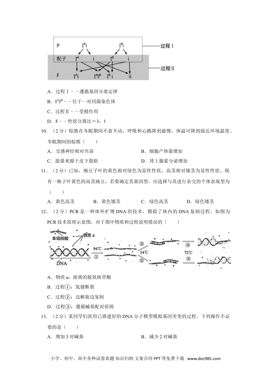 2020年上海市崇明区高考生物二模试卷一、选择题(共40分,每小题2分.每个小题只有一个正确答案)1.(2分)在蚕豆叶细胞的观察和测量实验中,若要提高测量的精确度,最佳的目镜和物镜的组合是()A.目镜10×;物镜10×B.目镜16×;物镜10×C.目镜10×;物镜40×D.目镜16×;物镜40×2.(2分)蛋白质测序技术需将大的蛋白质分子分解为多个短的多肽。这一过程中,蛋白质的结构发生的改变是()A.氨基酸的数目B.氨基酸的种类C.氨基酸的排列顺序D.多肽的空间结构3.(2分)“馕”为一种新疆特色面食。某校研究小组就“唾液淀粉酶对馕的消化作用”进行了探究实验,实验设计及现象如表。下列对表中数据分析不合理的是()试管编号123材料馕碎屑馕碎屑馕块37℃清水2mL,浸泡0mL2mL,浸泡唾液2mL2mL2mL加碘液后结果蓝色2min后退去蓝色5min后退去蓝色5min后退去A.2和3说明,咀嚼与否与淀粉的消化速率无关B.1和3说明,充分咀嚼利于淀粉的消化C.1和2说明,淀粉酶在37℃下活性较好D.1和2说明,水作为生化反应的介质利于加快反应4.(2分)当蓝细菌在高盐环境胁迫下,细胞开始快速合成并积累蔗糖,目的是()A.降低细胞内的渗透压B.防止水向细胞外渗透C.降低细胞外的盐浓度D.促进蔗糖向细胞外转运5.(2分)如图为ATP结构示意图。研究人员将用32P标记的磷酸注入活细胞,迅速分离细胞内的ATP,发现其末端的磷酸基团被32P标记,其余磷酸基较长时间后才被标记。该实验可以推测()小学、初中、高中各种试卷真题知识归纳文案合同PPT等免费下载www.doc985.comA.化学键2易断裂B.化学键1无法断裂C.ADP中的能量无法利用D.ATP合成需要能量6.(2分)果蝇唾液腺细胞适合作为观察染色体的良好材料的原因不包括()A.染色体巨大B.染色体上富有横纹C.染色体数目多D.细胞易获取7.(2分)如图为细胞周期示意图,箭头表示各时期走向。正确表示细胞分裂间期的是()A.b→aB.a→dC.c→bD.d→c8.(2分)实验中某病毒在相同基因型的小鼠之间传播和繁殖速度更快,导致的病情也更重,但它在不同基因型小鼠间传播速度和毒力并没有增加。由此得到启示,若要提高牲畜抗病能力,需()A.培育近亲繁殖品种B.提高遗传多样性C.提高物种多样性D.采用人工无性繁殖9.(2分)如图是某对血型为A型和B型的夫妇生出孩子的可能基因型的遗传图解。下列对于图示说明错误的是()小学、初中、高中各种试卷真题知识归纳文案合同PPT等免费下载www.doc985.comA.过程Ⅰ﹣﹣遵循基因分离定律B.IAIB﹣﹣位于一对同源染色体C.过程Ⅱ﹣﹣受精作用D.F﹣﹣性状分离比=3:110.(2分)棕熊在冬眠期间不食不动,呼吸和心跳降到最慢,体温可降到接近环境温度。冬眠期间的棕熊()A.交感神经相对兴奋B.细胞产热量增加C.能量来源于皮下脂肪D.肾上腺素分泌增加11.(2分)已知,豌豆子叶的黄色相对绿色为显性性状,高茎相对矮茎为显性性状。现有一株子叶黄色的高茎豌豆,若要确定其基因型,应选择与其进行杂交的个体表现型为()A.黄色高茎B.黄色矮茎C.绿色高茎D.绿色矮茎12.(2分)PCR是一种体外扩增DNA的技术,模拟了体内的DNA复制过程。如图为PCR技术原理示意图,对于图中物质和过程说明错误的()A.物质a:游离的脱氧核苷酸B.过程①:氢健断裂C.过程②:边解旋边复制D.过程③:遵循碱基配对原则13.(2分)某同学们欲用已搭建好的DNA分子模型模拟基因突变的过程。下列操作不必要的是()A.增加3对碱基B.减少2对碱基小学、初中、高中各种试卷真题知识归纳文案合同PPT等免费下载www.doc985.comC.改变1对碱基D.将所有碱基重新排序14.(2分)如图为“探究生长素类似物萘乙酸浓度对富贵竹插条生根的作用”实验中记录到的数据。其中虚线上方的点和下方的点分别说明了蔡乙酸的作用为()A.促进;两重性B.促进;抑制C.抑制;促进D.两重性;抑制15.(2分)新冠肺炎康复者捐献的血浆中含有抗体,可用于重症患者的治疗。研究者提出也可利用康复者血液中的记忆B细胞制备单克隆抗体,比血浆注射疗法更为有效。其依据在于()A.单克隆抗体特异性高B.记忆B细胞可无限增殖C.细胞融合技术更安全D...