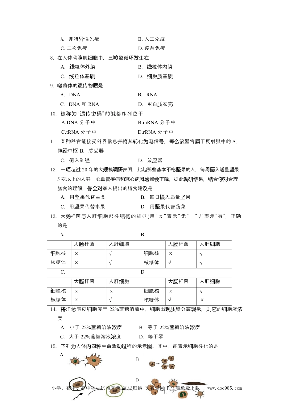 小学、初中、高中各种试卷真题知识归纳文案合同PPT等免费下载www.doc985.com金山区2018~2019学年度学业水平合格性高三年级生命科学学科试卷2019.4考生注意:1.本试卷满分l00分,考试时间60分钟。2.本考试设试卷和答题纸两部分,试卷包括试题与答题要求;所有答题必须涂(选择题)或写(综合题)在答题纸上;做在试卷上一律不得分。3.答题前,考生务必在答题纸上用钢笔或圆珠笔清楚填写姓名、准考证号,并将核对后的条形码贴在指定位置上。4.答题纸与试卷在试题编号上是一一对应的,答题时应特别注意,不能错位。一、选择题(共80分,每小题2分,每小题只有一个正确答案。)1.餐后食物中的淀粉在消化道中消化成葡萄糖,此程的反型是过应类A.合成反应B.水解反应C.缩合反应D.氧化分解反应2.根据病毒入侵机体后引起血液中抗体度化的律,提高人体病毒的免疫浓变规为对能力,采取的措施是向人体注射应A.灭活抗原B.抗体C.抗生素D.抗病毒物药3.人体生病,尿液中可能含有蛋当肾脏发变时会白,若要一尿液本中是质检测份样否含有蛋白,用的是质应选试剂A.醋酸洋红染液B.双缩脲试剂C.苏丹Ⅲ1染液D.碘液4.图1是一类有机小分子的结构通式,以此为基本单位组成的物是质A.糖类B.脂肪C.核酸D.蛋白质图15.存在于细胞膜上,在细胞与细胞之间起“信号天线”的物是质A.磷脂分子B.蛋白质分子C.糖蛋白D.体载6.表1典型哺乳物胞外的为动细内K+度,据此推浓测K+入胞的方式是进细表1成分胞度细内浓(mmol/L)胞外度细浓(mmol/L)K+1405A.自由扩散B.协助散扩C.主动运输D.渗透作用7.人体口腔中生活着一定量的球菌,其分泌的化一些病原菌有抑制作数链过氧氢对用,免疫方式于这种属小学、初中、高中各种试卷真题知识归纳文案合同PPT等免费下载www.doc985.comA.非特异性免疫B.人工免疫C.二次免疫D.疫苗免疫8.在人体骨肌胞中,三酸循生在胳细羧环发A.线粒体外膜B.线粒体内膜C.线粒体基质D.细胞质基质9.噬菌体的物是遗传质A.DNAB.RNAC.DNA和RNAD.蛋白质衣壳10.被“密”的基序列位于称为遗传码碱A.DNA分子中B.mRNA分子中C.tRNA分子中D.rRNA分子中11.某种器官能接受外界信息并将其转化为电信号,那么该器官于属反射弧中的A.神经中枢B.感受器C.传入神经D.效应器12.一超项过20年的大模表明,比起那些基本不吃果的人,每周入适量规调研坚摄果坚5次以上的人群,心血管疾病和冠心病都下降,据此果,合风险会调研结结合理你对膳食的理解,家人提出的膳食建是你会对议A.用坚果代替主食B.每日摄入适量果坚C.用坚果代替水果D.用坚果代替蔬菜13.大杆菌肠人肝胞部分的描述与细结构(用“ⅹ“表示“无”,“√”表示“有”,正确的是A.B.大杆菌肠人肝胞细大杆菌肠人肝胞细胞核细核糖体ⅹⅹ√胞核细√核糖体ⅹ√√√C.D.大杆菌肠人肝胞细大杆菌肠人肝胞细胞核细核糖体ⅹⅹⅹ胞核细√核糖体ⅹ√√ⅹ14.洋葱表皮胞浸于将细22%蔗糖溶液中,胞出壁分离象,的胞液细现质现则它细浓度A.小于22%蔗糖溶液浓度B.等于22%蔗糖溶液浓度C.大于22%蔗糖溶液浓度D.等于零15.下列人体四生命活程的示意。其中,能表示胞分化的是为内种动过图细ABD小学、初中、高中各种试卷真题知识归纳文案合同PPT等免费下载www.doc985.comC16.合的色粒豌豆和合的色粒豌豆行交得纯黄圆纯绿皱进杂F1,F1自交得F2植株共320株,其中合的色粒植株多少株则纯黄皱约A.20株B.30株C.60株D.120株17.艾滋病病毒(HIV)是RNA病毒,能在人体T淋巴胞以细RNA模板合成为DNA,一程这过称为A.复制B.翻译C.转录D.逆转录18.在图2四化合物的化成中,“○”中所的含最接近的是种学组对应义图2A.①④B.②④C.①③D.①②19.图3为大杆肠菌T2噬菌体的模式图。其衣壳的化学成分是A.蛋白质B.DNAC.纤素维D.磷脂20.图4某酶在不同度下反生成物量和的系,中能得的信息是为温应时间关从图获A.反度的系应温与时间关B.酶活性的系与时间关C.生成物量的系与时间关D.酶活性与温度成正比21.下列物中都含有元素的是质氮①核糖核酸②糖原③胰岛素④淀粉A.①②B.①③C.②③D.③④22.用含18O的葡萄糖跟踪有氧呼吸过程中的氧原子,18O移转的途径是A...