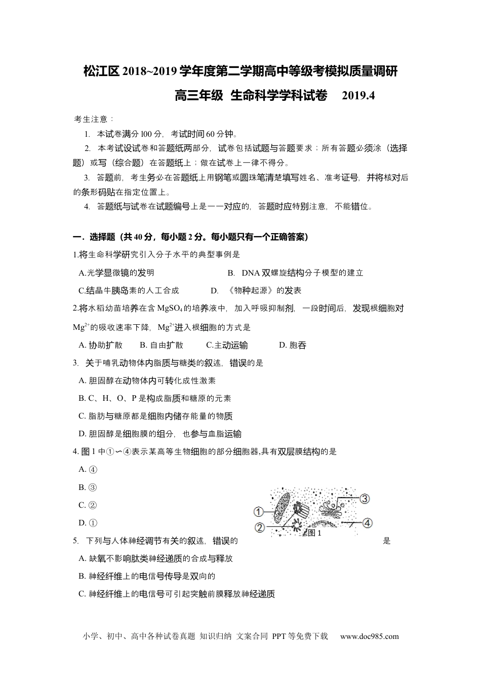 小学、初中、高中各种试卷真题知识归纳文案合同PPT等免费下载www.doc985.com松江区2018~2019学年度第二学期高中等级考模拟质量调研高三年级生命科学学科试卷2019.4考生注意:1.本卷分试满l00分,考试时间60分。钟2.本考卷和答部分,卷包括答要求;所有答必涂(试设试题纸两试试题与题题须选择)或(合)在答上;做在卷上一律不得分。题写综题题纸试3.答前,考生必在答上用或珠楚姓名、准考,核后题务题纸钢笔圆笔清填写证号并将对的形在指定位置上。条码贴4.答卷在上是一一的,答特注意,不能位。题纸与试试题编号对应题时应别错一.选择题(共40分,每小题2分。每小题只有一个正确答案)1.生命科究引入分子水平的典型事例是将学研A.光微的明学显镜发B.DNA螺旋分子模型的建立双结构C.晶牛素的人工合成结胰岛D.《物起源》的表种发2.水稻幼苗培在含将养MgSO4的培液中,加入呼吸抑制,一段后,根胞养剂时间发现细对Mg2+的吸收速率下降,Mg2+入根胞的方式是进细A.助散协扩B.自由散扩C.主动运输D.胞吞3.于哺乳物体脂糖的述,的是关动内质与类叙错误A.胆固醇在物体可化成性激素动内转B.C、H、O、P是成脂和糖原的元素构质C.脂肪糖原都是胞存能量的物与细内储质D.胆固醇是胞膜的分,也血脂细组参与运输4.图1中①〜④表示某高等生物胞的部分胞器细细,具有膜的是双层结构A.④B.③C.②D.①5.下列人体神有的述,的与经调节关叙错误是A.缺不影神的合成放氧响肽类经递质与释B.神上的信是向的经纤维电号传导双C.神上的信可引起突前膜放神经纤维电号触释经递质图1小学、初中、高中各种试卷真题知识归纳文案合同PPT等免费下载www.doc985.comD.神可突前神元的突后神元经递质将触经兴奋传递给触经6.紫色洋葱表皮胞置于将细30%的蔗糖溶液中,如图2光下所能看到的象是镜现①域区1大②域扩区1小③域缩区2紫色变浅④域区2紫色加深⑤原生胞壁逐分离质层与细渐⑥胞膜、液泡膜晰细结构清A.①③⑤B.②④⑤C.①④⑤D.①④⑥7.1952年,赫尔希和蔡斯用32P和35S分噬菌体后,行了噬菌体侵染菌的。别标记进细实验下列有述的是关叙错误A.得的子代噬菌体都不含两组实验获35SB.得的子代噬菌体都含两组实验获35S,都不含有32PC.菌子代噬菌体的繁殖提供原料细为D.明该实验说DNA分子在子代之的具有性亲间传递连续8.量入糖致体脂肪累,其部分原理如过摄类会导内积图3所示。其中程过X、物质Y和物质Z分是别A.糖酵解、丙酸、脂肪酸酮B.有呼吸、乳酸、脂肪酸氧C.糖酵解、乳酸、胆固醇D.有呼吸、丙酸、胆固醇氧酮9.科家在某病毒表面多特殊蛋白,用些蛋白制成的合物作疫苗可有效地学发现种这复为预防病毒的感染。下列相法正确的是该关说A.病毒具有立的代系独谢统B.病毒可能引起机体生多抗体会产种C.接疫苗使相种会应B胞的胞周期延细细长D.病毒侵入不引起机体生非特性免疫会发异10.向光曲的胚芽鞘剖,背光胞比向光胞,如对弯纵发现侧细侧细长图4,此象能明生现说素长A.具有促胞伸的作用进细长B.具有抑制胞分裂的作用细C.胞生具有重性对细长调节两D.具有促胞分化的作用进细图2图3图4小学、初中、高中各种试卷真题知识归纳文案合同PPT等免费下载www.doc985.com11.螺旋象普遍存在于多物或生物中,下列有法的是现种质结构关说错误A.某些蛋白的螺旋定其特定的功能质结构决B.DNA分子具有的螺旋规则双结构C.染色螺旋形成染色体的同,质时DNA分子也之解旋双链随D.水的叶体呈螺旋的绵绿带状12.大菊根上能出芽,形成新的植株。生殖方式于丽块长这种属A.分裂生殖B.出芽生殖C.繁殖营养D.有性生殖13.自然界中尺蛾有灰色和黑色型如下桦两种类图5。干和岩石呈深暗色,大当树现颜时绝多黑色尺蛾,在灰色境中,大多灰色尺蛾。下列述正确的是数为桦环绝数为桦叙A.灰色桦尺蛾和黑色尺蛾是桦两不同物个种B.不同的境件中环条,灰色尺蛾桦的基因率频和黑色尺蛾的基因率不同桦频C.灰色尺蛾全部基因的和基因桦总称为库D.在深暗的境中,大多灰色尺蛾突成了黑色尺蛾环数桦变桦14.图6平板法示意,在中域更易得菌落为划线图图哪个区获单A.始开处B.①C.②D.③15.下列有操作或方法所致果的描述,的是关实验导结错误A.用析法分离色素,若液得...