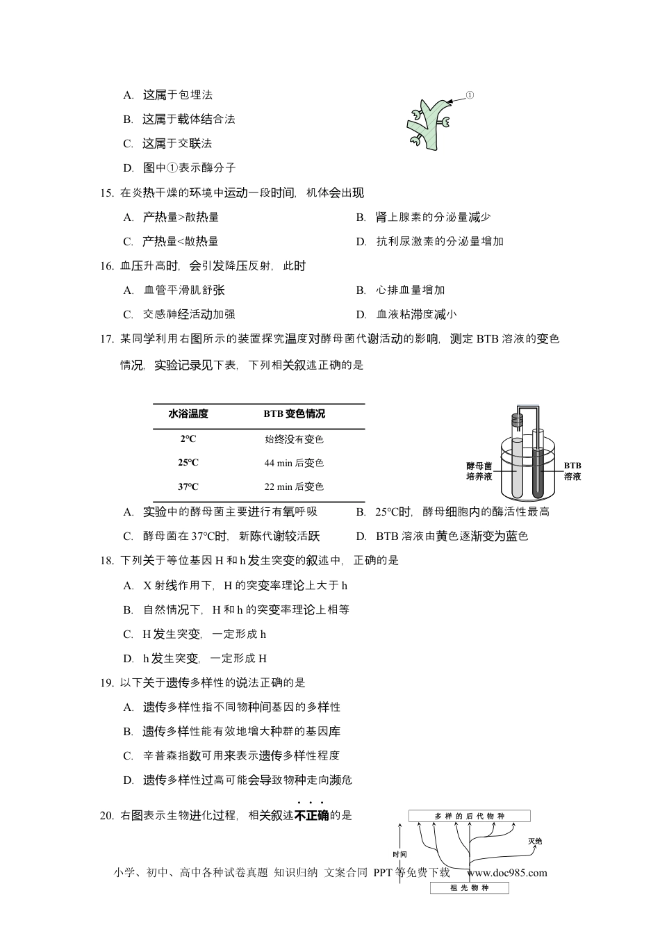 小学、初中、高中各种试卷真题知识归纳文案合同PPT等免费下载www.doc985.com静安区2018~2019学年度第二学期高中等级考模拟质量调研高三年级生命科学学科试卷2019.4考生注意:1.本试卷满分l00分,考试时间60分钟。2.本考试设试卷和答题纸两部分,试卷包括试题与答题要求;所有答题必须涂(选择题)或写(综合题)在答题纸上;做在试卷上一律不得分。3.答题前,考生务必在答题纸上用钢笔或圆珠笔清楚填写姓名、准考证号,并将核对后的条形码贴在指定位置上。4.答题纸与试卷在试题编号上是一一对应的,答题时应特别注意,不能错位。一、选择题(共40分,每小题2分。每小题只有一个正确答案)1.水稻收后,要充分才能入,做的目的是获晾晒库这样A.少水稻子中自由水的含量减种B.增强水稻子的呼吸作用强度种C.少水稻子中有机物的含量减种D.增强水稻子的光合作用强度种2.下列有成生物体部分物的系的描述中,正确的是关组质对应关A.素——植物体的能物纤维储质B.RNA——生物主要的物遗传质C.蛋白——生物主要的能源物质质D.磷脂——胞膜的成物细组质3.某同在微下量蚕豆叶下表皮保胞的度,下了以下象,其中正学显镜测卫细长时记录现确的是A.有的保胞中可察到染色体卫细观B.目,目微尺之转动镜镜测随转动C.有的保胞中可察到紫色液泡卫细观D.移装片,目微尺之移动镜测随动4.以下中,所有胞都具有的是结构细A.胞核细B.中心体C.胞壁细D.核糖体5.右表示蛋白代的部分程,以下述正确的是图质谢过叙A.程①于水解反过属应B.程①表示糖酵解程过过C.物质X表示丙酸酮D.物质X表示二化合物碳6.适接时种HPV(人乳瘤病毒)疫苗,能有效防癌,以下于头预宫颈关HPV疫苗的法说正确的是A.接种HPV疫苗于天然免疫属B.接的种HPV疫苗于抗体属C.HPV疫苗能引起特性免疫异D.天然HPV即可作为HPV疫苗YX①氨基酸蛋白质小学、初中、高中各种试卷真题知识归纳文案合同PPT等免费下载www.doc985.com7.某同酶的特性,分等量的化酶、淀粉酶、蒸水学为验证别将过氧氢馏与3mLH2O2混合,分定并别测O2生成量,推同是了酶的测该学为验证A.一性专B.高效性C.重性两D.多性样8.蛙在育程中,尾消失。象直接有的胞器主要是青变态发过会与这种现关细A.内质网B.高尔基体C.粒体线D.溶酶体9.以下于唾液淀粉酶的法正确的是关说A.基本位是葡萄糖结构单B.反色与双缩脲试剂应显蓝C.具有一定的空间结构D.班氏反色与试剂应显红黄10.下表示生在胞中的某程,据分析以下法正确的是图发细过图说A.Ⅰ到Ⅱ生了基因突从发变B.中圈图圆X代表核糖核酸苷C.Ⅰ到Ⅲ表示从DNA制程复过D.中圈图圆Y代表胸腺嘧啶11.如反射弧的局部示意,在图为图A点予适宜强度的刺给激,能到位化的是则检测电变A.①②B.①③C.②③D.①②③12.人体胞组织细内K+度高于液,明胞吸浓远组织说组织细收K+的方式为A.自由散扩B.助散协扩C.被动运输D.主动运输13.某究小探究研组A、B、C、D四抗生素某罕菌生和繁殖的抑制能力,种对种见细长设完成了抑菌,得到了如所示的果,以下法正确的是计实验图实验结说A.抗生素A菌的抑制能力最强对这种细B.抗生素B菌的抑制能力最强对这种细C.所用四抗生素的度各不相同实验种浓D.片滤纸E取自水作照应该蘸来为对14.如是一酶的固定化技,有描述正确的是图种术关A③②①IIIIIIGYXCGCTCGAGCTCGAGCTCTGACGAGCTCGAEDCBA小学、初中、高中各种试卷真题知识归纳文案合同PPT等免费下载www.doc985.comA.于包埋法这属B.于体合法这属载结C.于交法这属联D.中①表示酶分子图15.在炎干燥的境中一段,机体出热环运动时间会现A.量产热>散量热B.上腺素的分泌量少肾减C.量产热<散量热D.抗利尿激素的分泌量增加16.血升高,引降反射,此压时会发压时A.血管平滑肌舒张B.心排血量增加C.交感神活加强经动D.血液粘度小滞减17.某同利用右所示的装置探究度酵母菌代活的影,定学图温对谢动响测BTB溶液的色变情,下表,下列相述正确的是况实验记录见关叙水浴温度BTB变色情况2℃始有色终没变25℃44min后色变37℃22min后色变A.中的酵母菌主要行有呼吸实验进氧B.25℃,酵母胞的酶活性最高时细内C.酵母菌在37℃,新代活时陈谢...